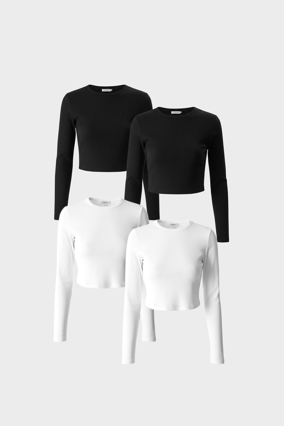 4lü Siyah Fildişi Kadın Maria Uzun Kollu Crop Tişört