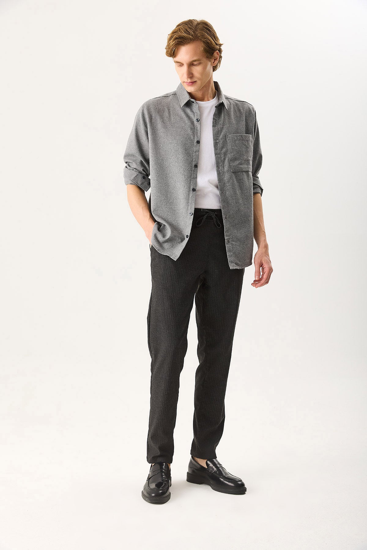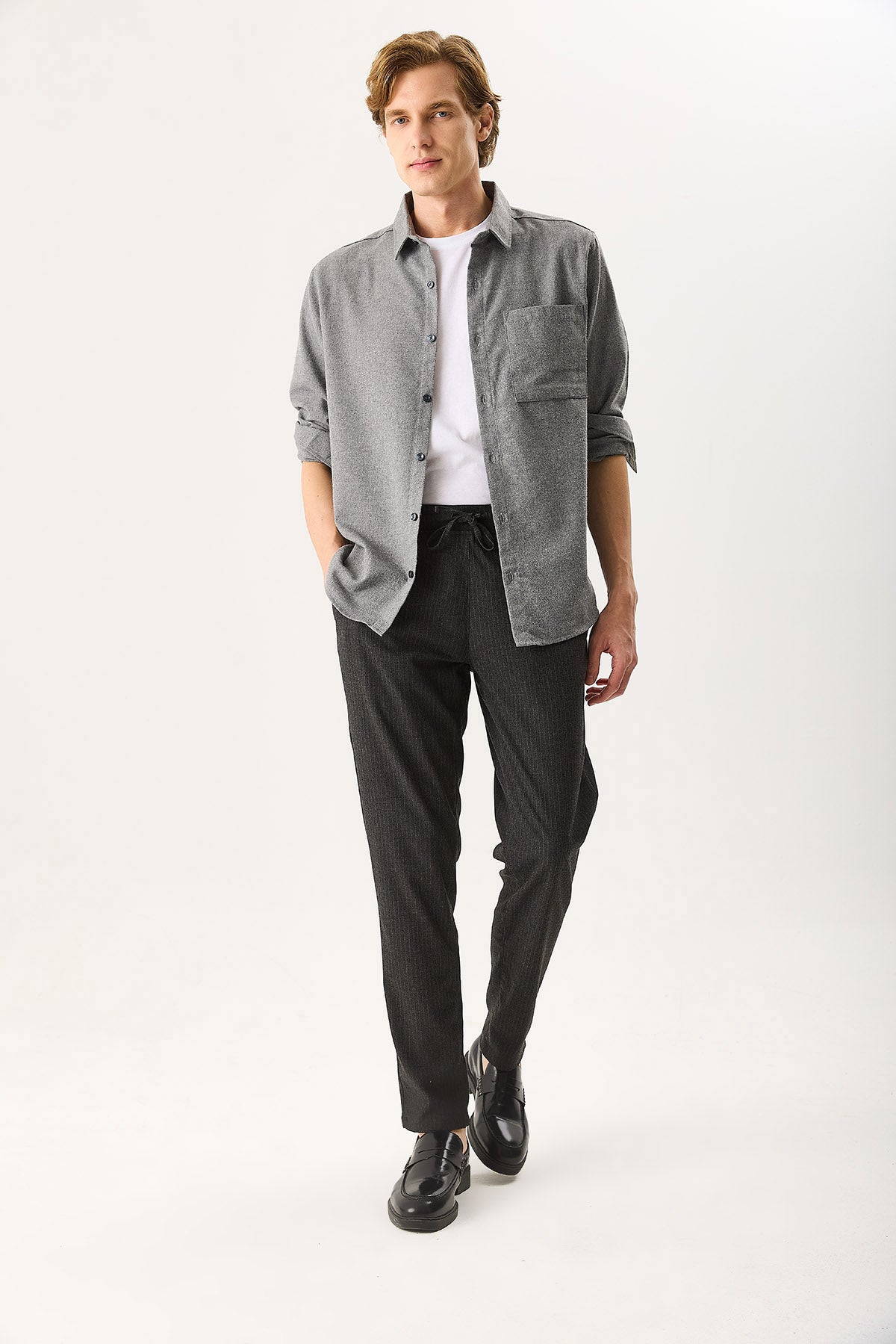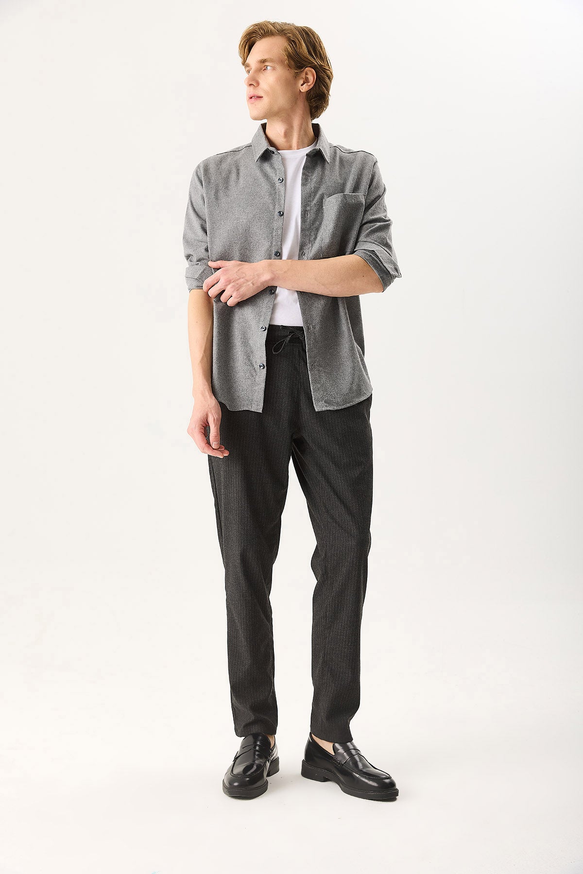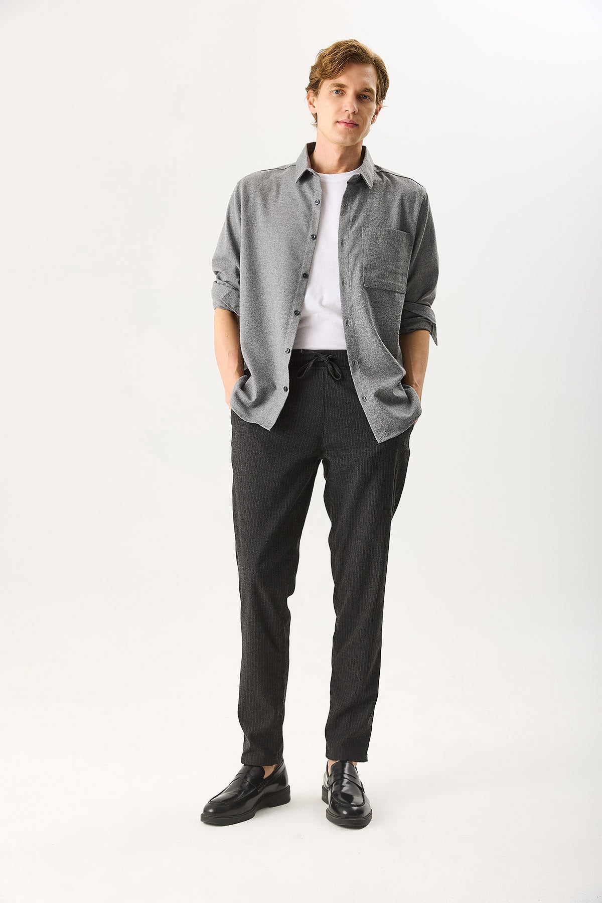 Erkek Alfred Beli Lastikli Çizgili Kaşe Pantolon - Gri Çizgili