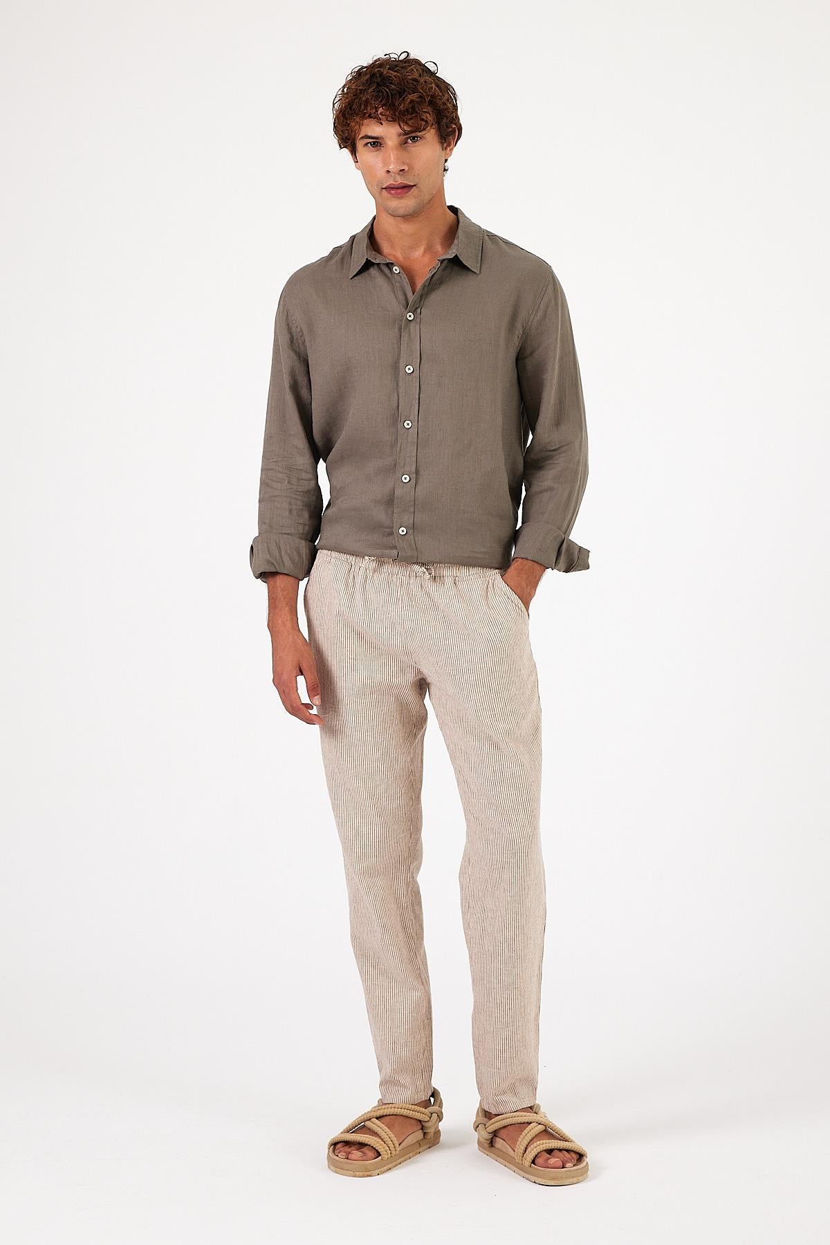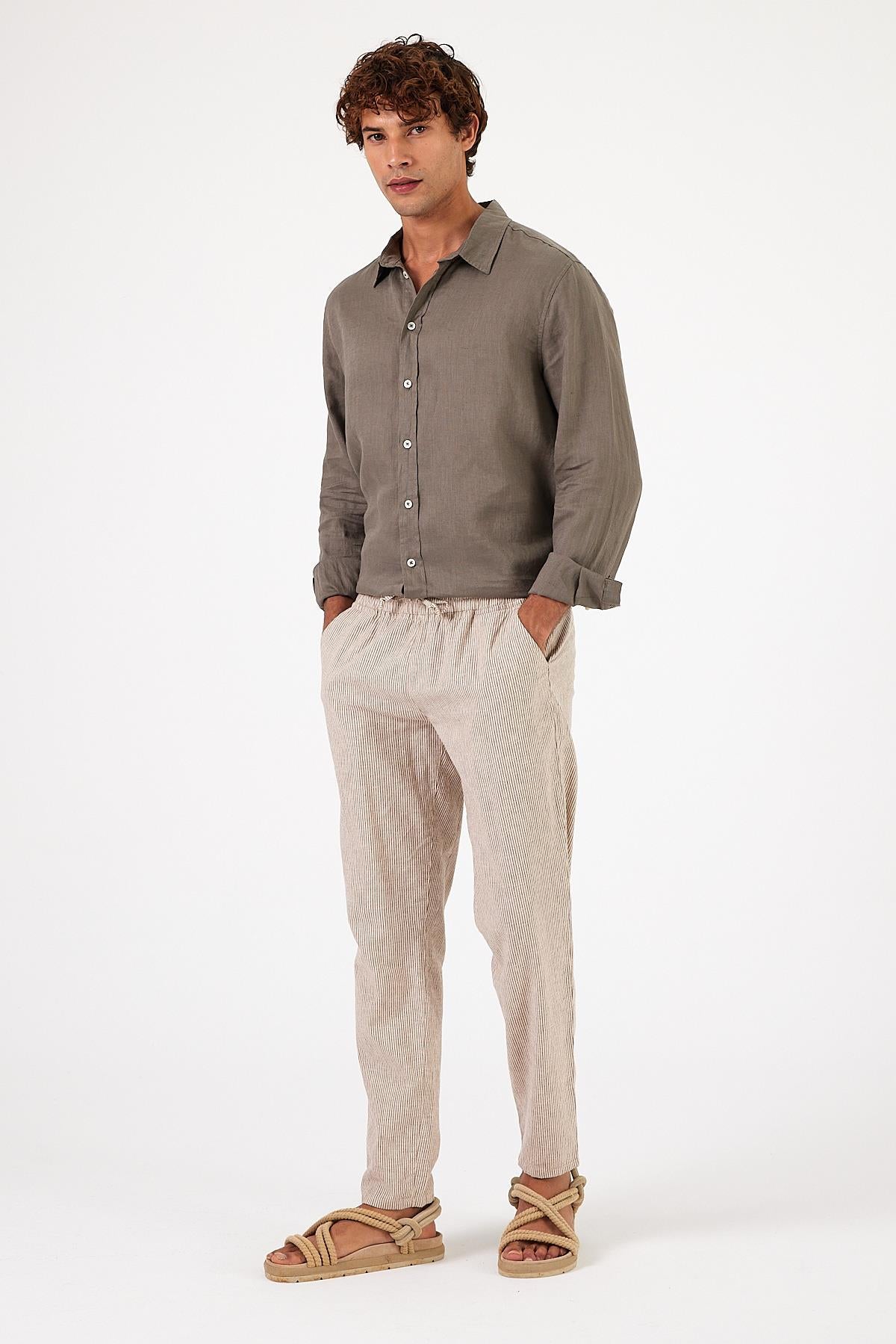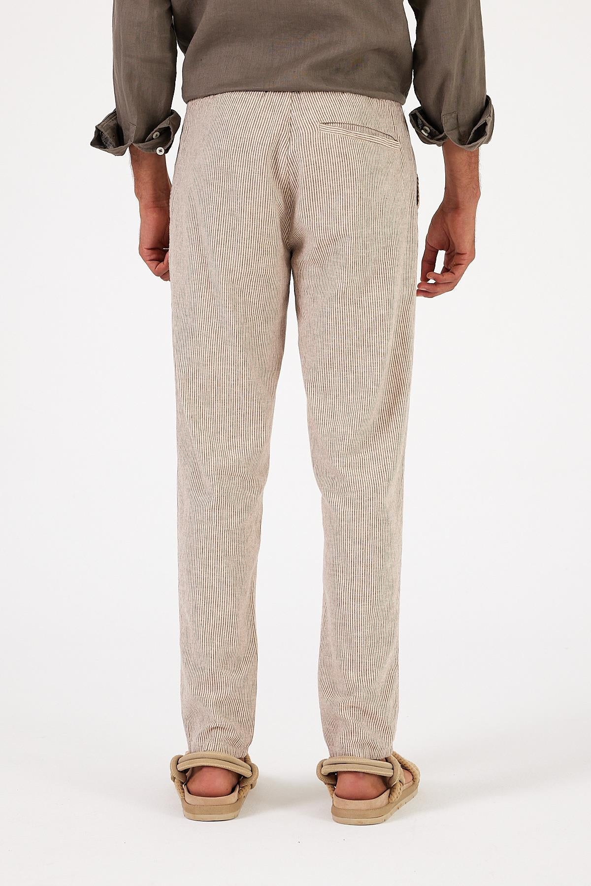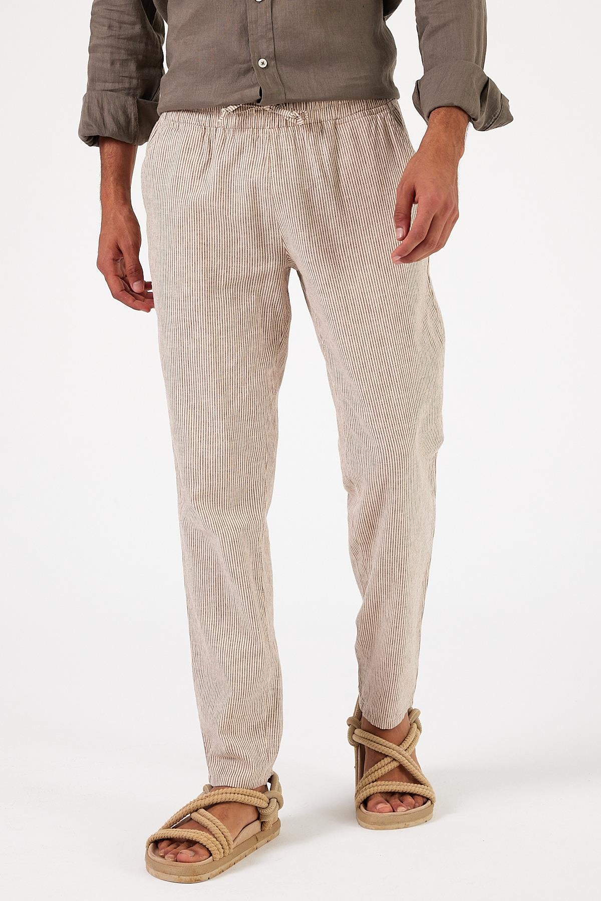Erkek Alfred Beli Lastikli Çizgili Keten Pantolon - Kahve Çizgili