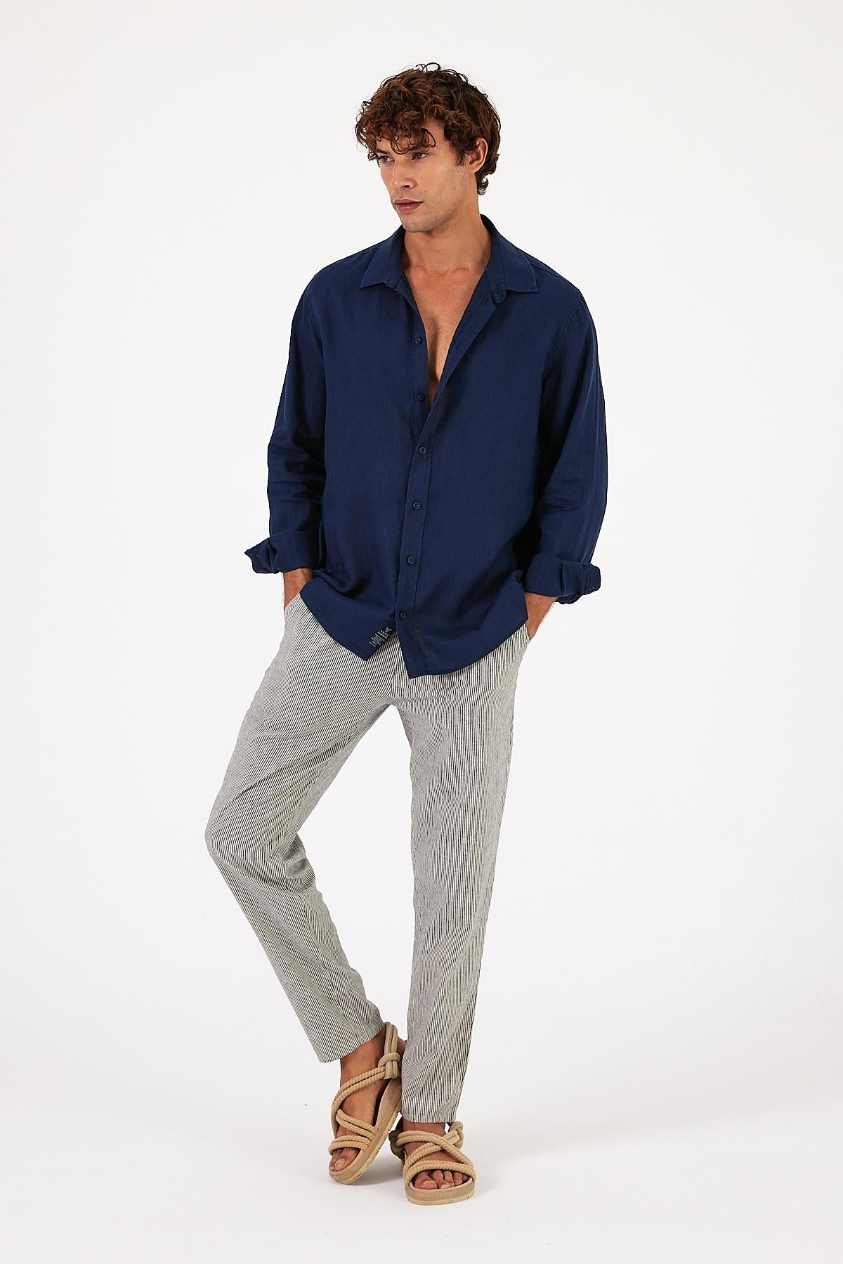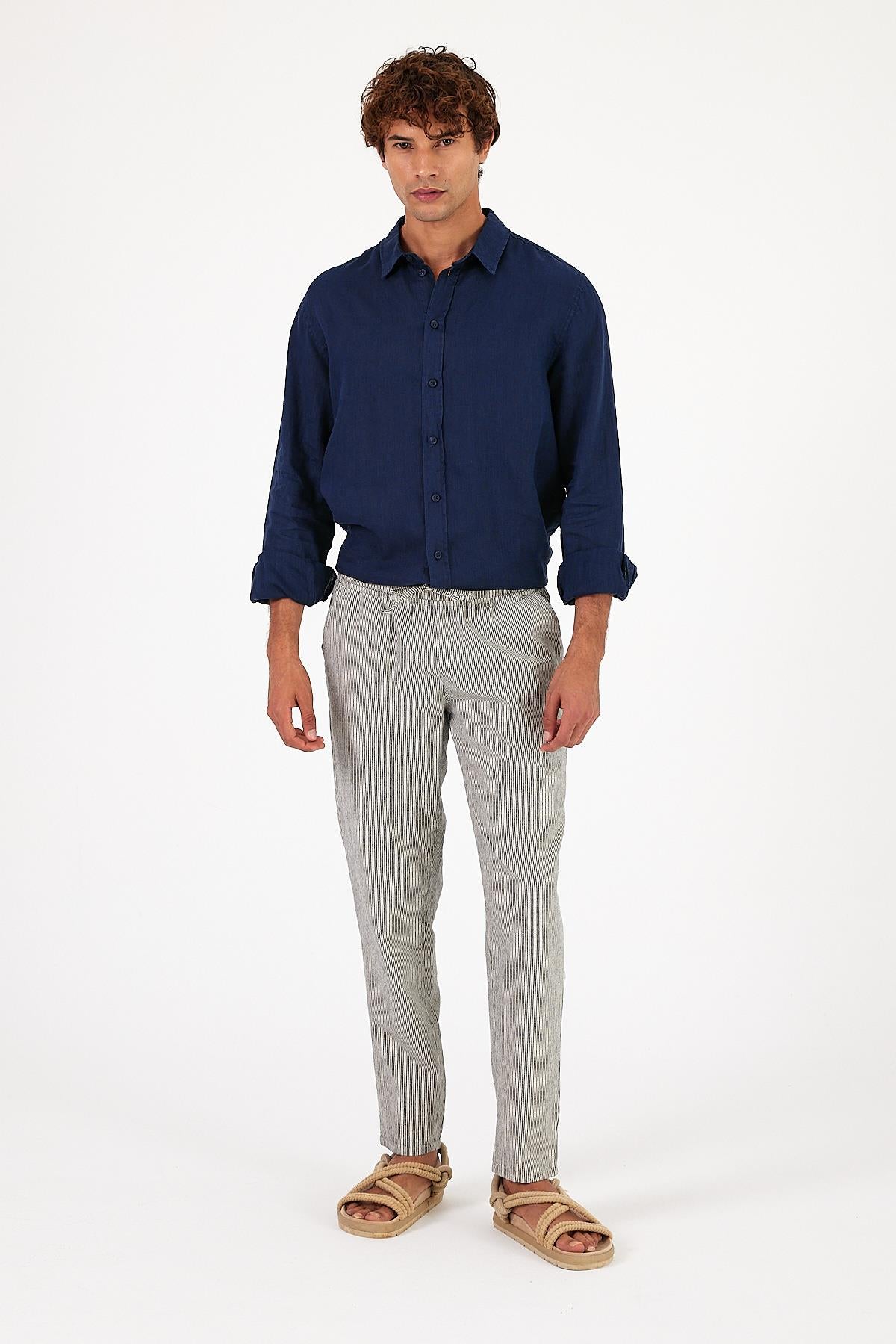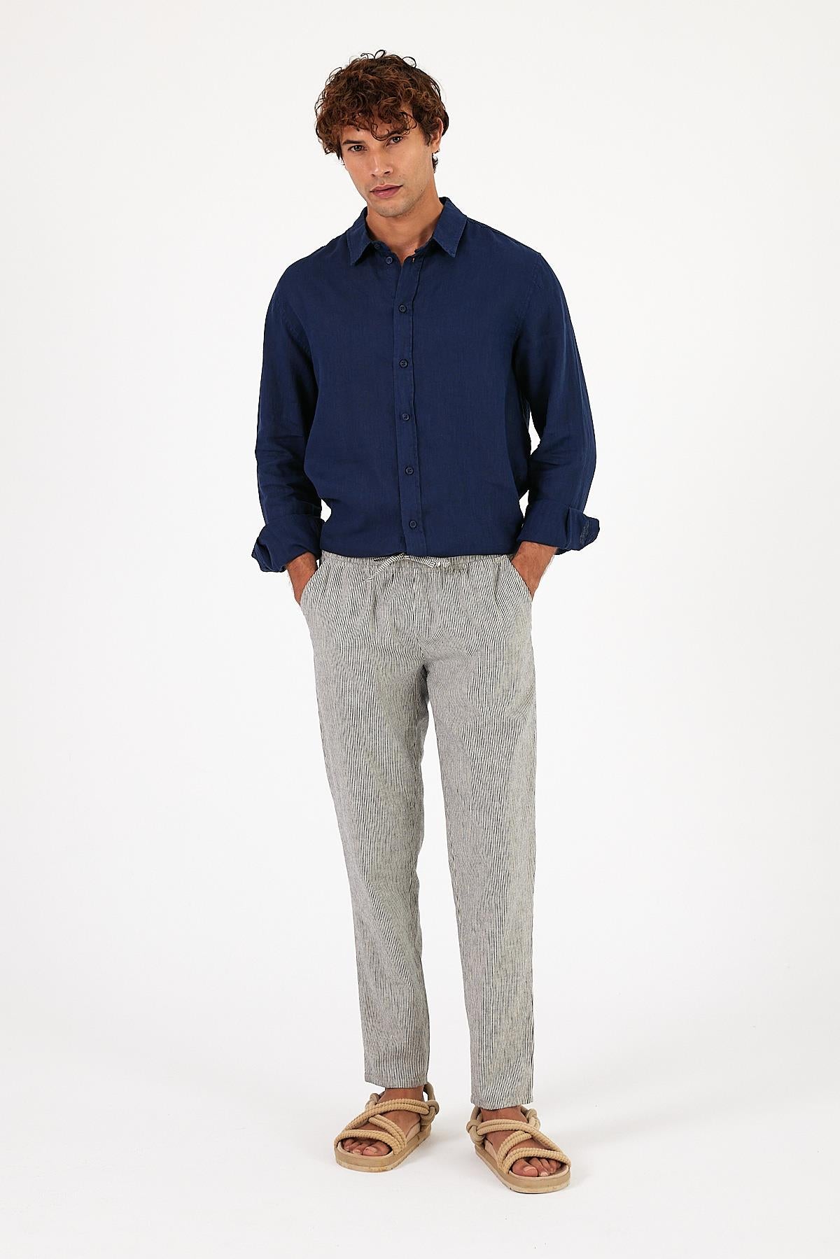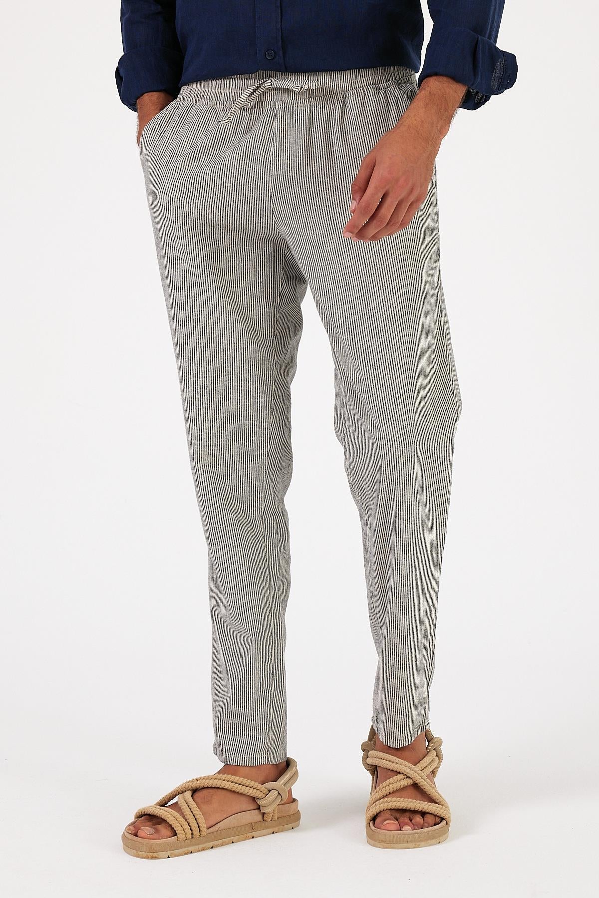 Erkek Alfred Beli Lastikli Çizgili Keten Pantolon - Lacivert Çizgili