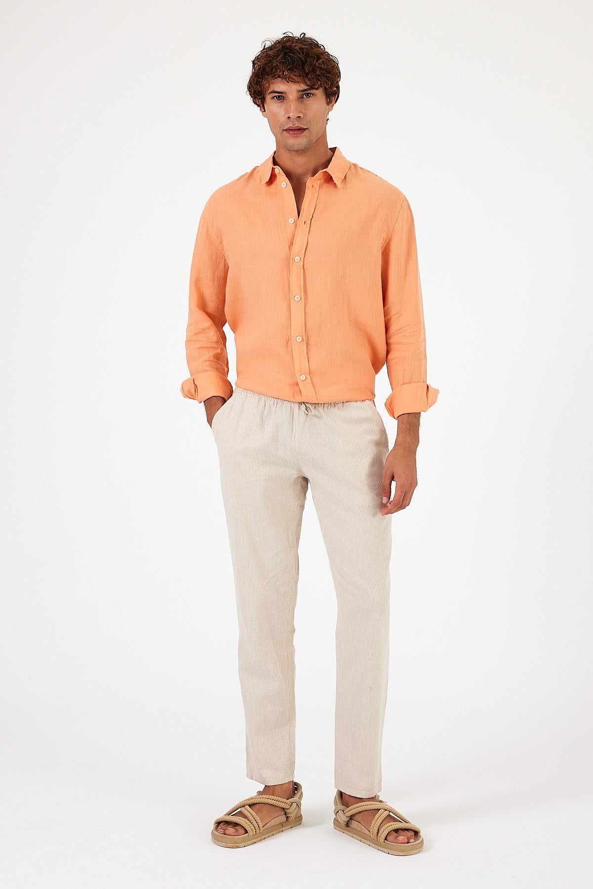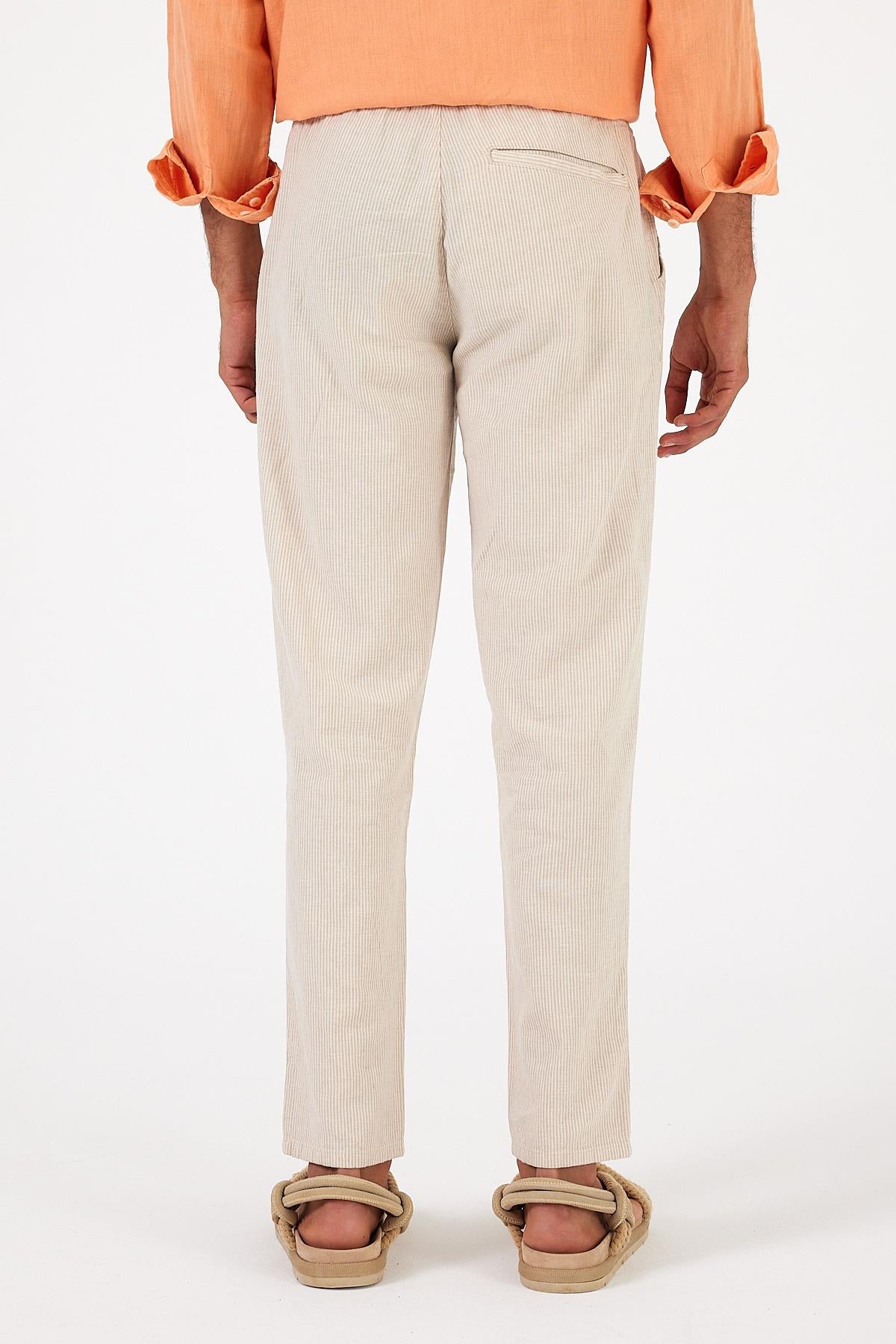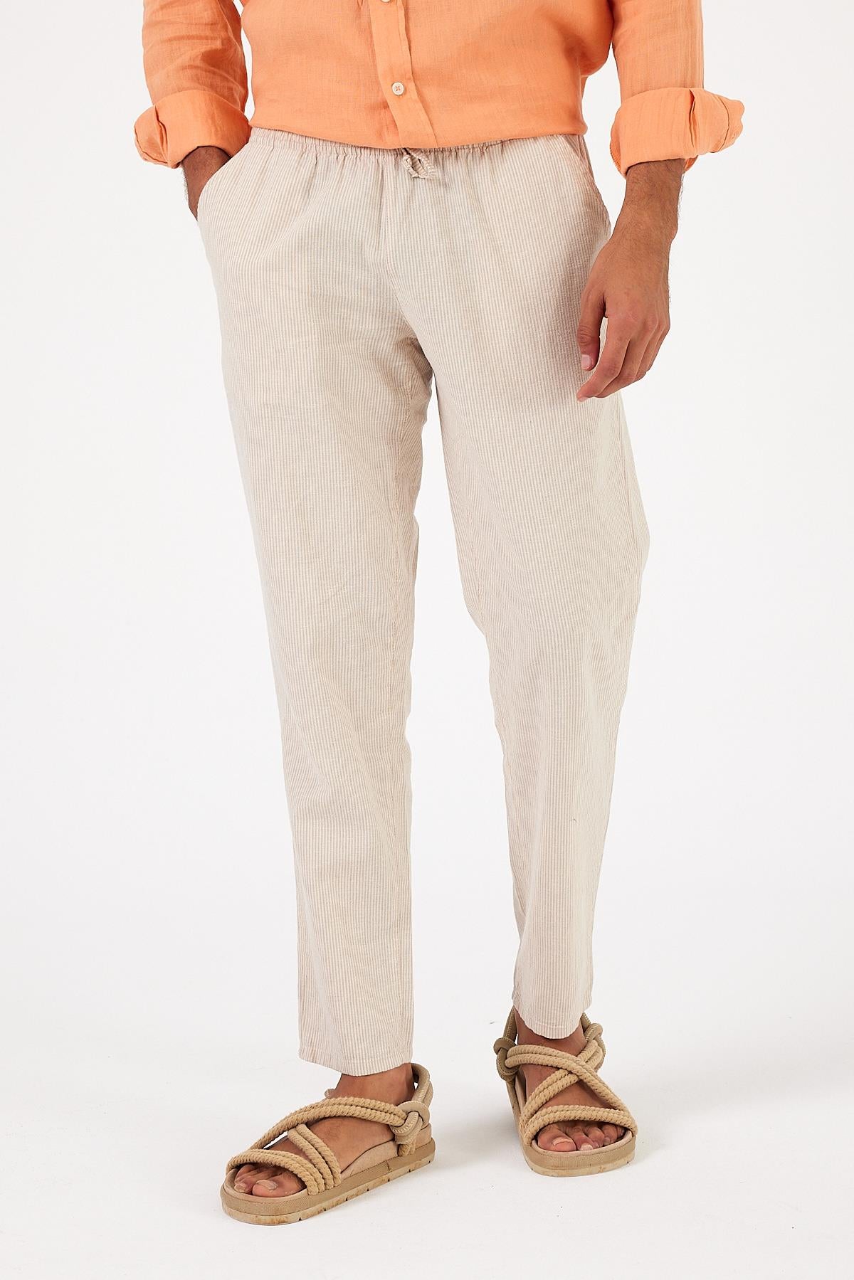 Erkek Alfred Beli Lastikli Çizgili Keten Pantolon - Taş Çizgili