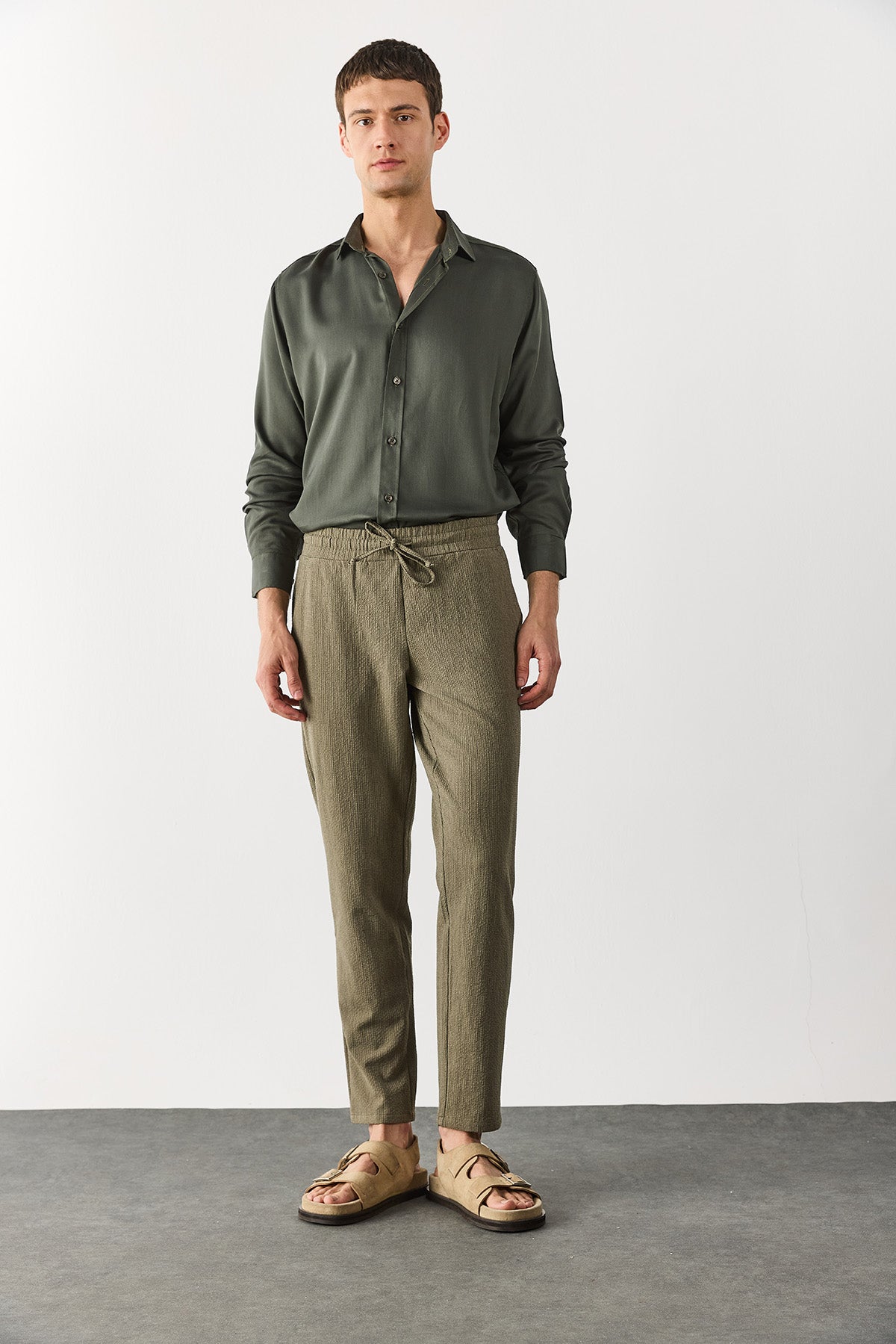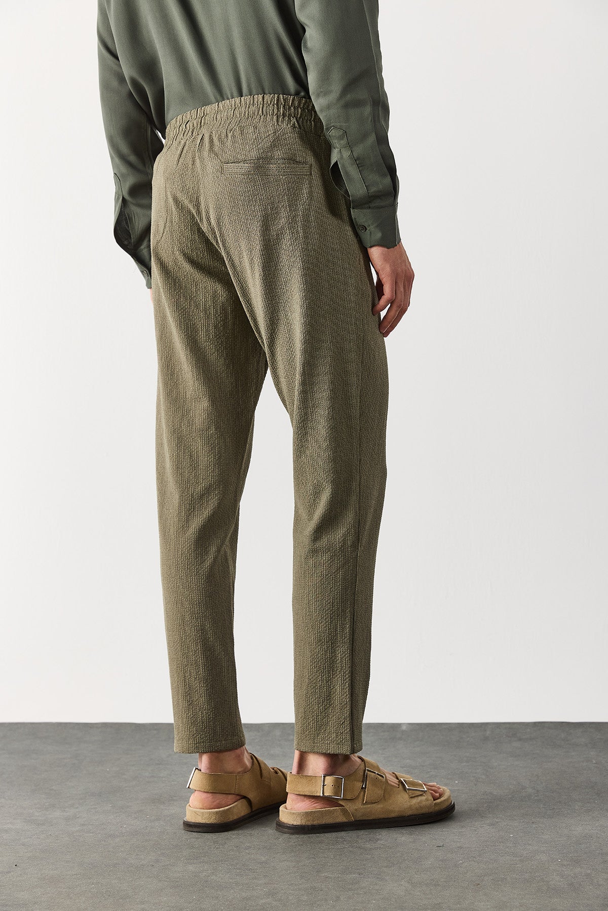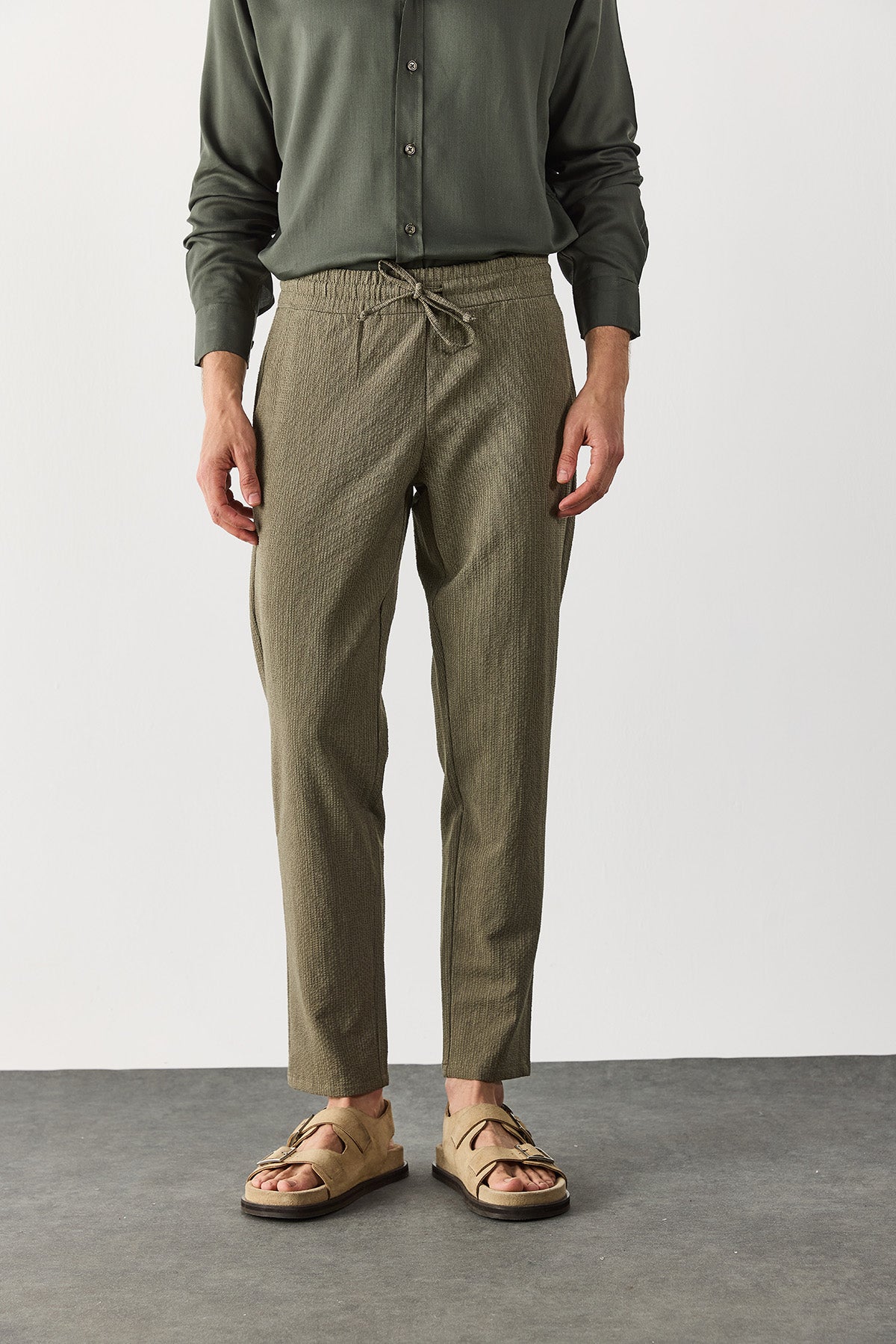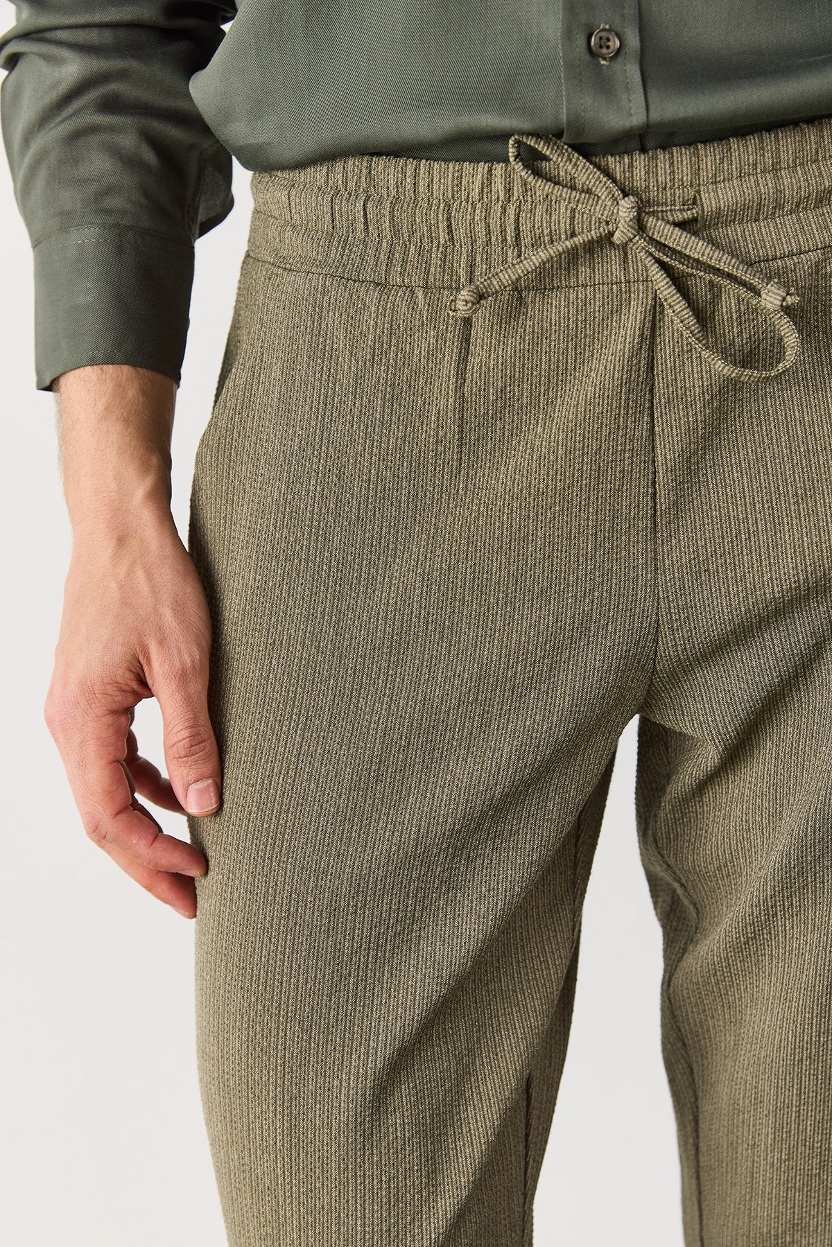 Erkek Alfred Beli Lastikli İnce Çizgili Gofre Pantolon - Haki Çizgili