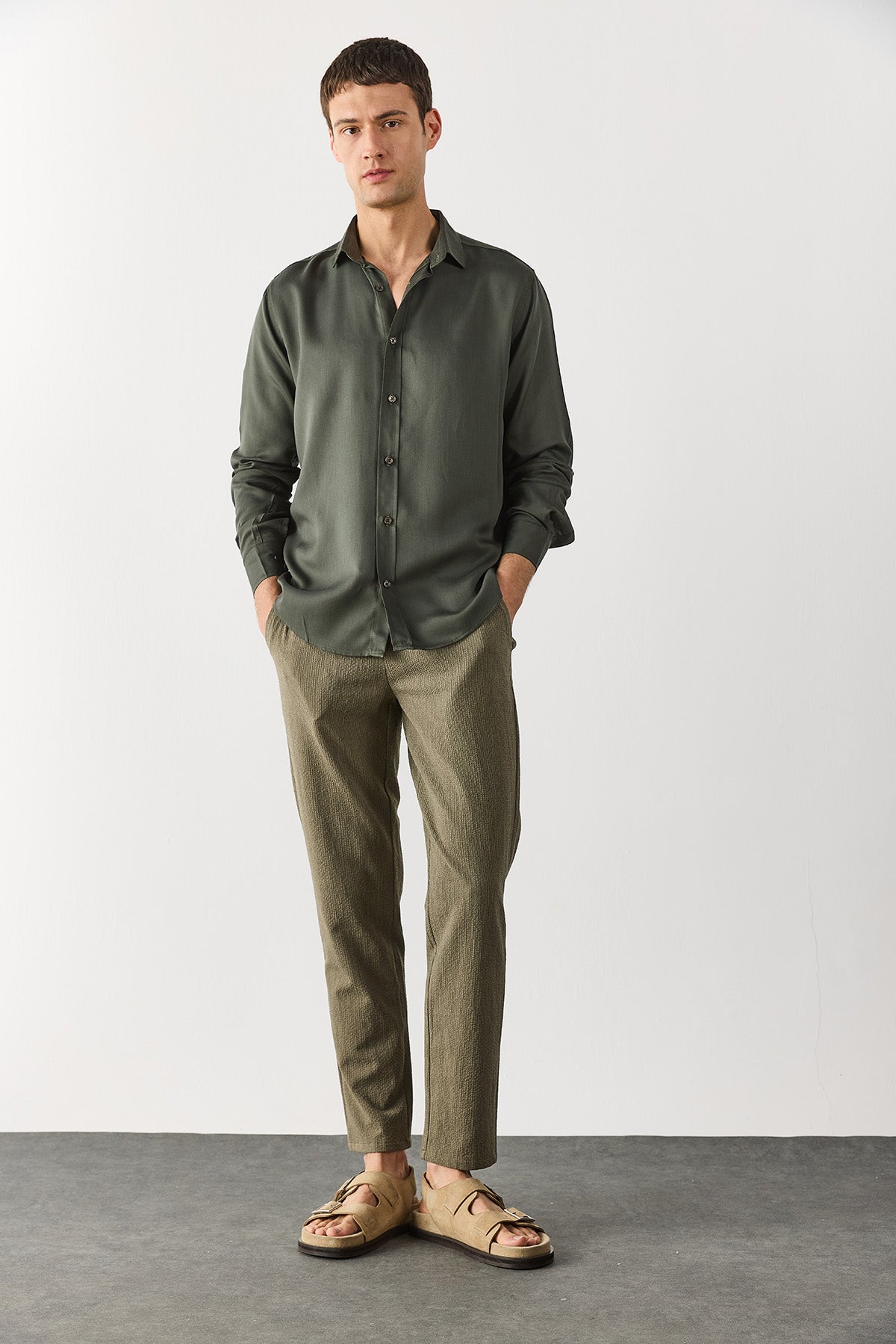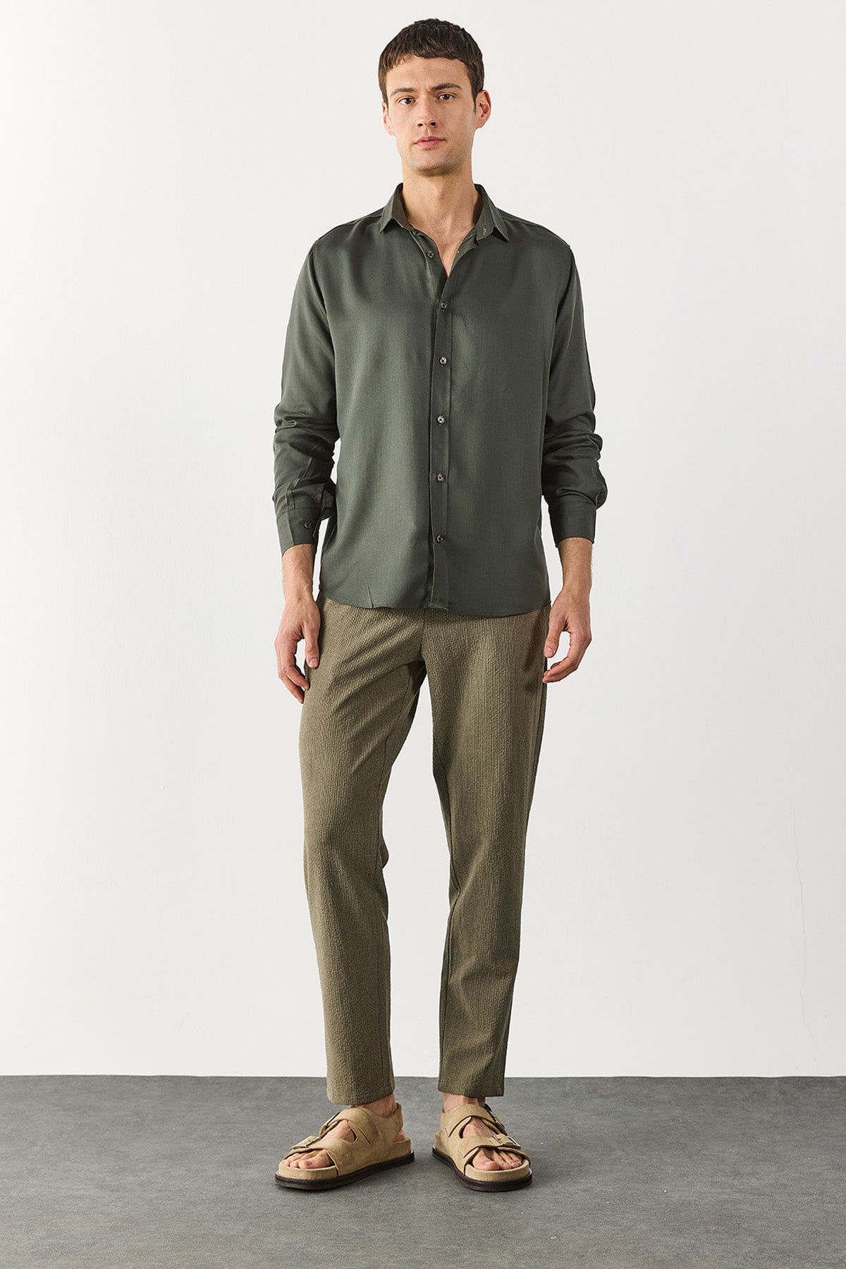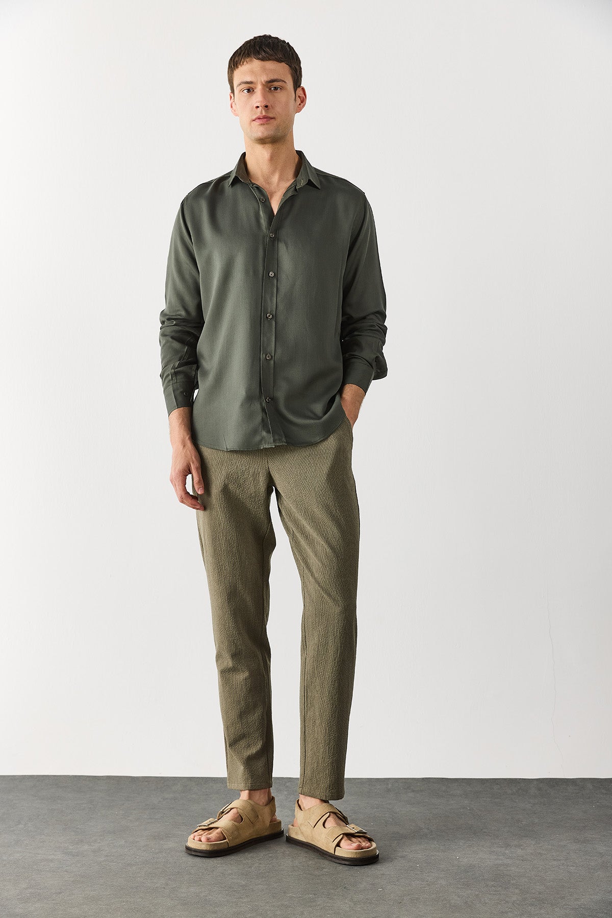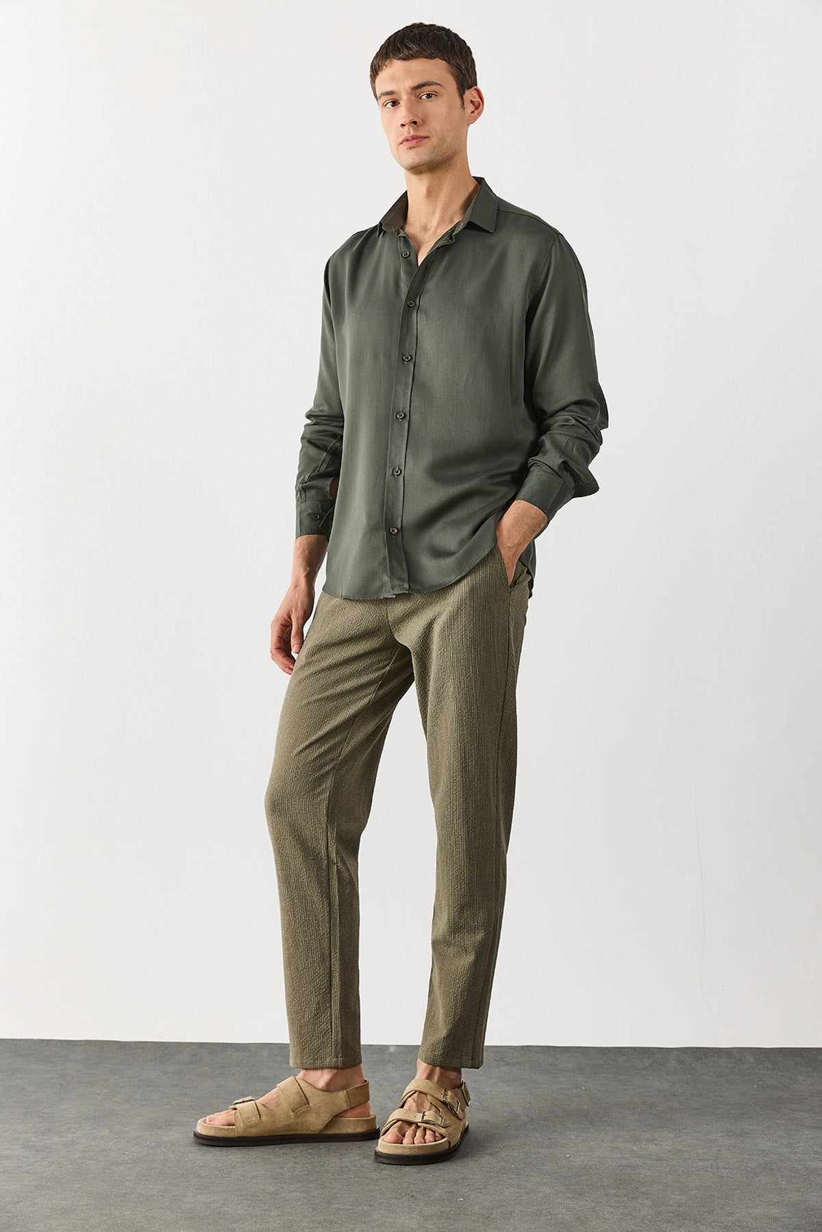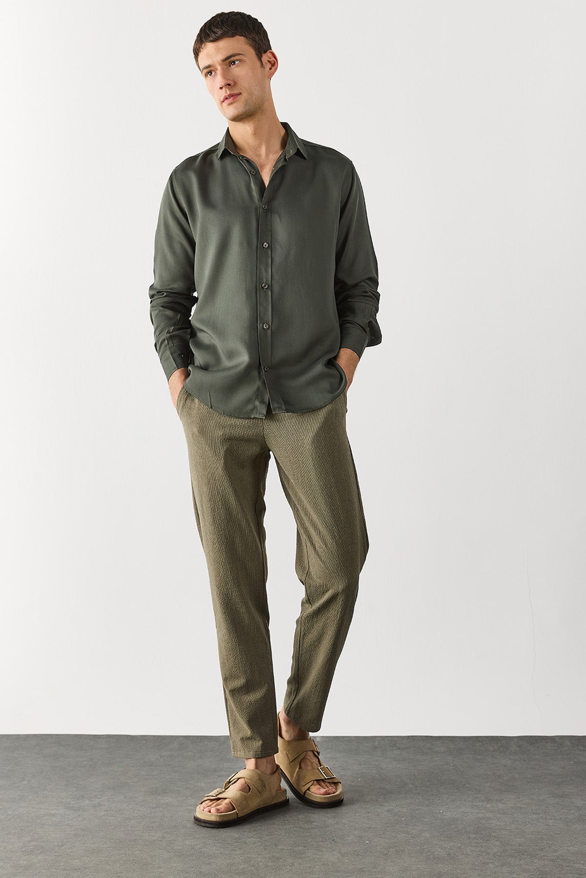 Erkek Alfred Beli Lastikli İnce Çizgili Gofre Pantolon - Haki Çizgili