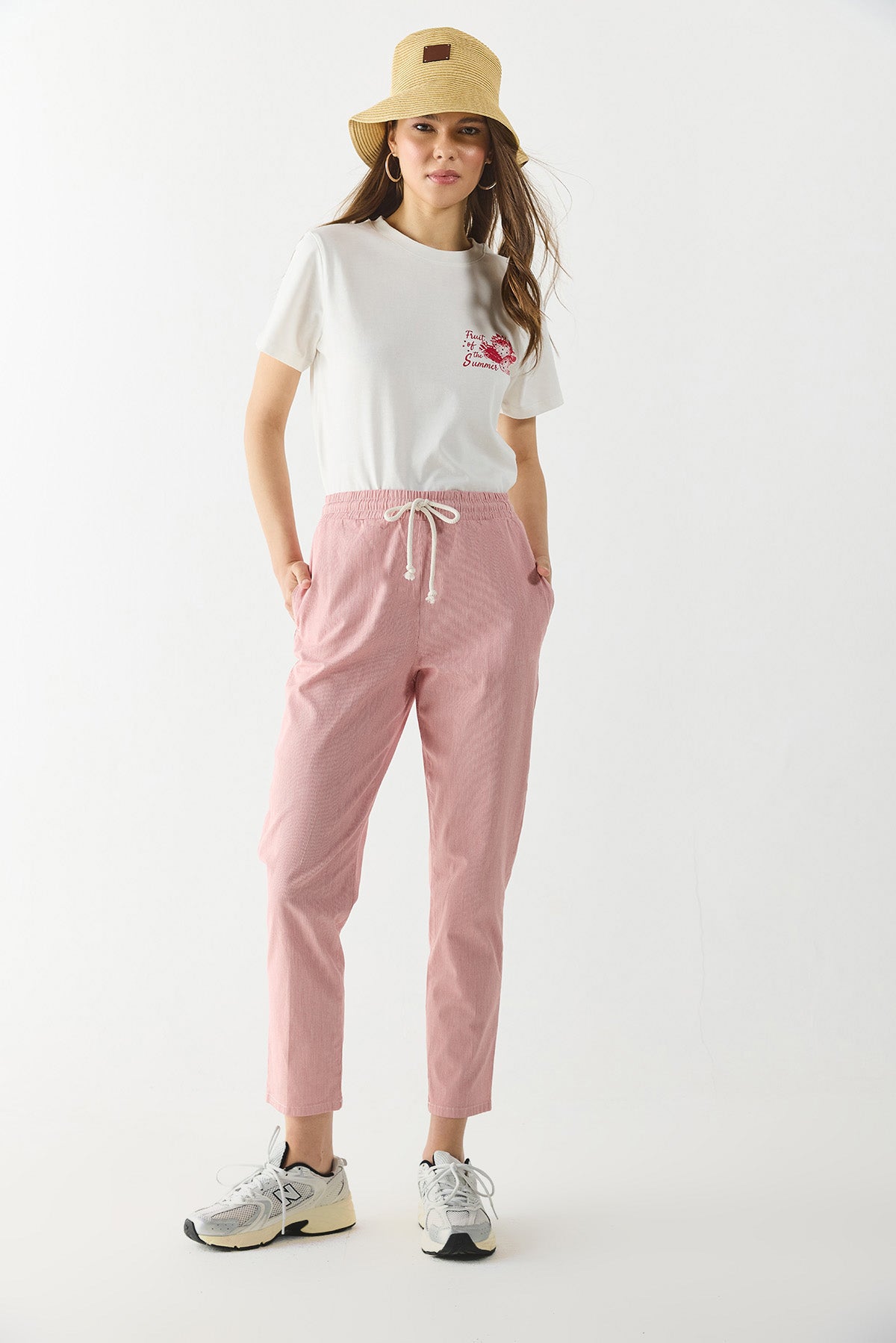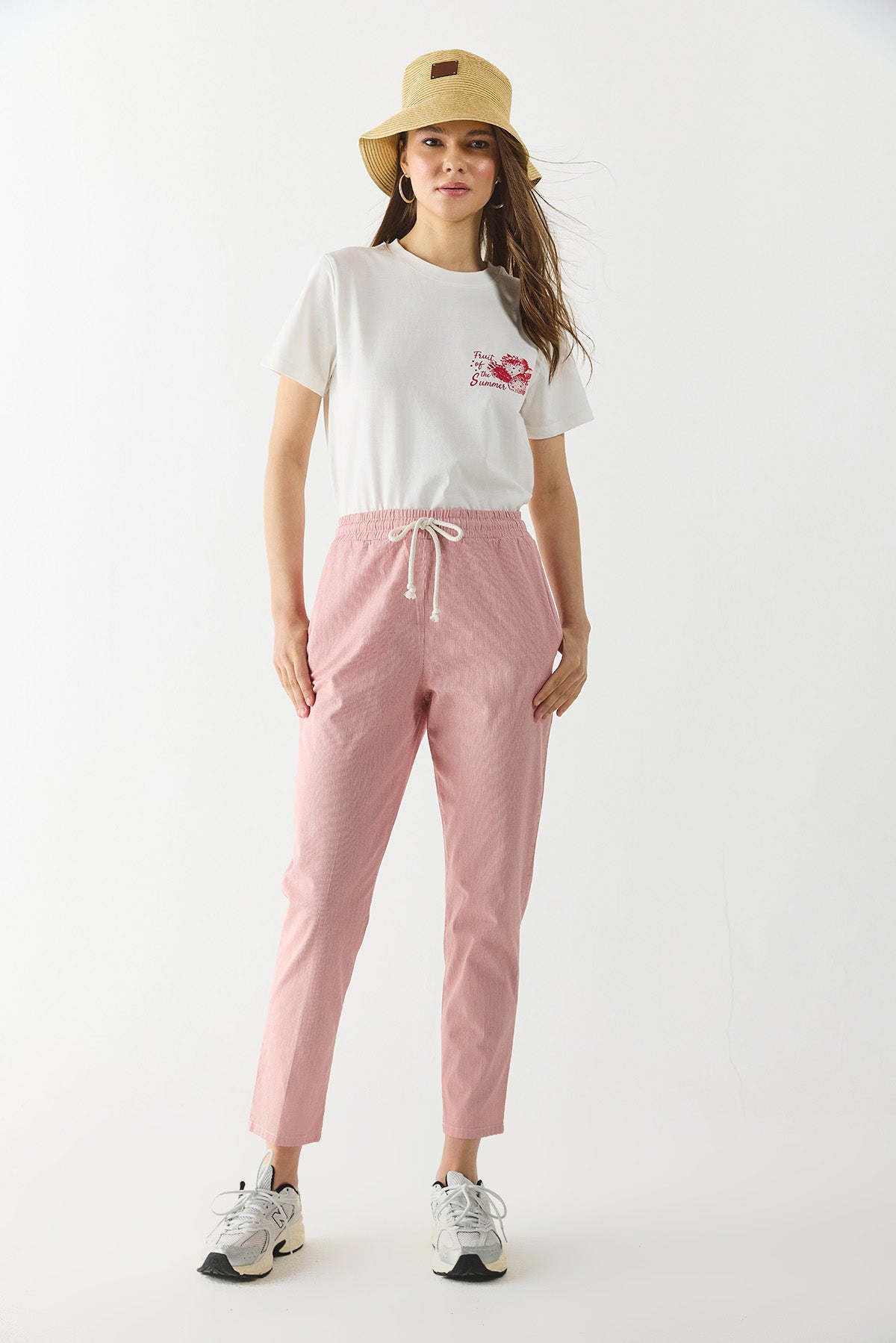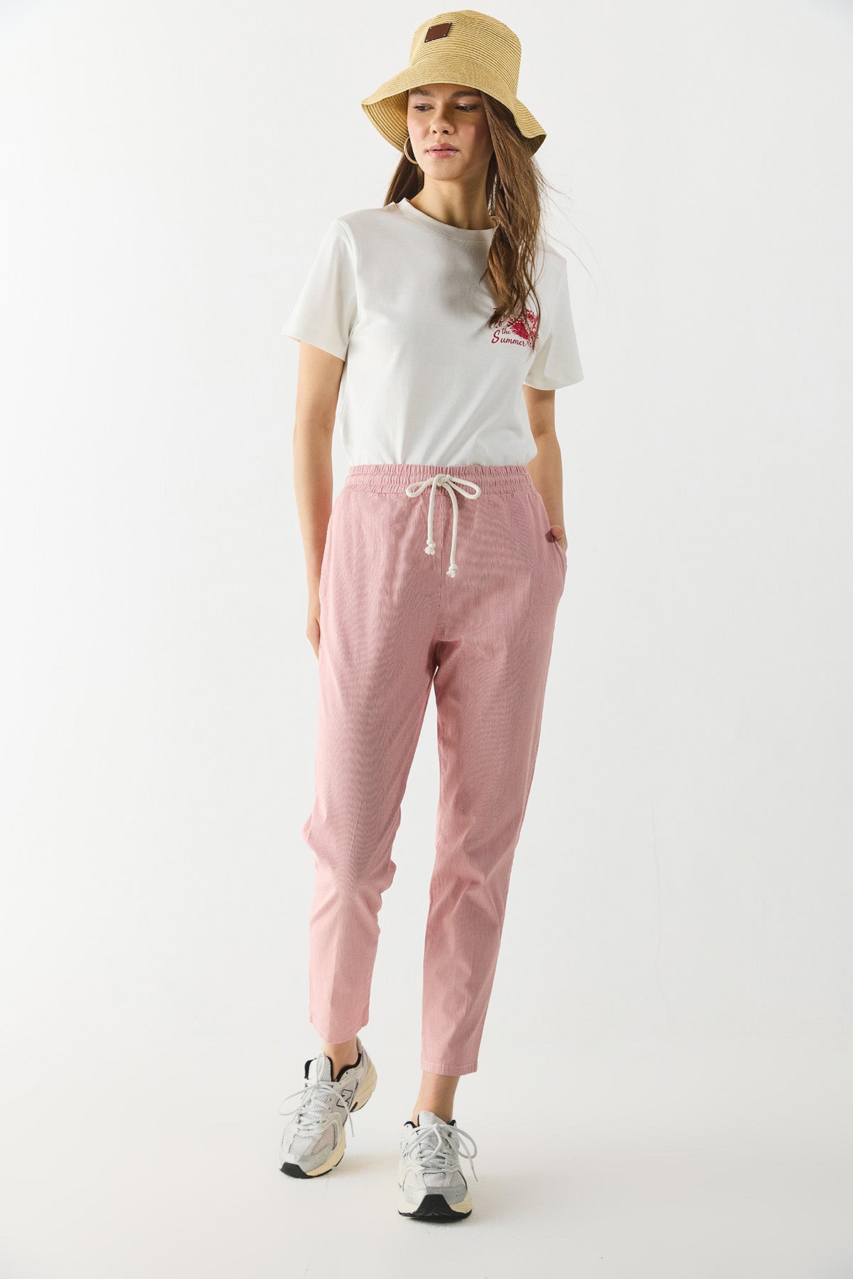 Kadın Alian Beli Lastikli Çizgili Gabardin Pantolon - Kırmızı Çizgili