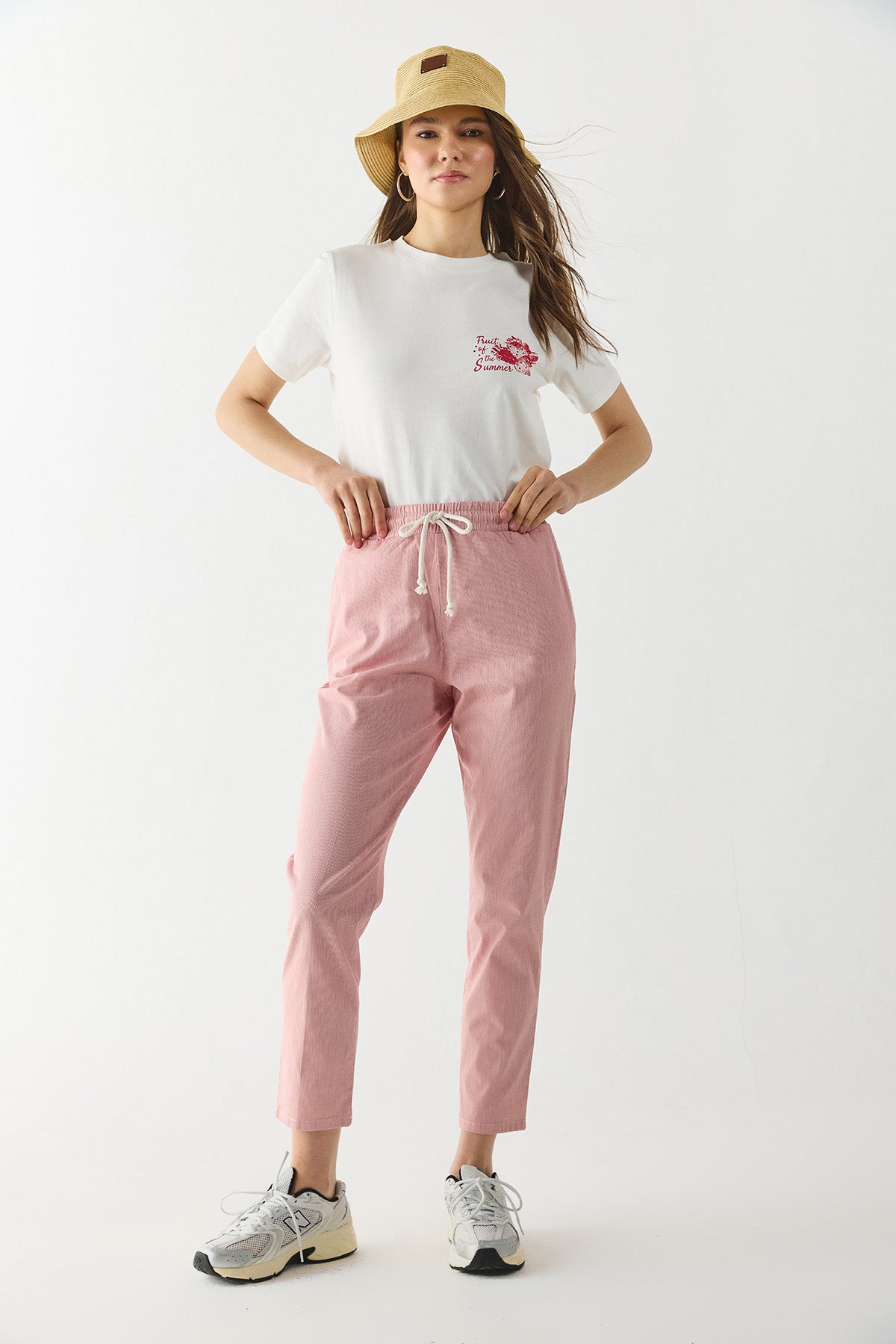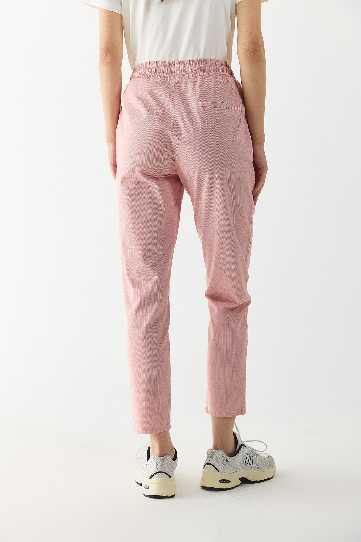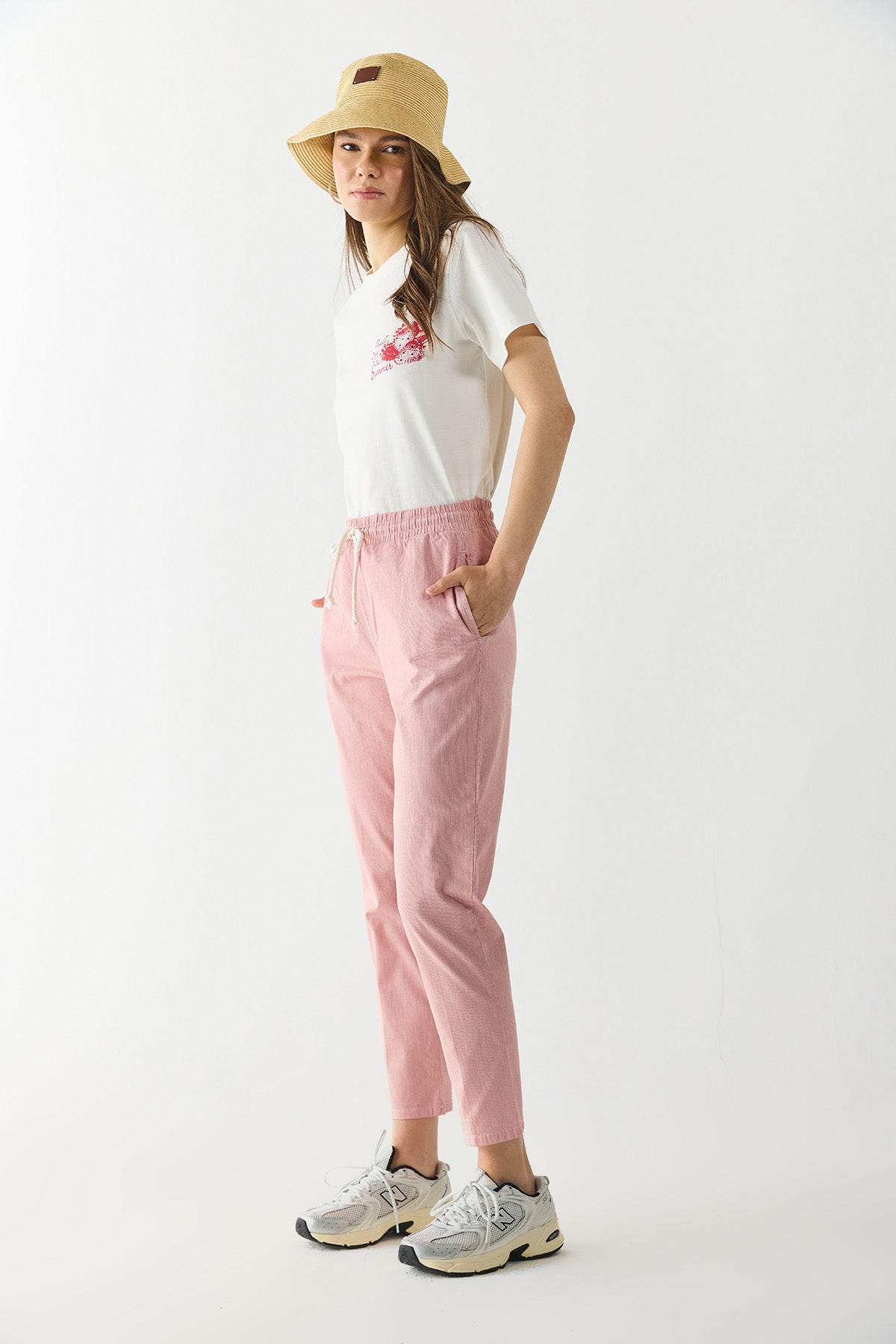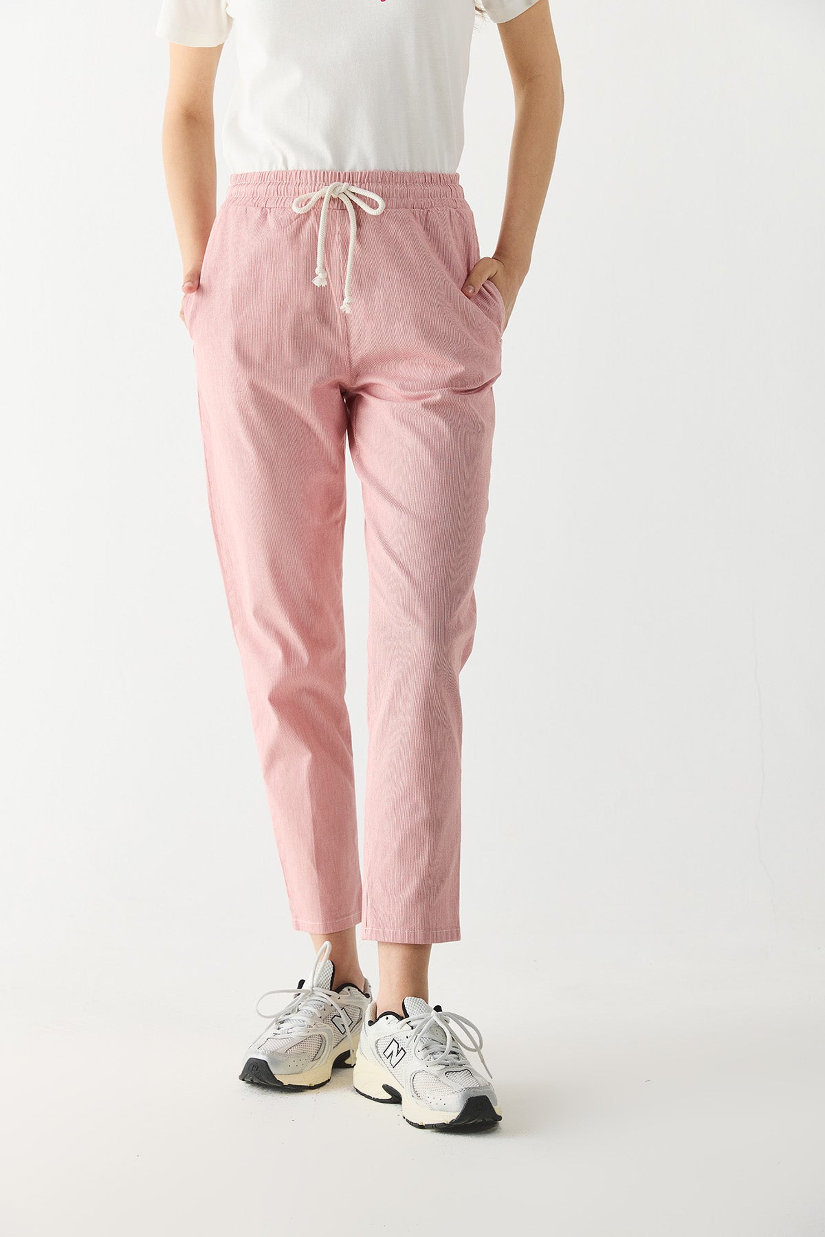 Kadın Alian Beli Lastikli Çizgili Gabardin Pantolon - Kırmızı Çizgili