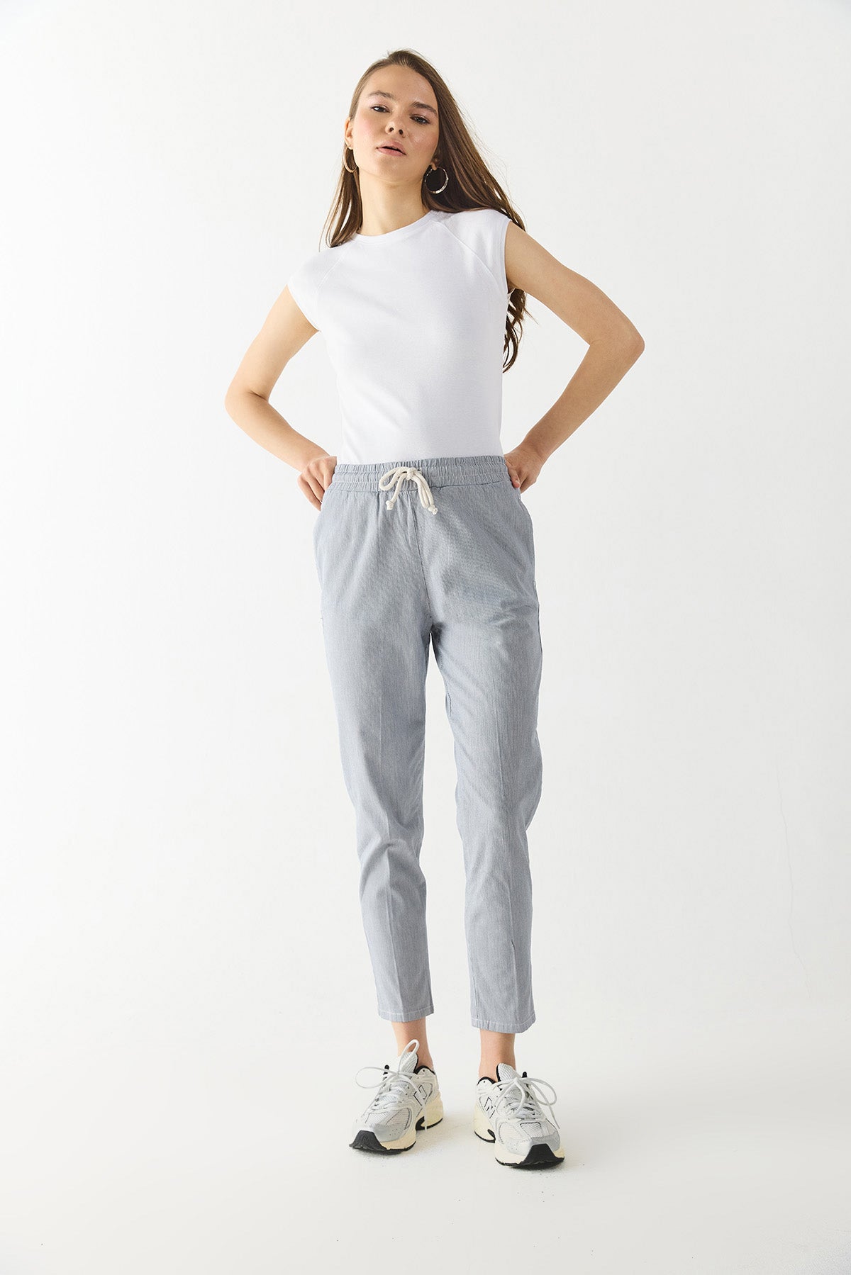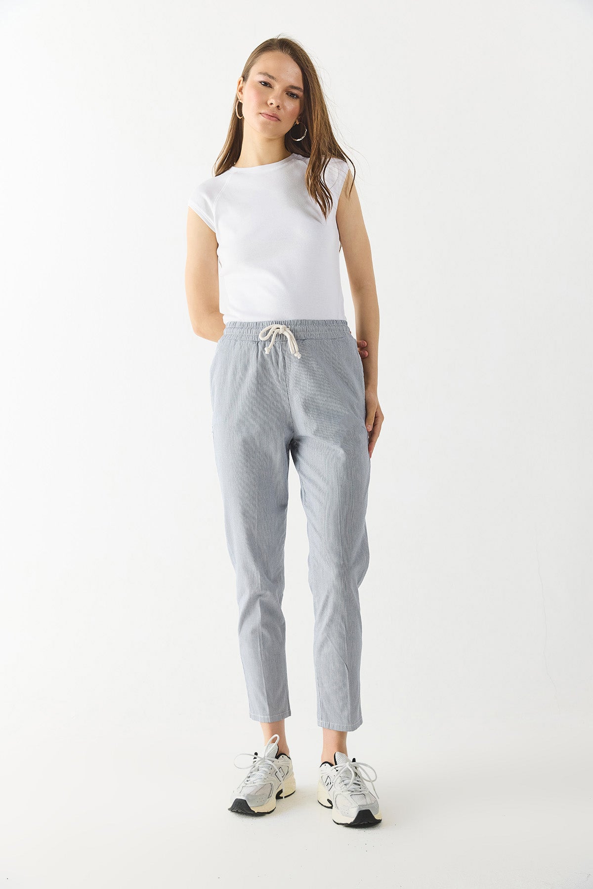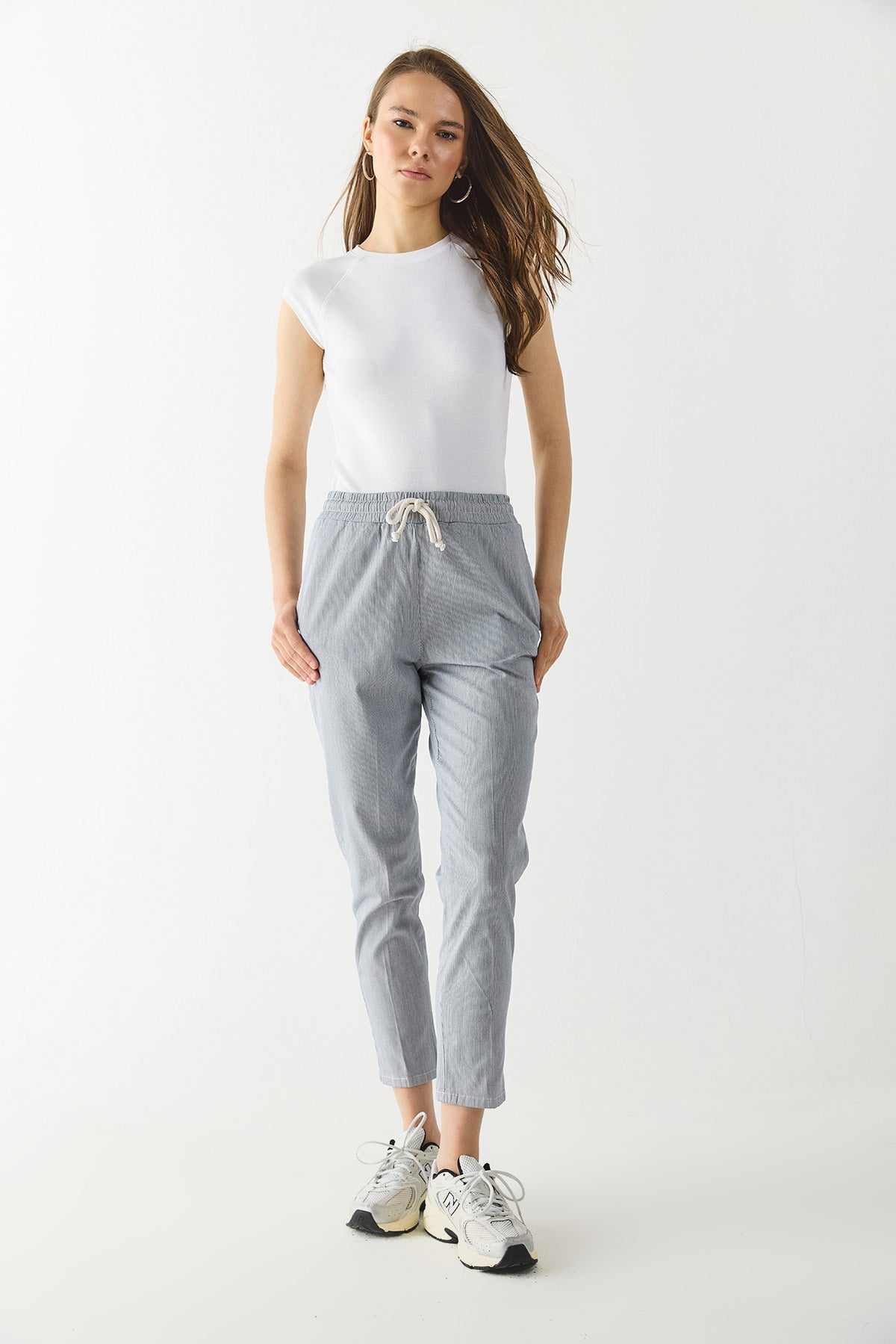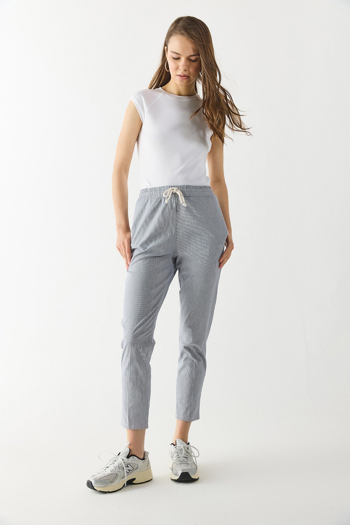 Kadın Alian Beli Lastikli Çizgili Gabardin Pantolon - Lacivert Çizgili