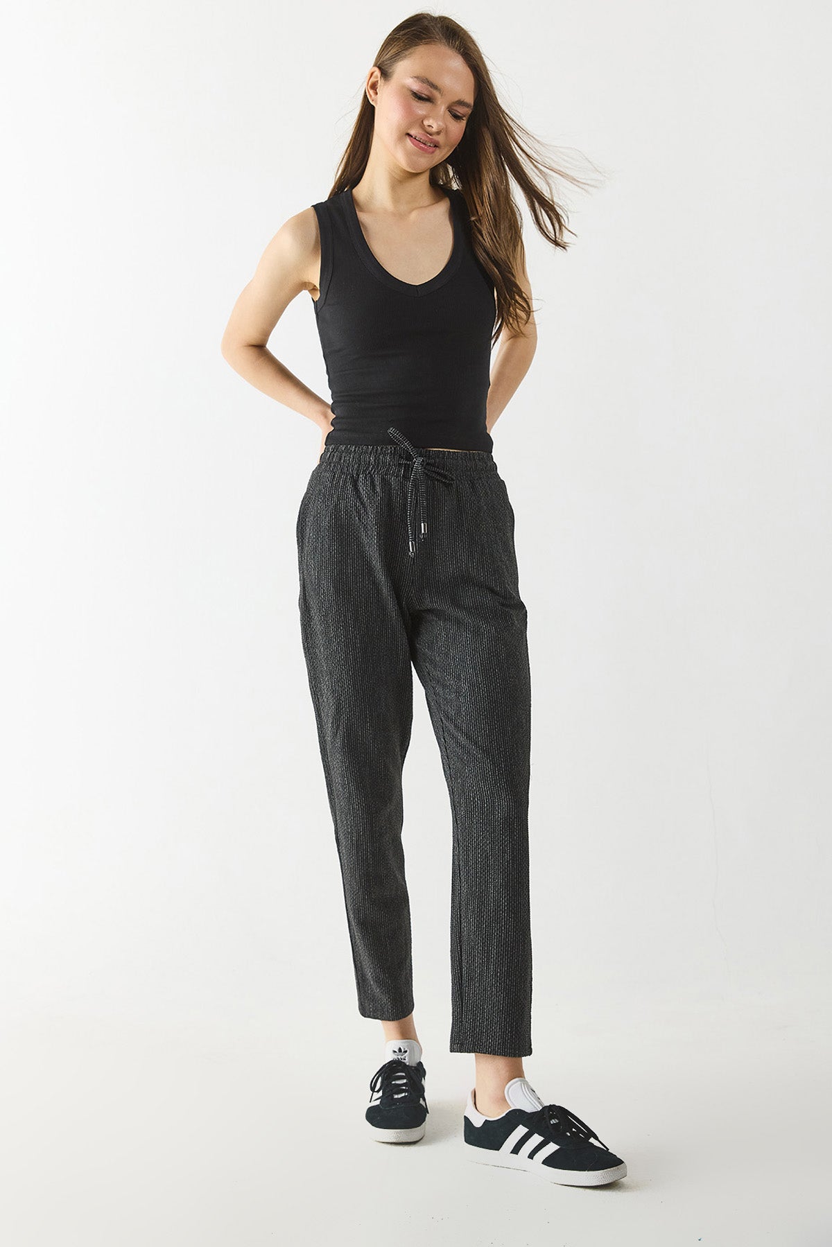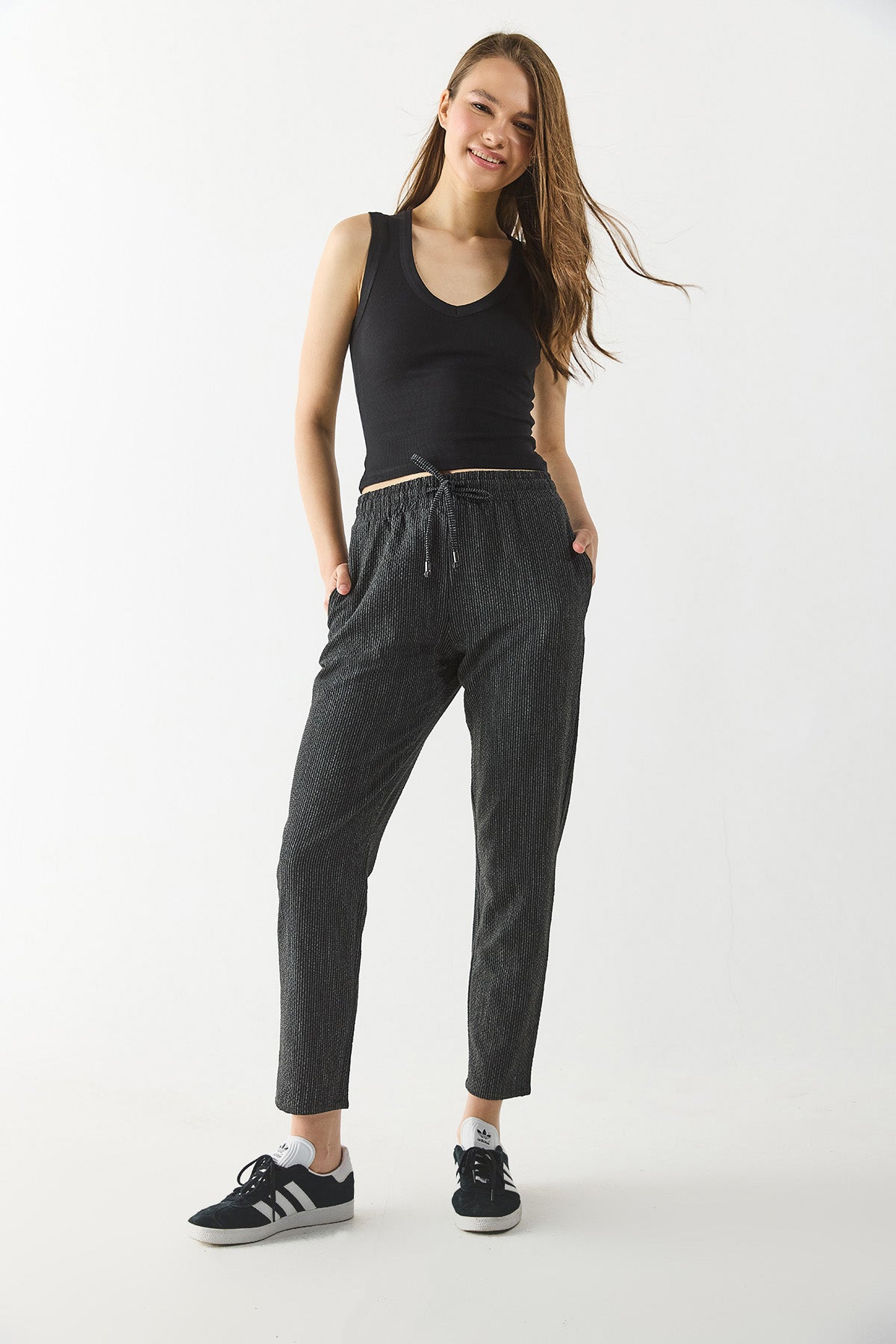 Kadın Alian Beli Lastikli Kalın Çizgili Gofre Pantolon - Siyah Çizgili