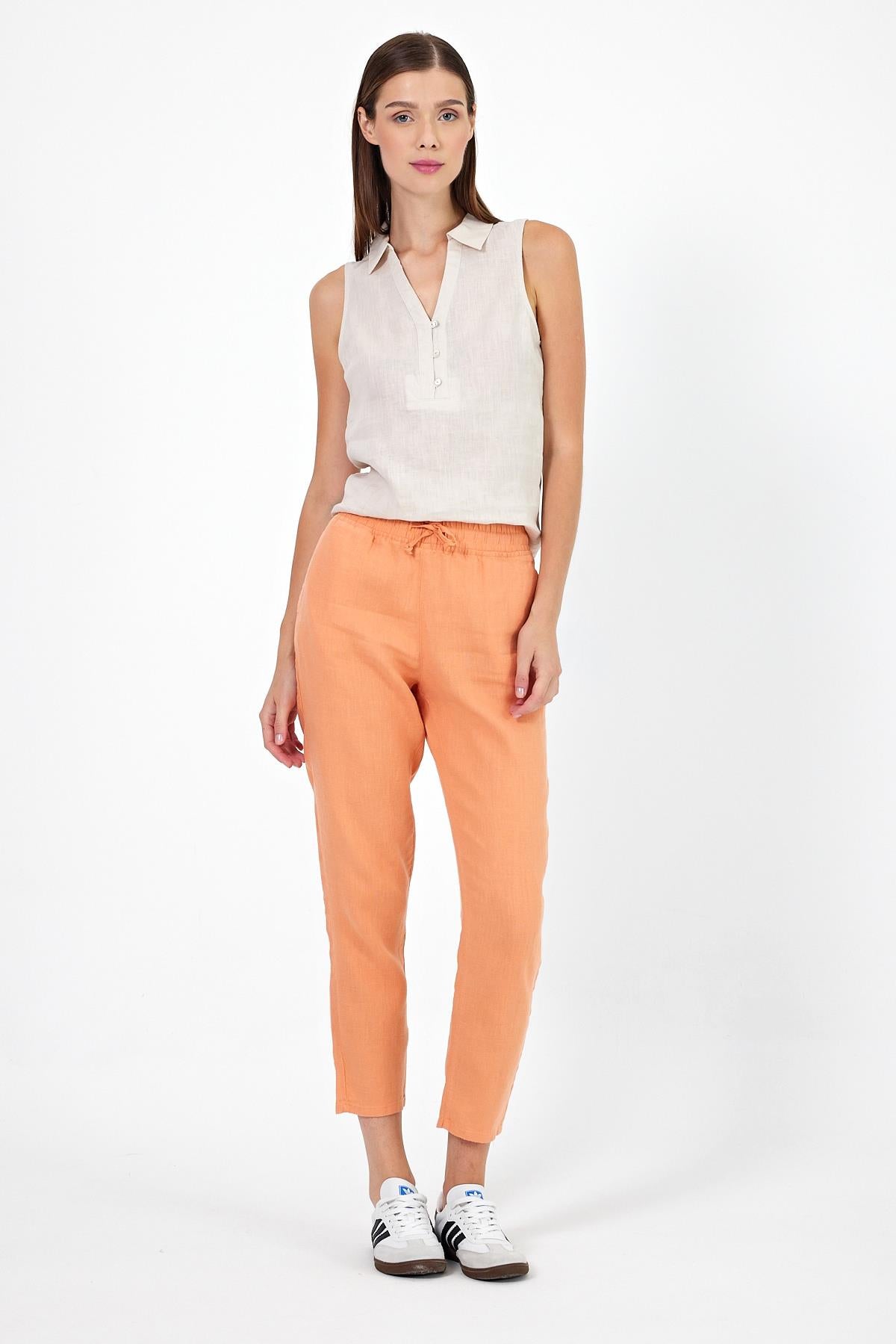 Kadın Alian Beli Lastikli Beach Pantolon %100 Keten - Turuncu