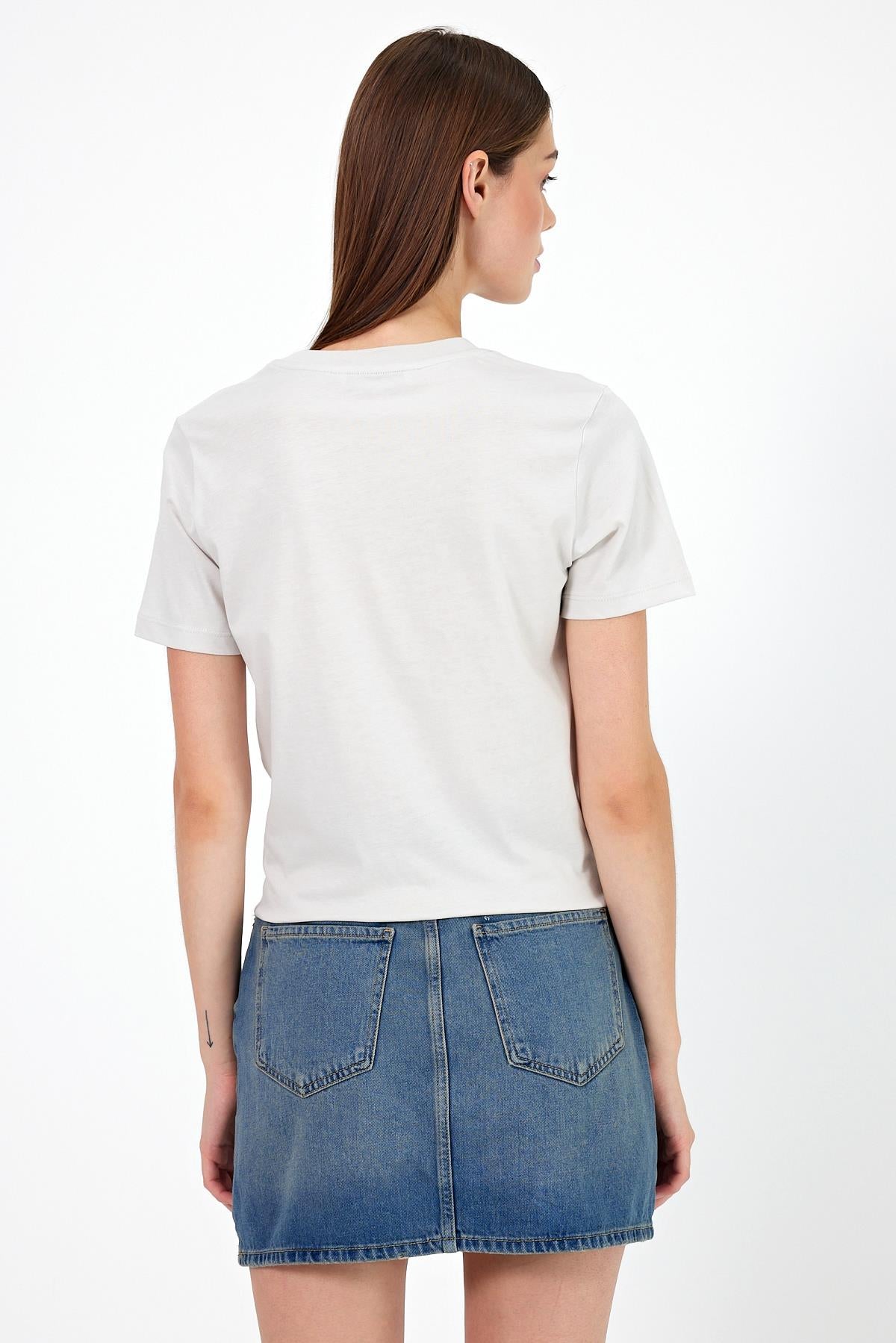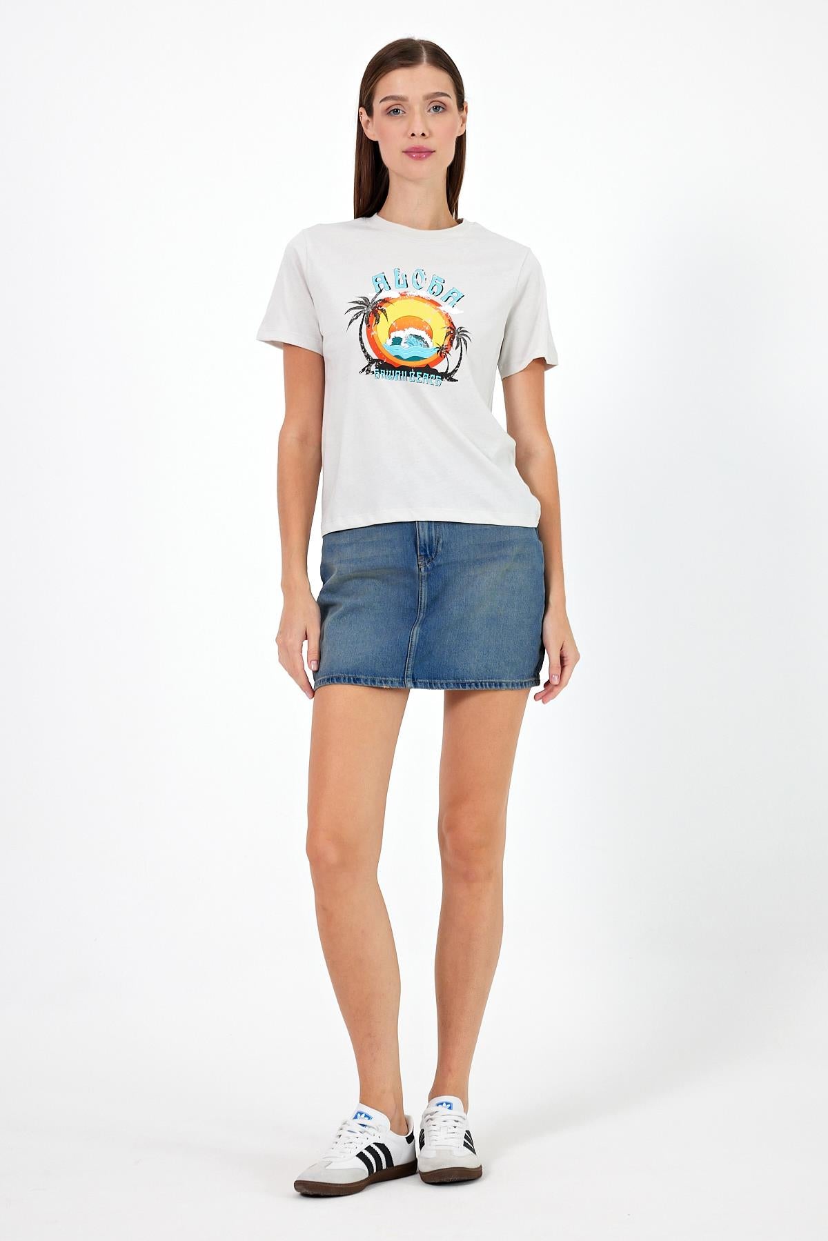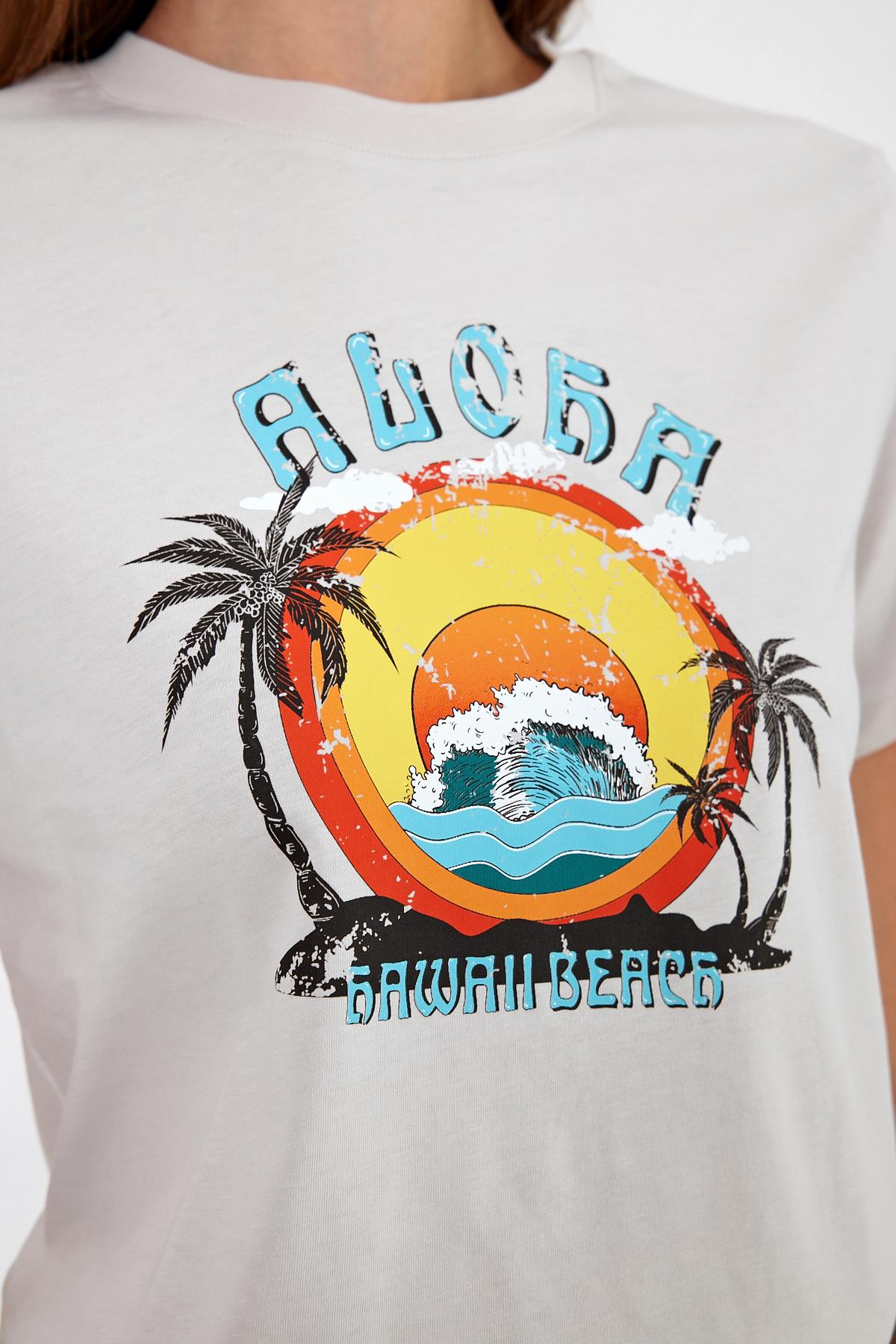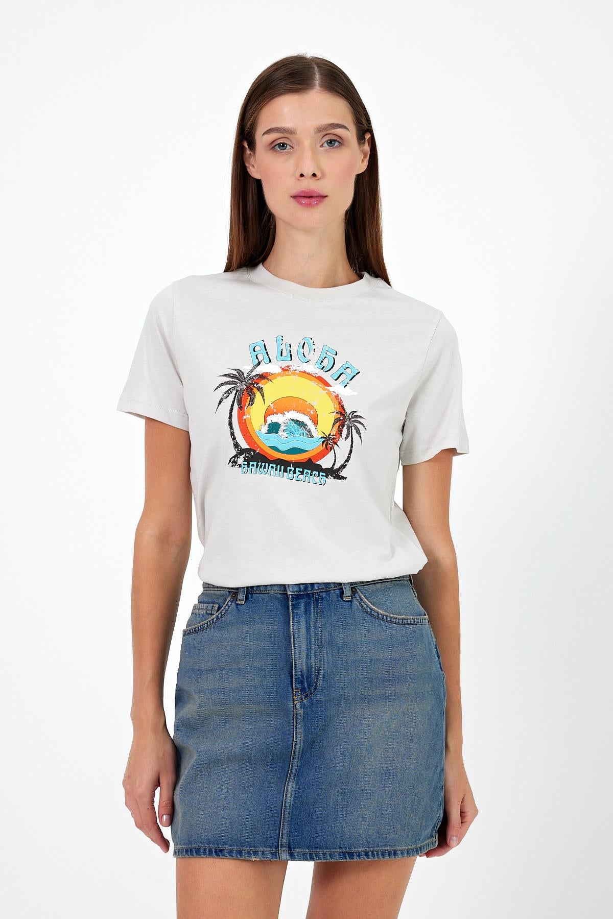 Kadın Aloha Baskılı Bisiklet Yaka Tişört %100 Pamuk - Taş