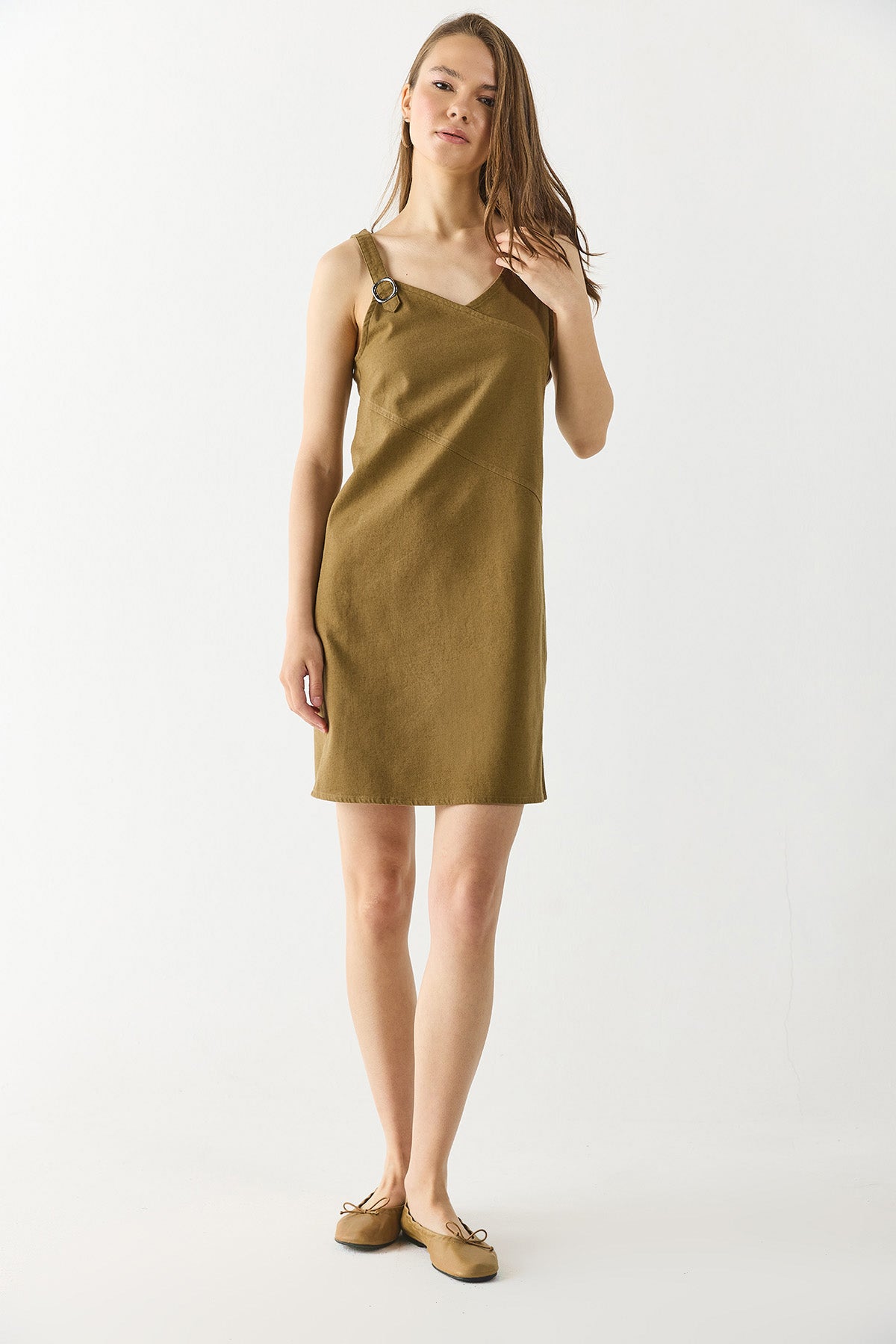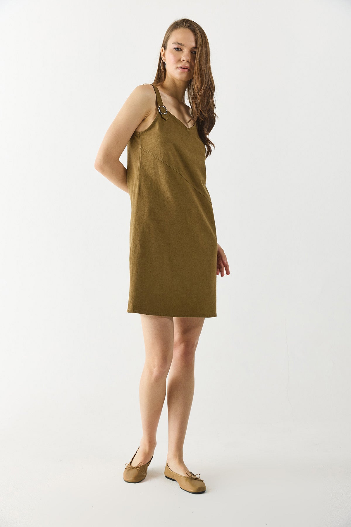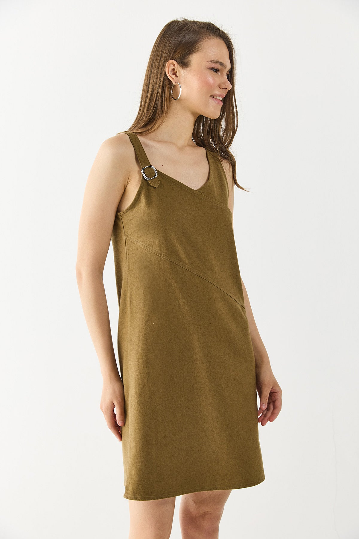 Kadın Angelica Regular Fit Keten Elbise - Yağ Yeşili