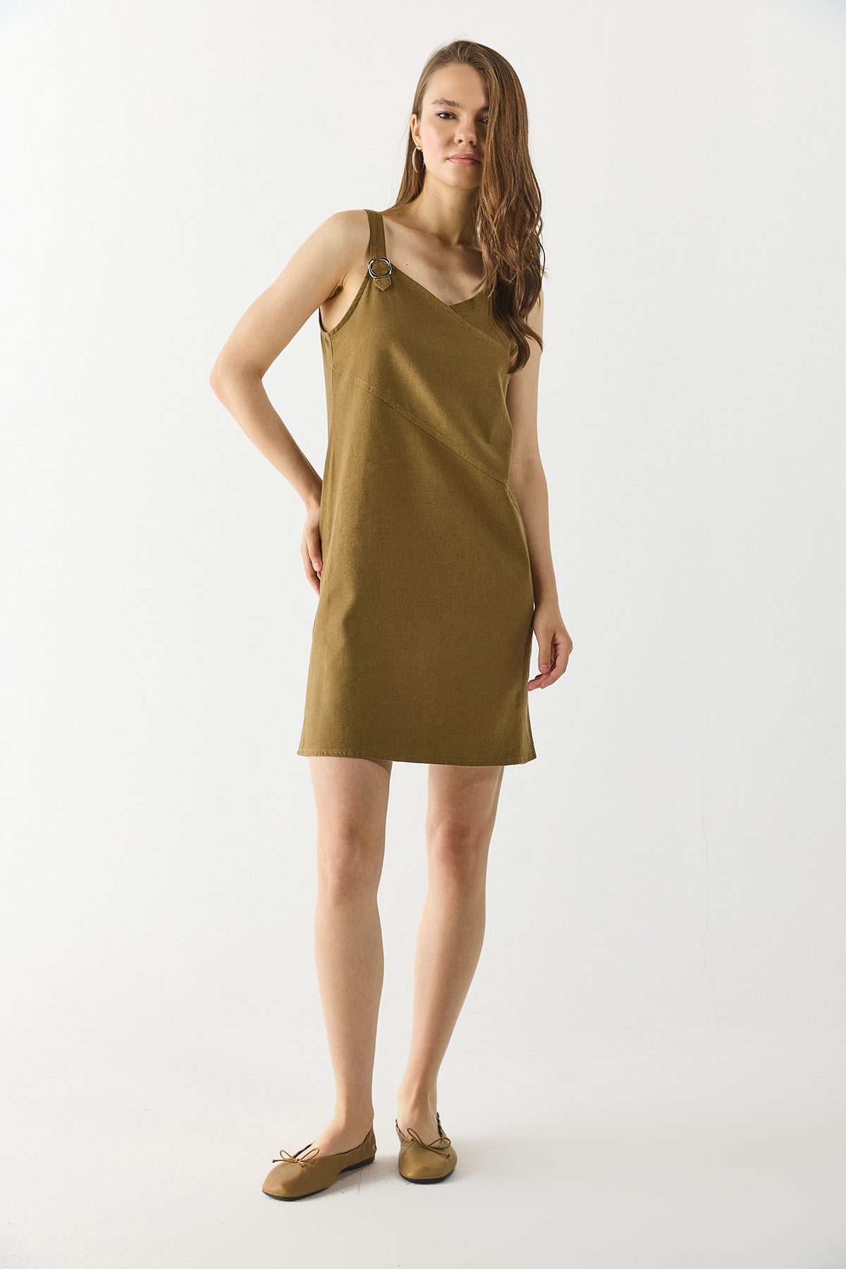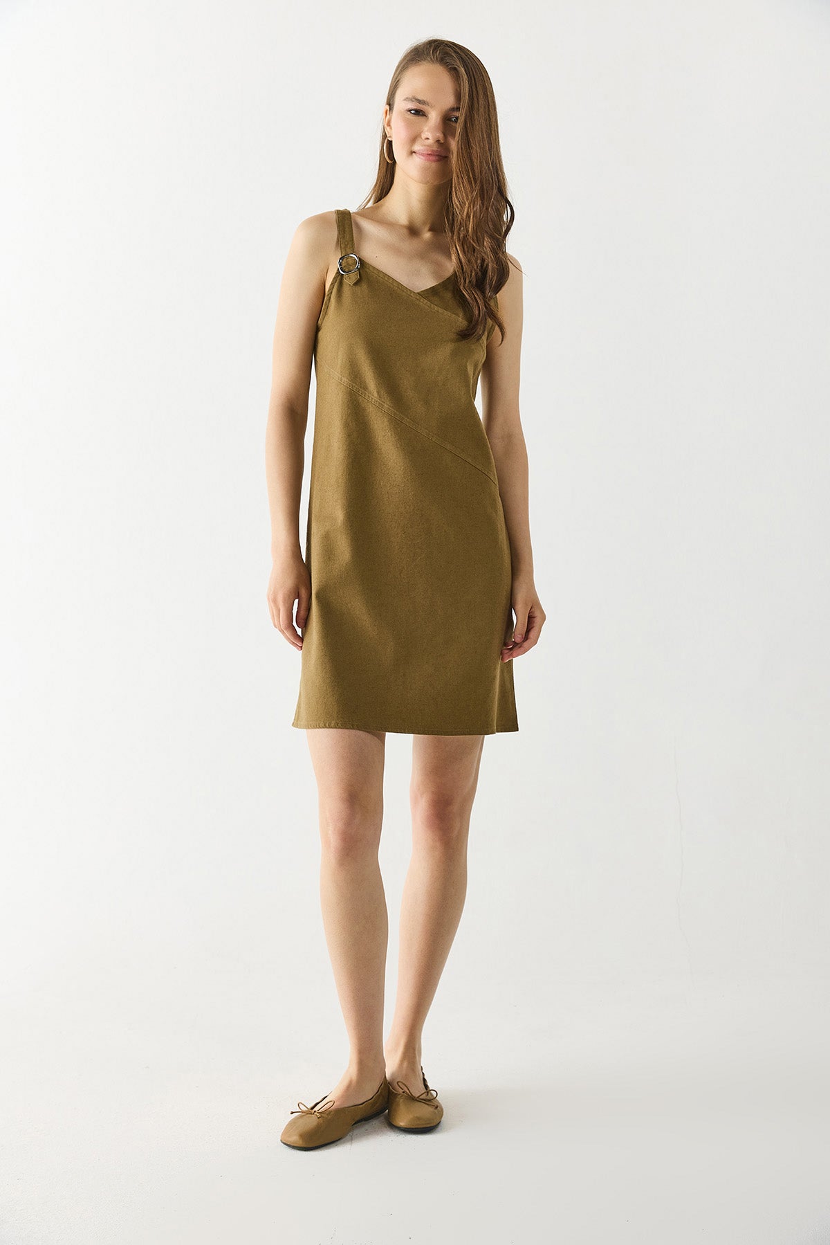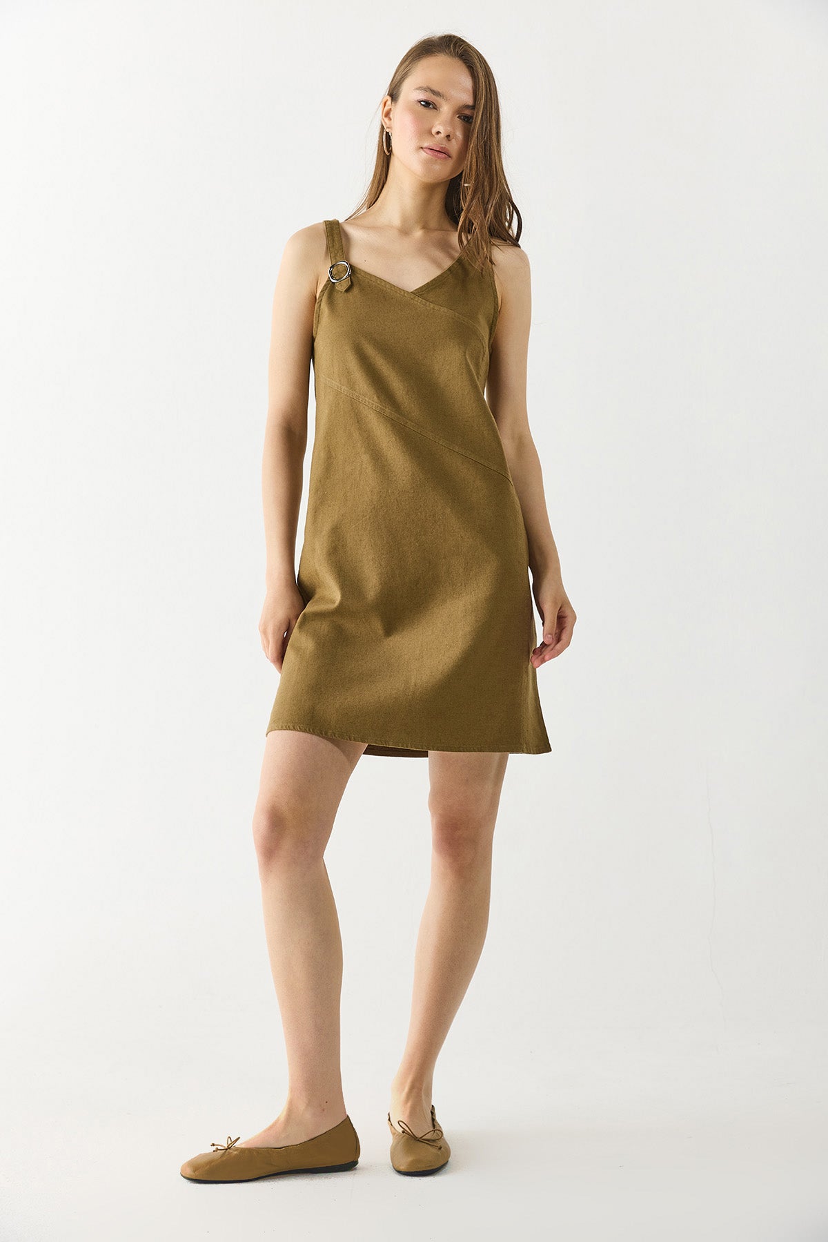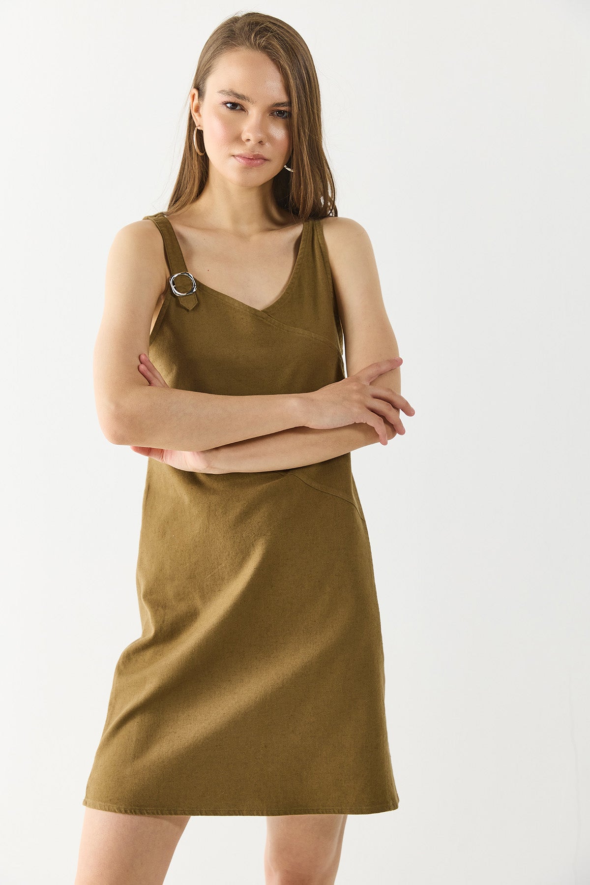 Kadın Angelica Regular Fit Keten Elbise - Yağ Yeşili