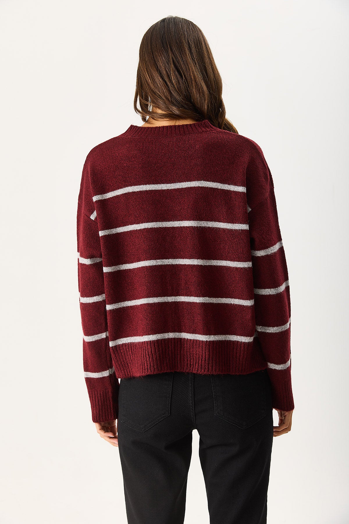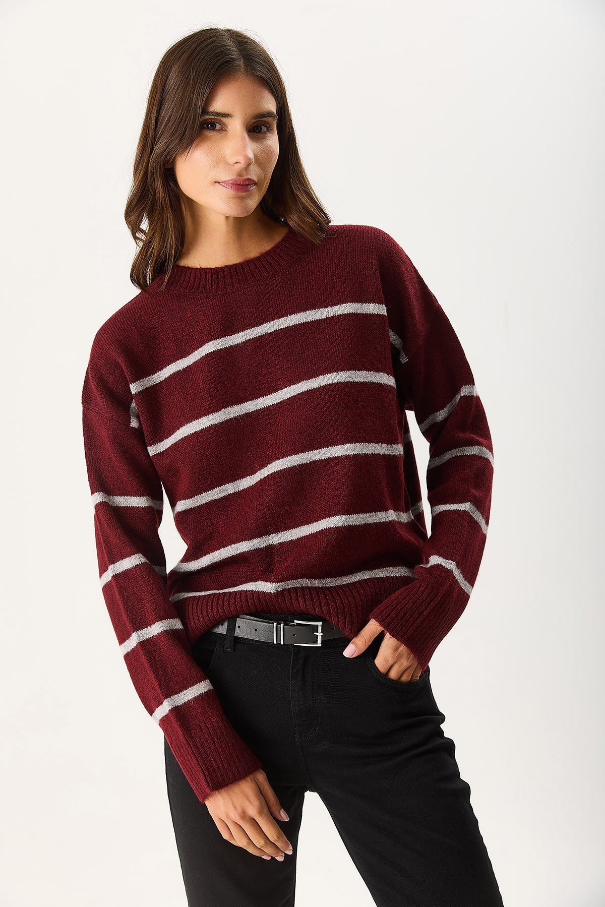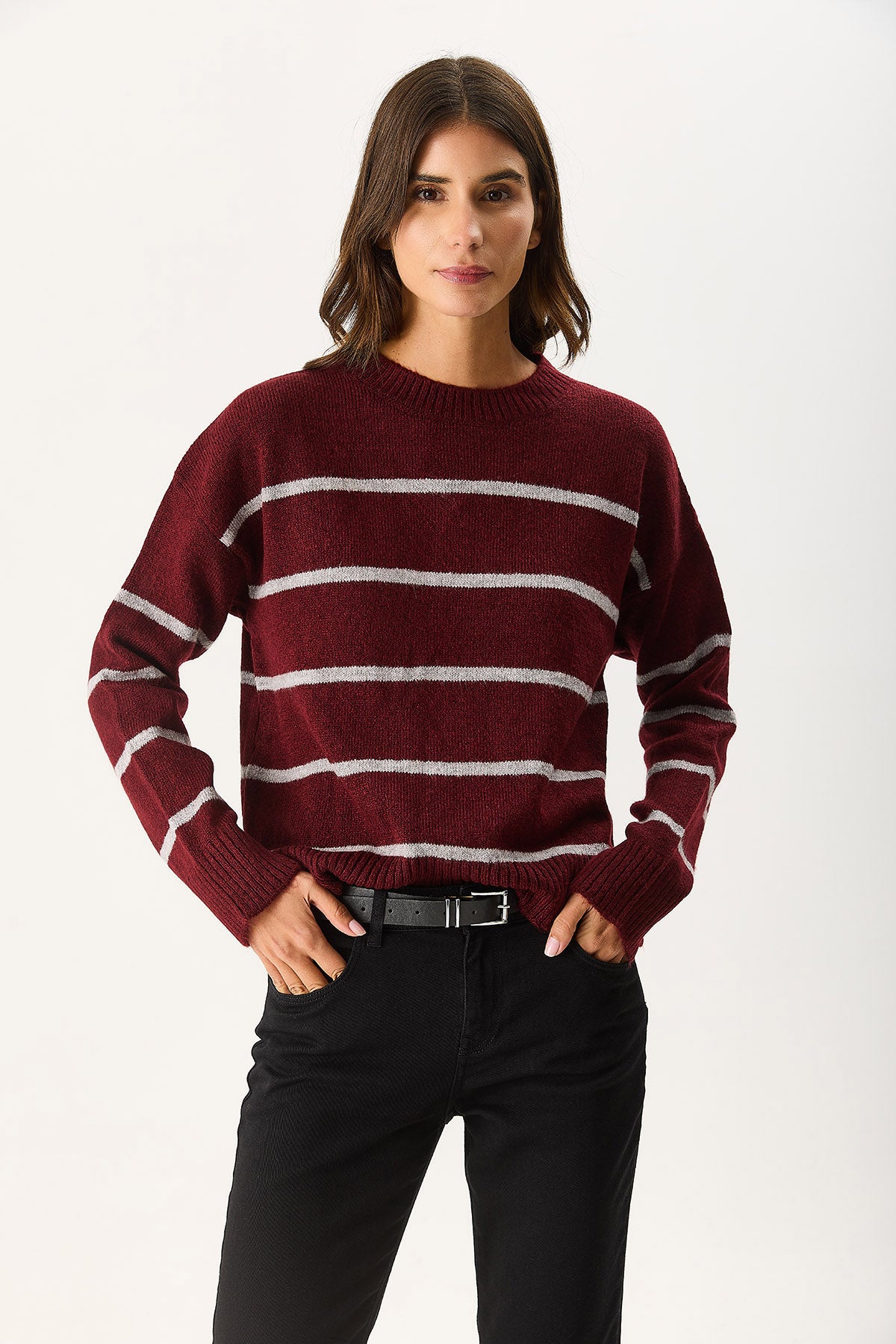 Kadın Anita Bisiklet Yaka Çizgili Triko Kazak - Bordo - Gri Çizgili