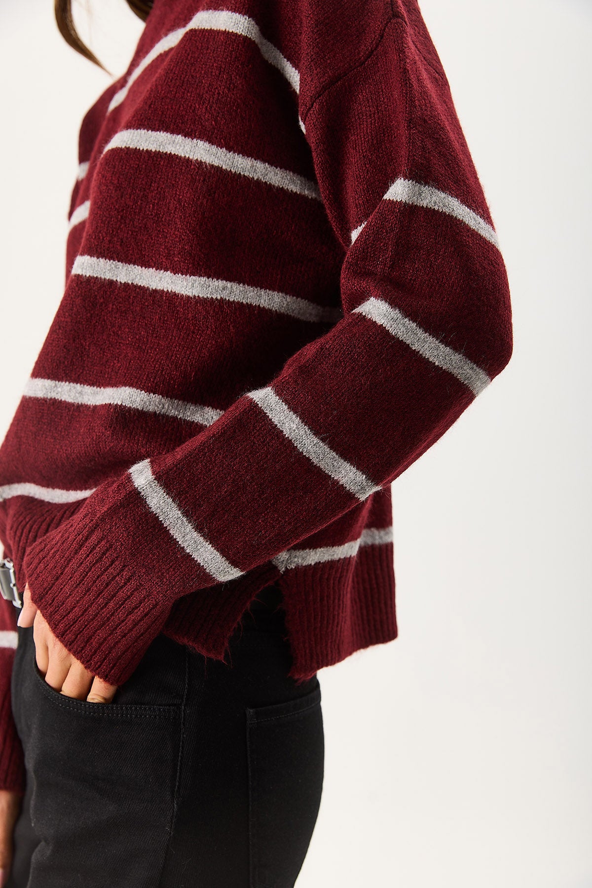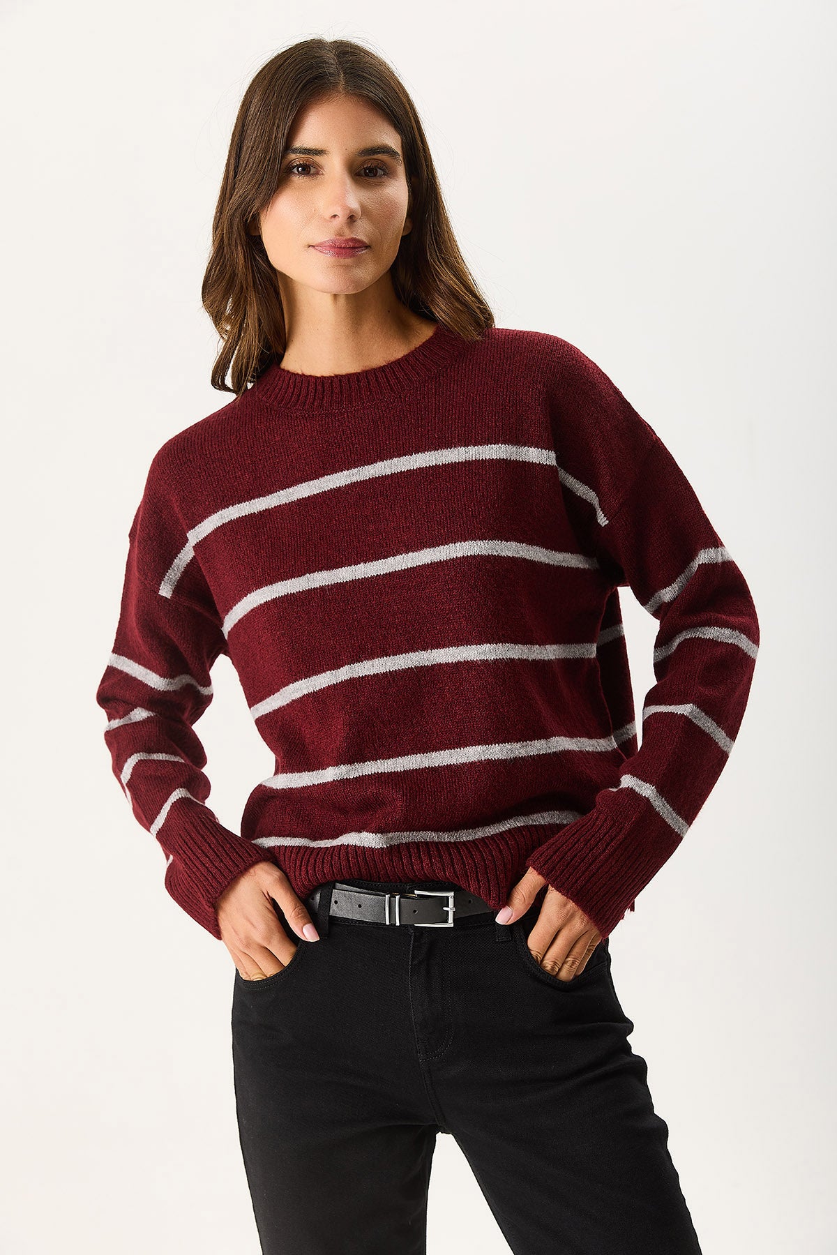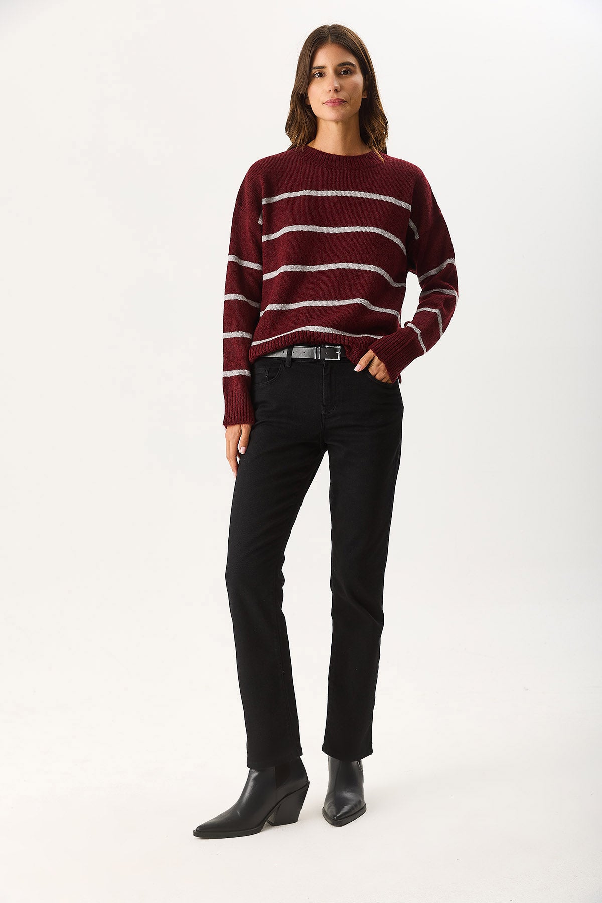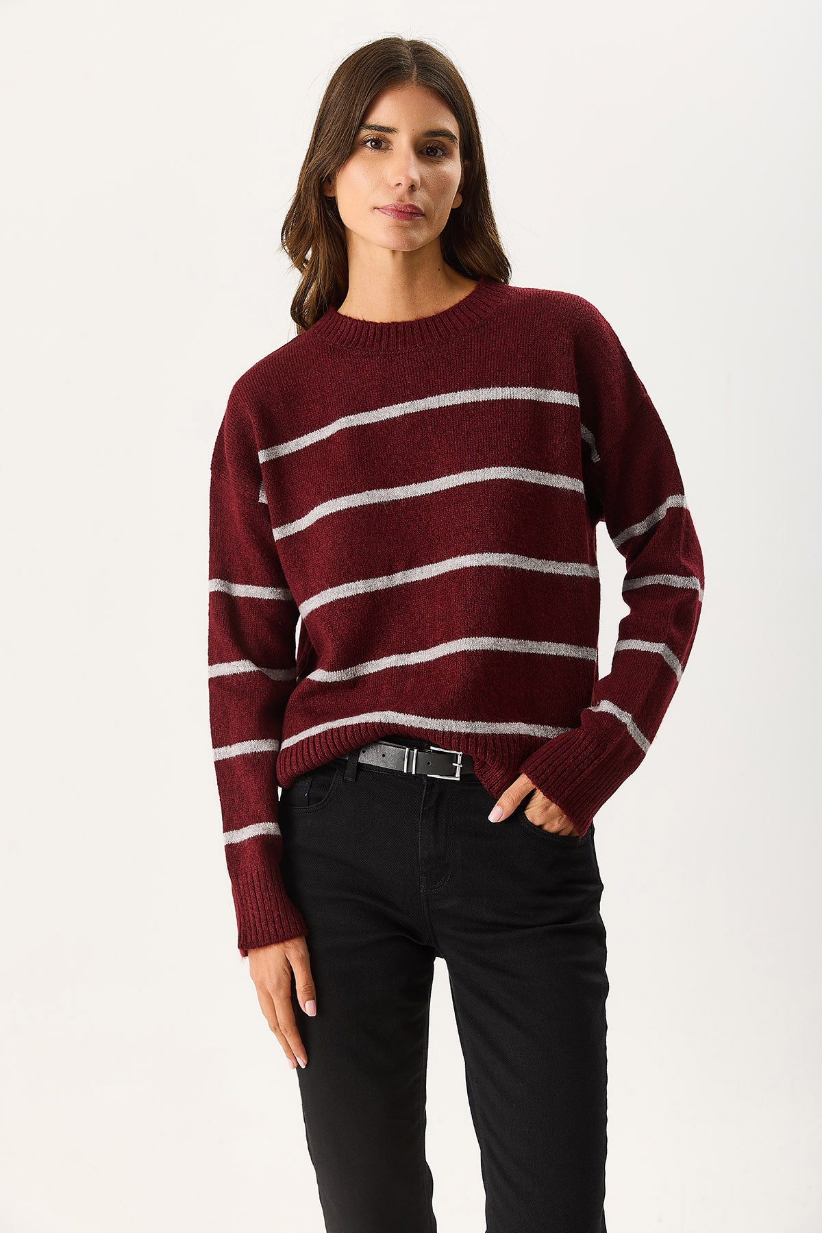 Kadın Anita Bisiklet Yaka Çizgili Triko Kazak - Bordo - Gri Çizgili