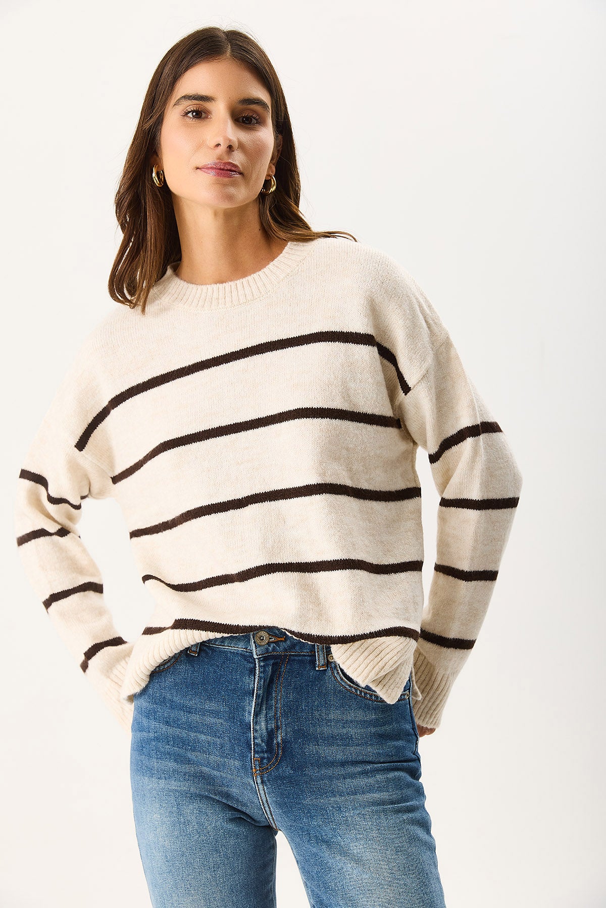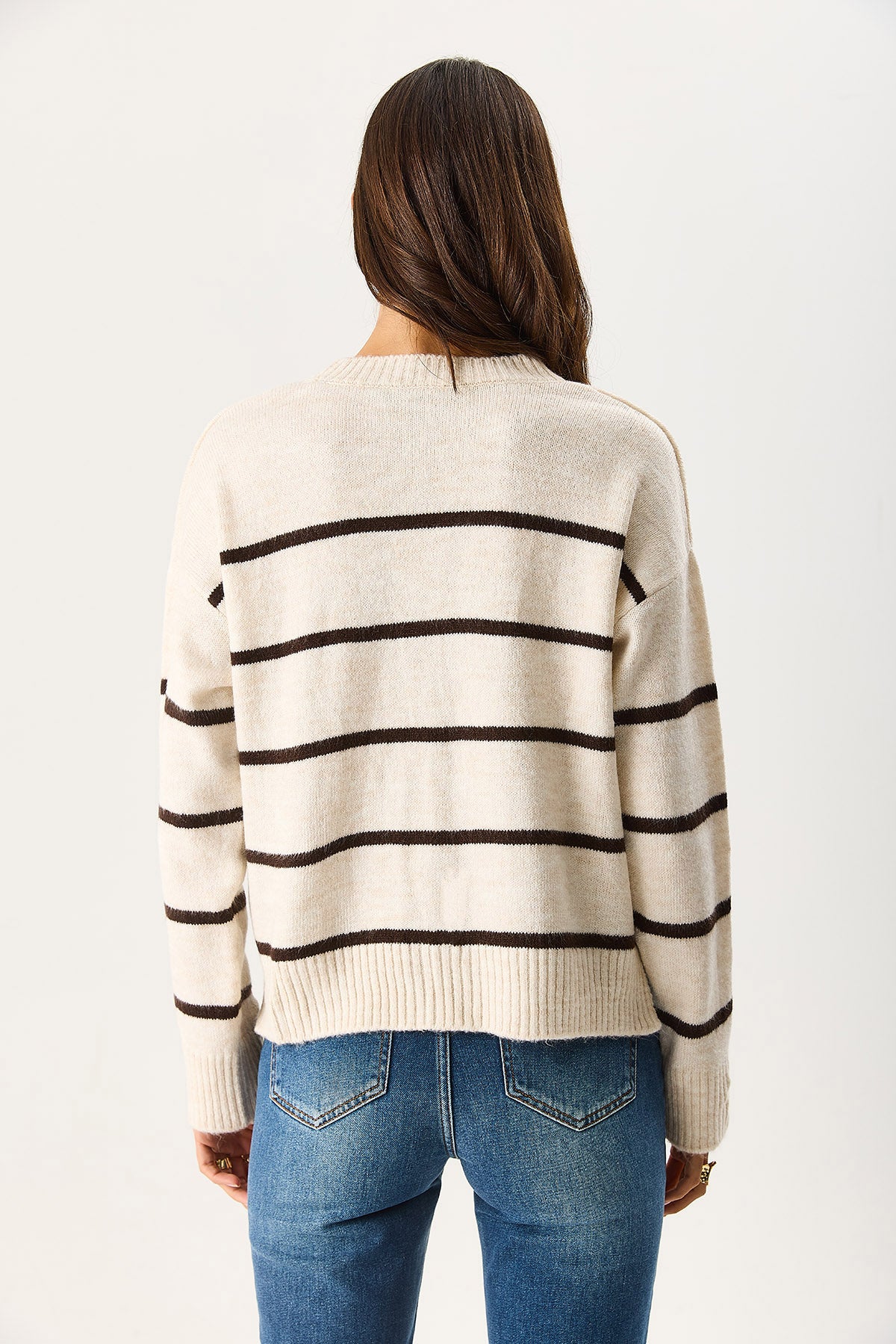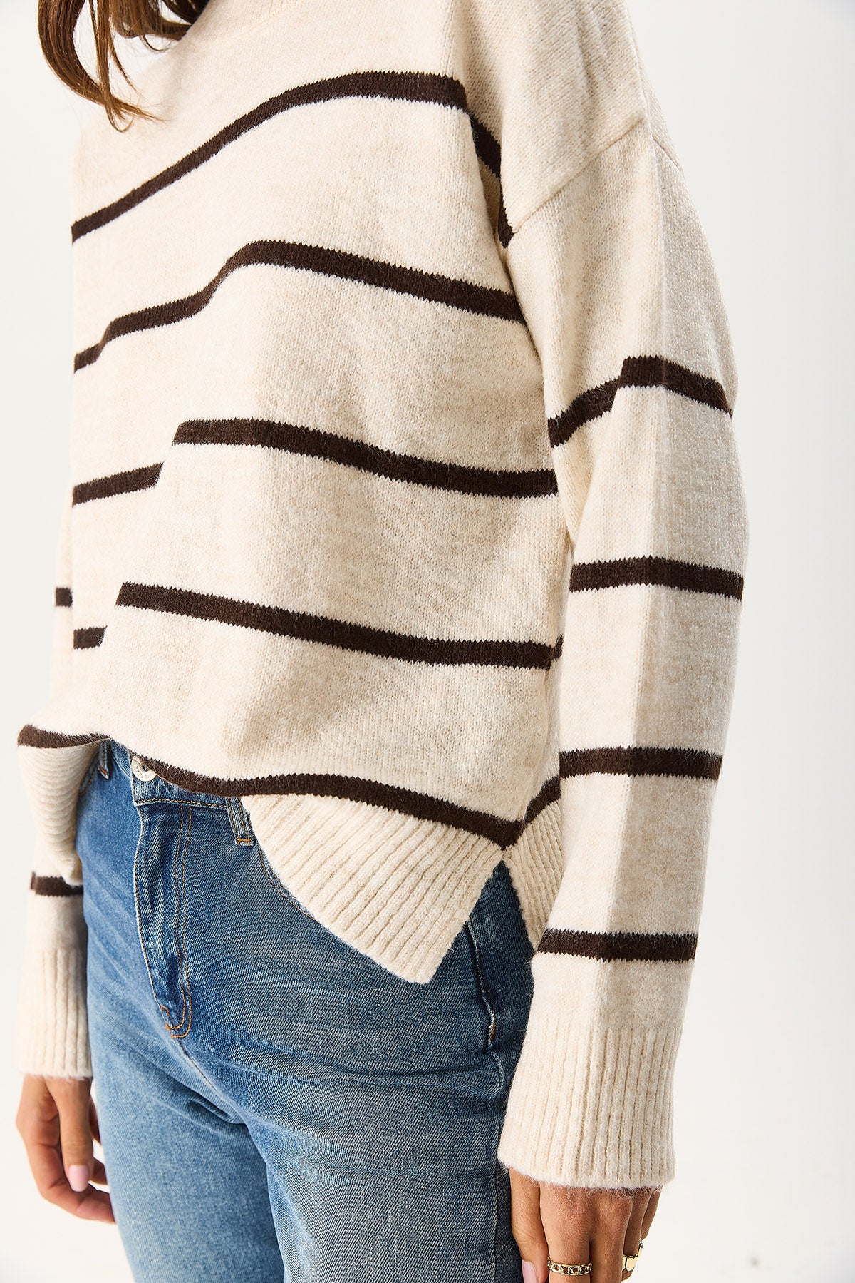 Kadın Anita Bisiklet Yaka Çizgili Triko Kazak - Fildişi - Kahverengi Çizgili