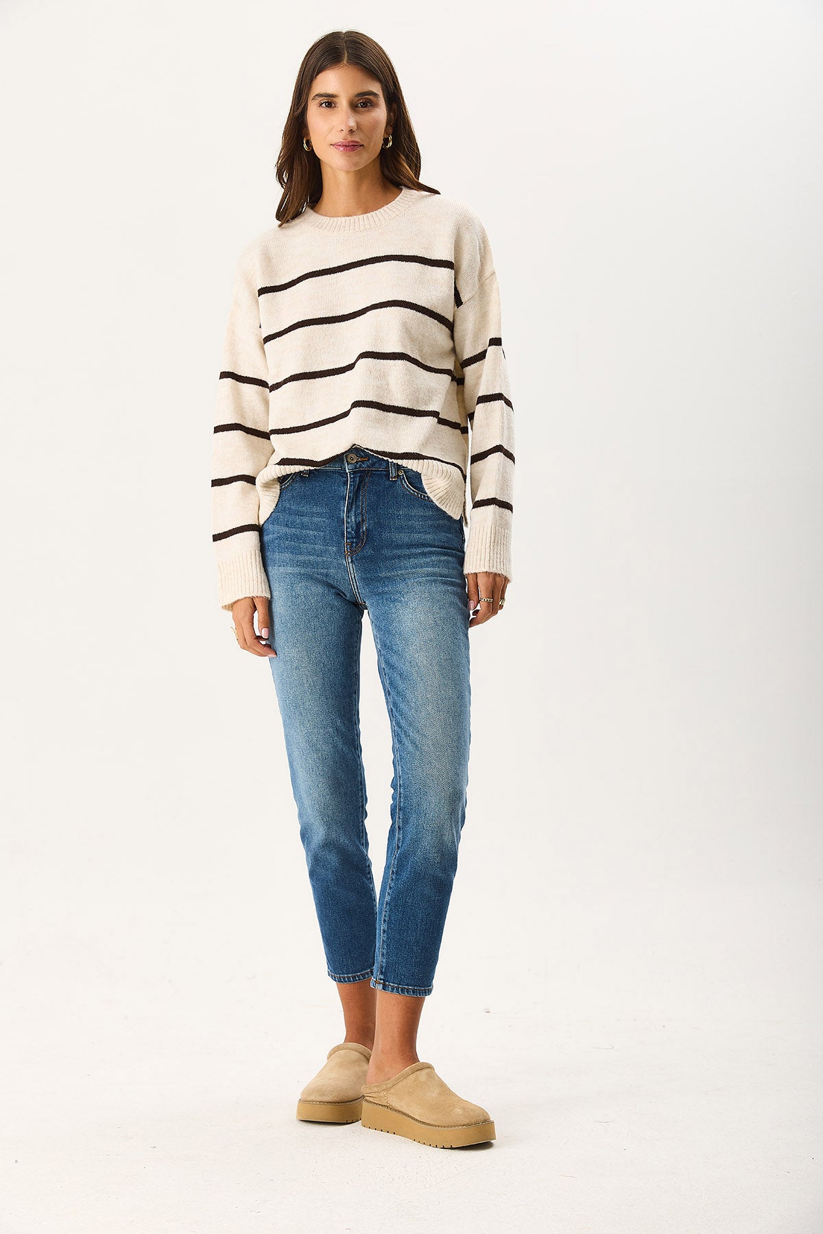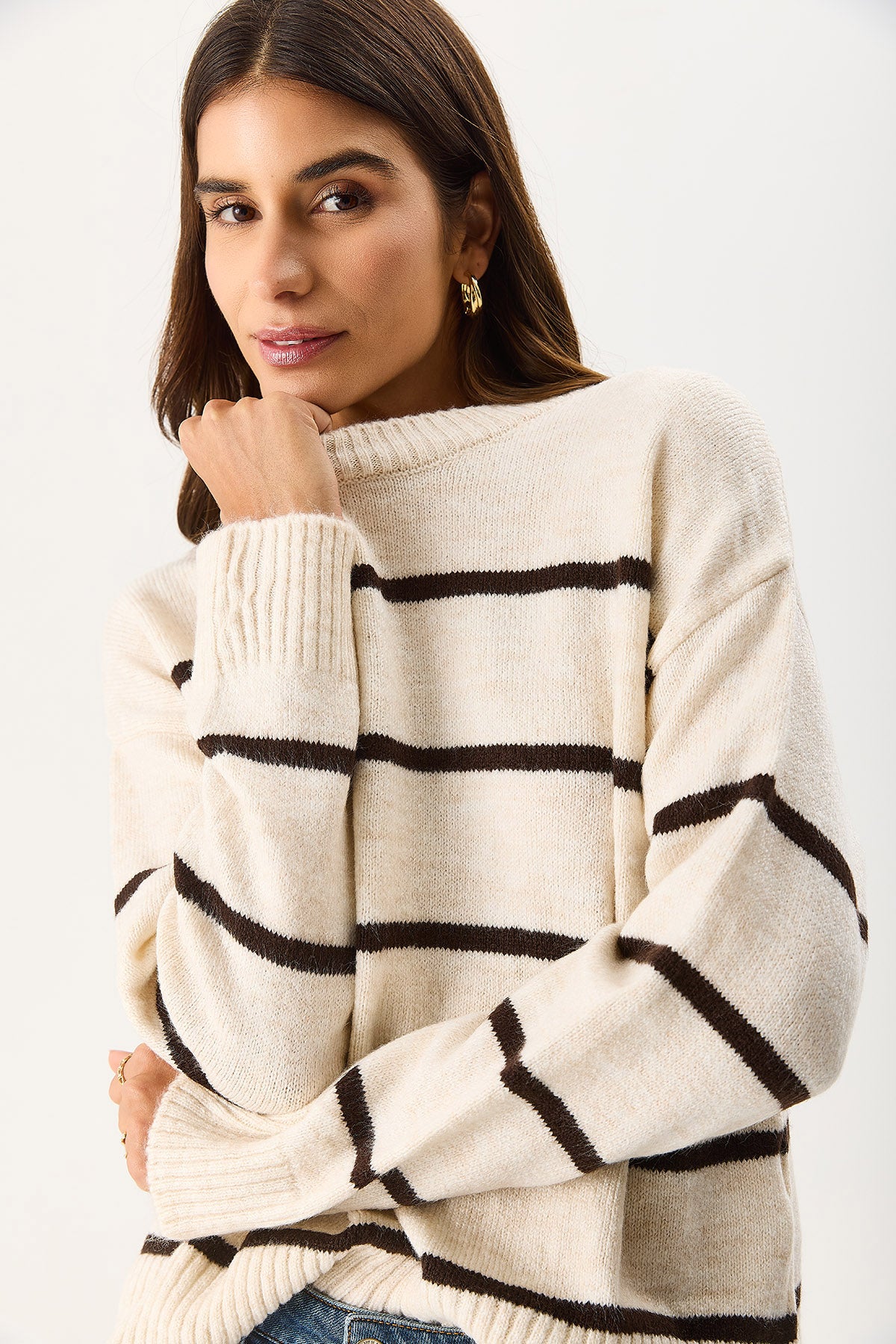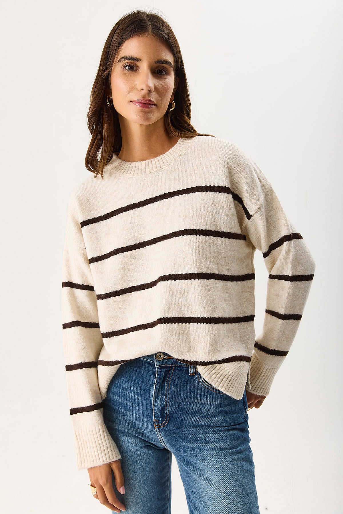 Kadın Anita Bisiklet Yaka Çizgili Triko Kazak - Fildişi - Kahverengi Çizgili