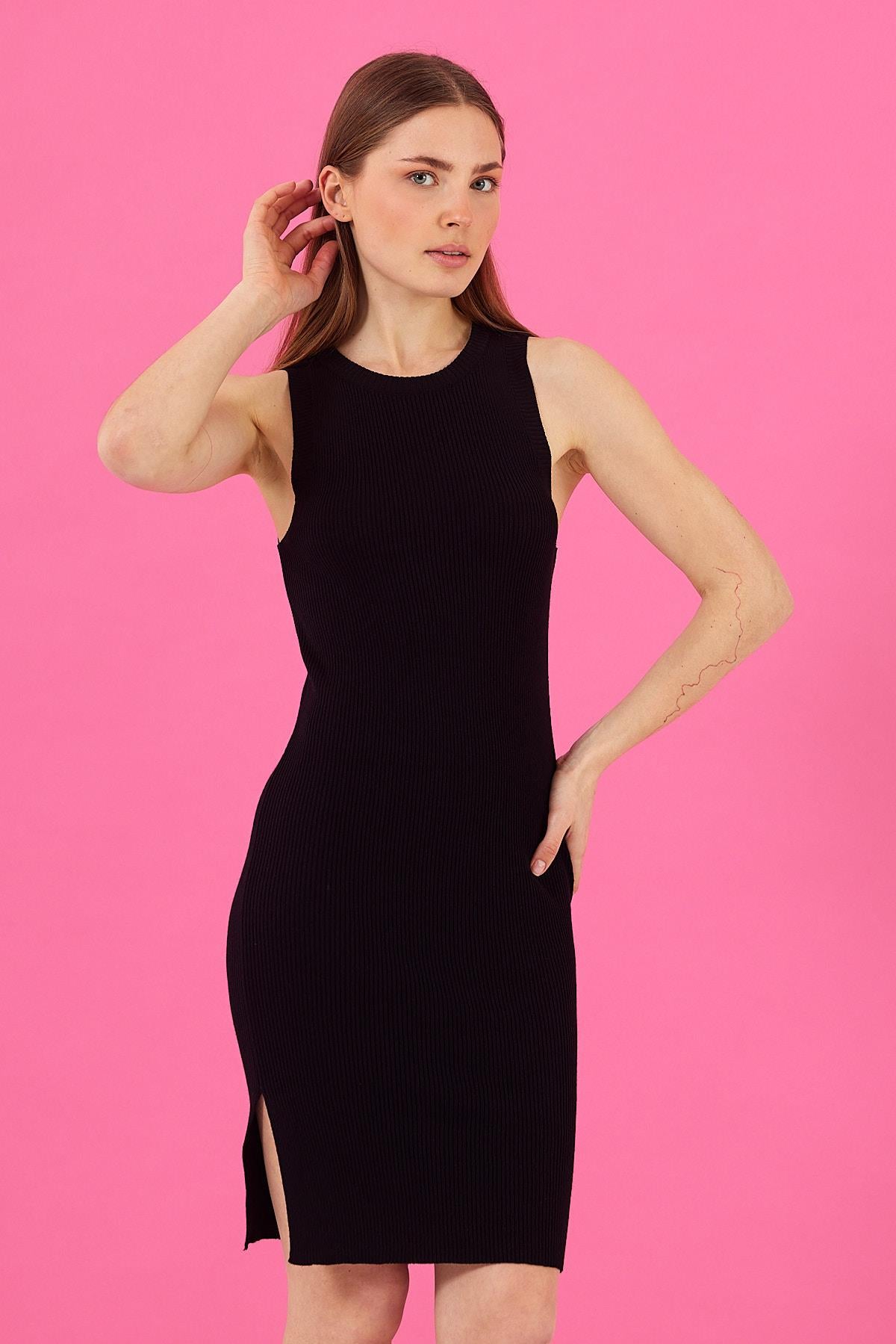 Kadın Ashley Bisiklet Yaka Slim Fit Triko Elbise - Siyah