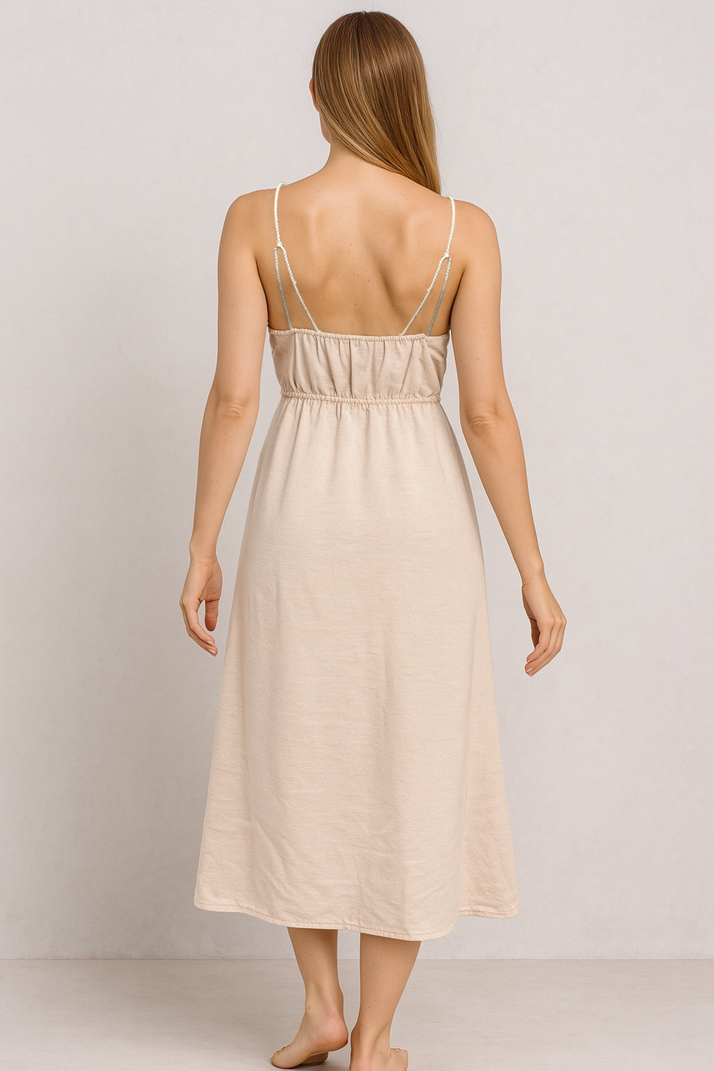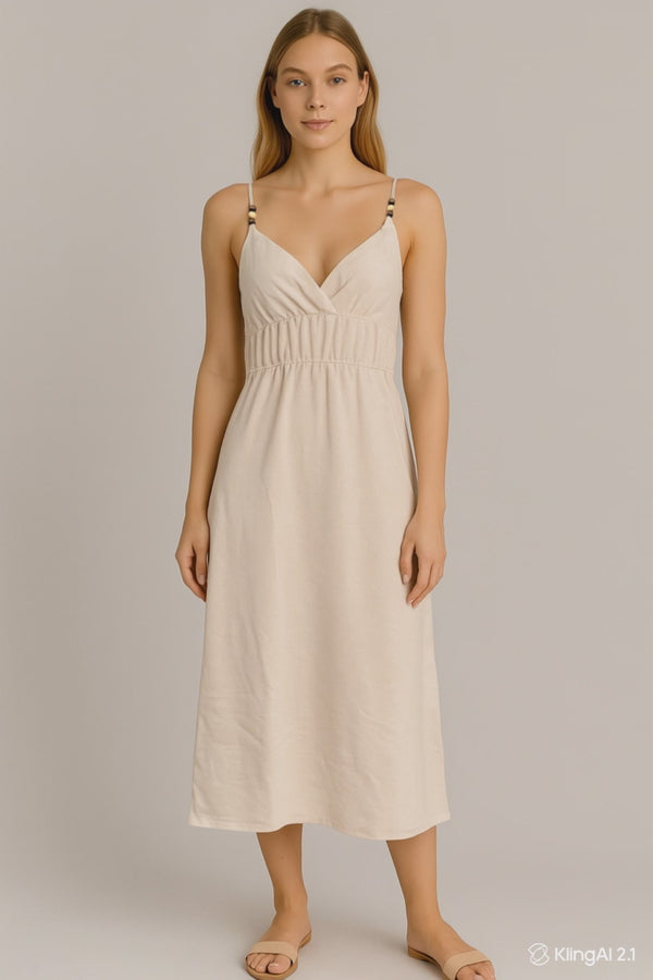Kadın Askılı Boncuklu Keten Midi Boy Elbise - Naturel