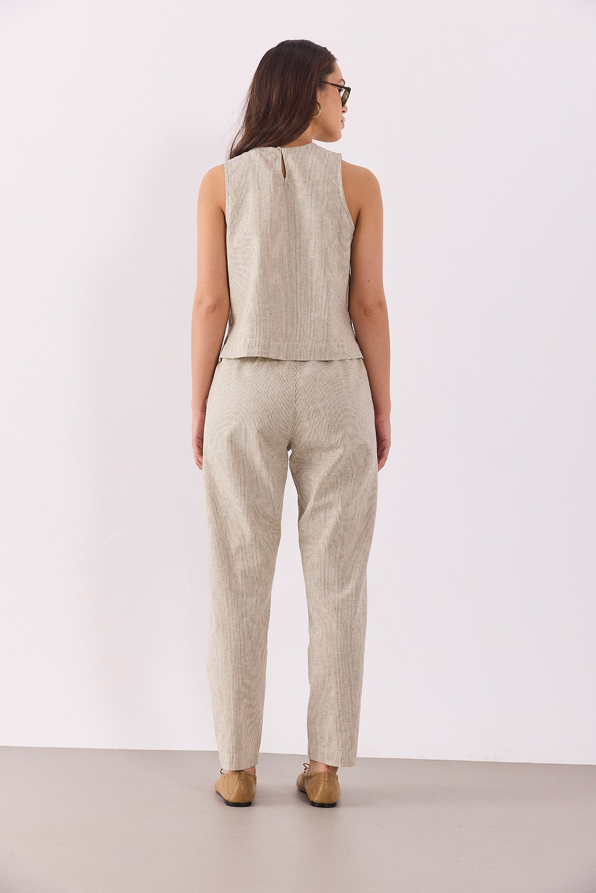 Kadın Beli Lastikli Çizgili Keten Pantolon - Haki Çizgili