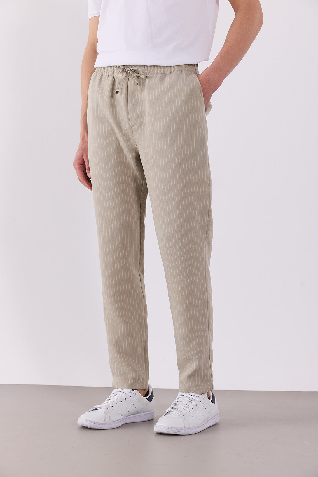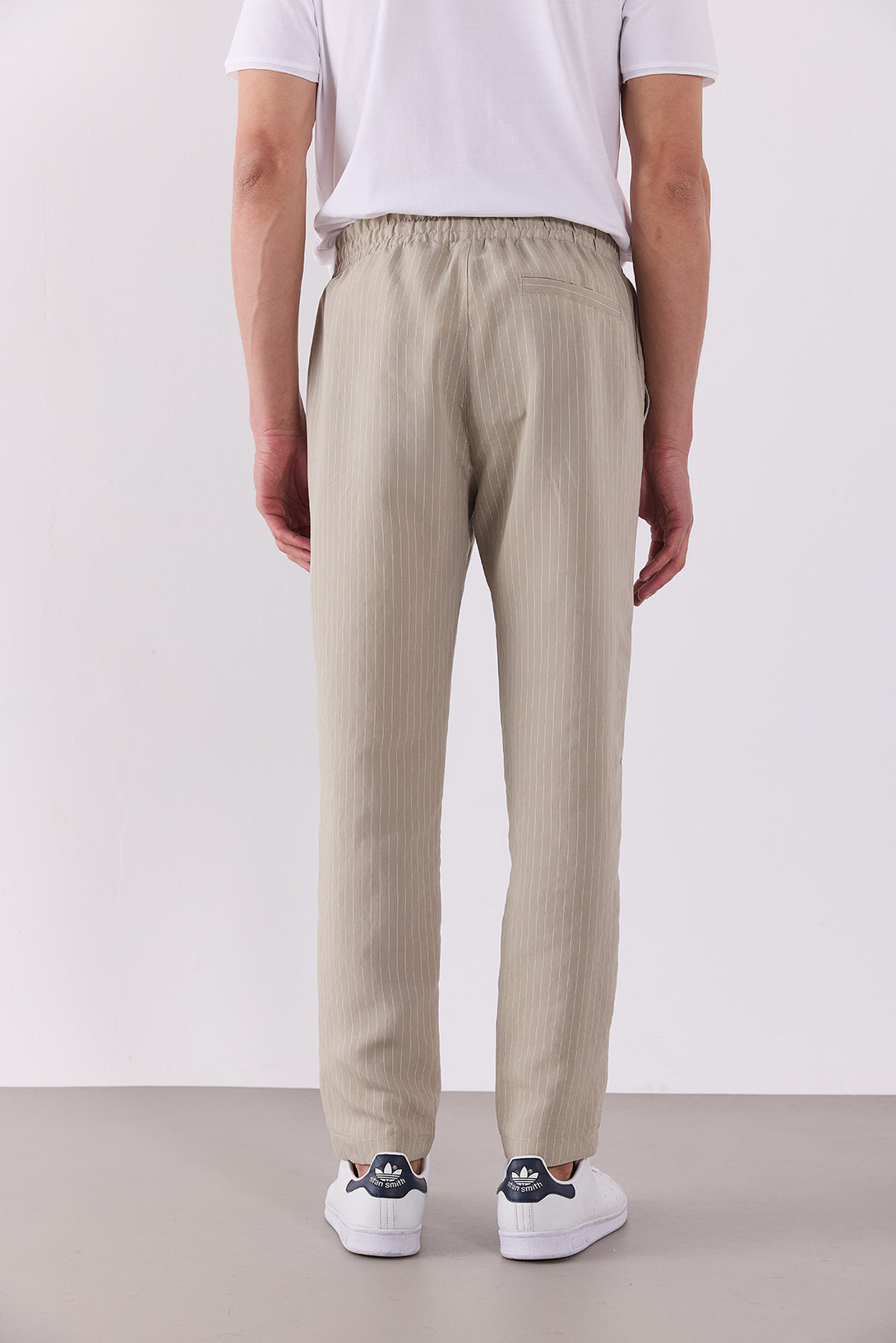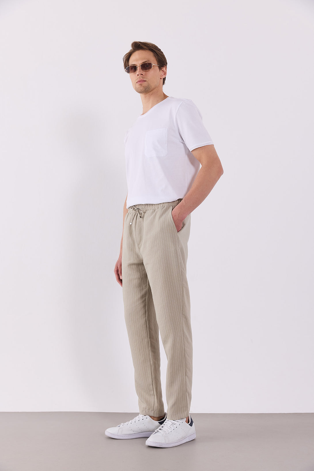 Erkek Beli Lastikli Çizgili Pantolon - Bej Çizgili
