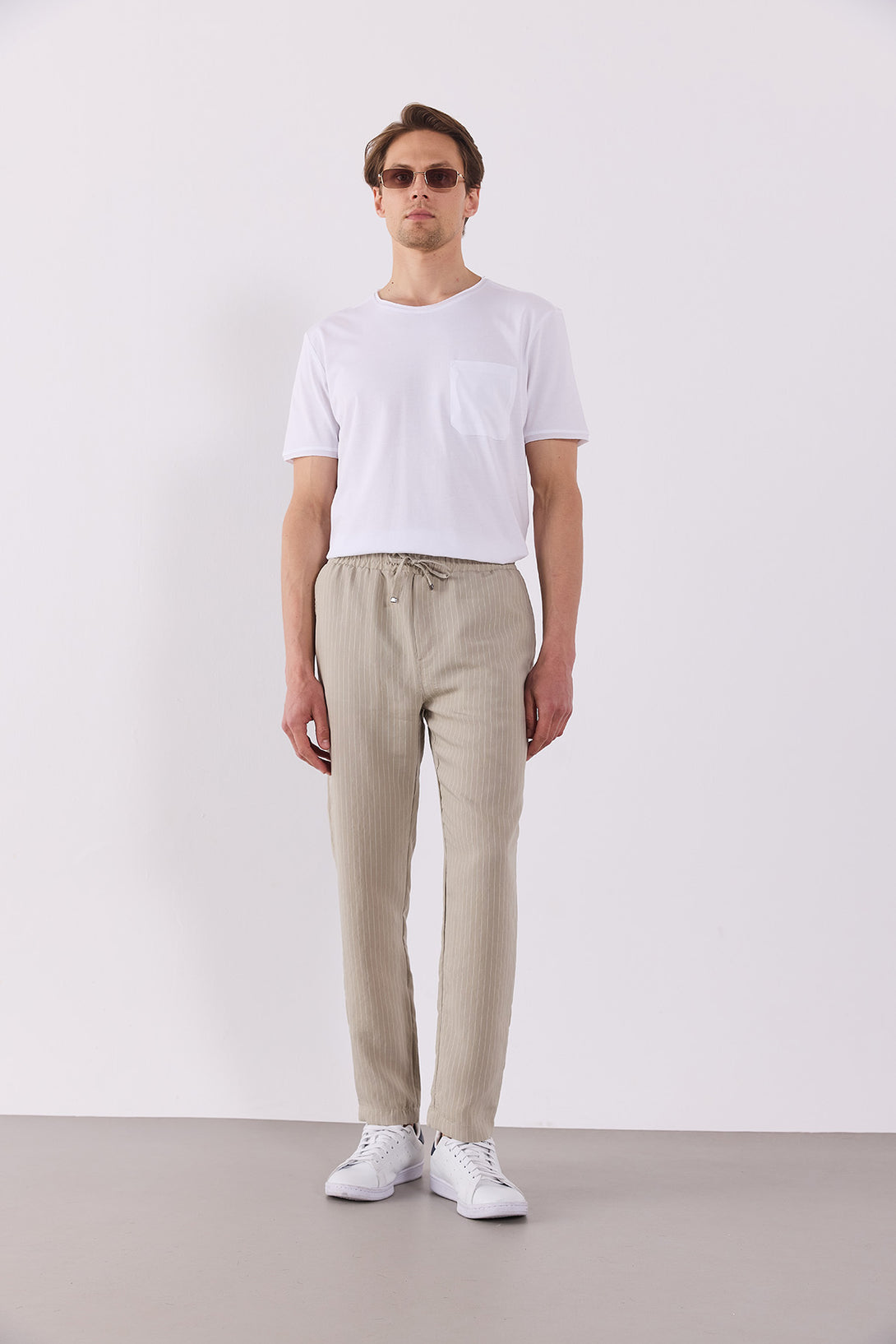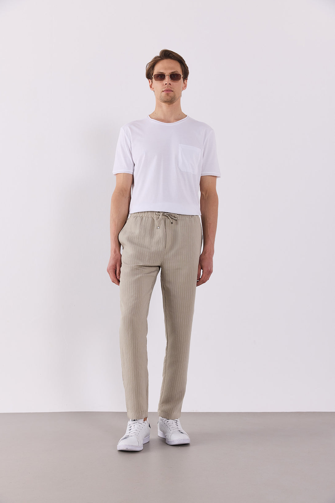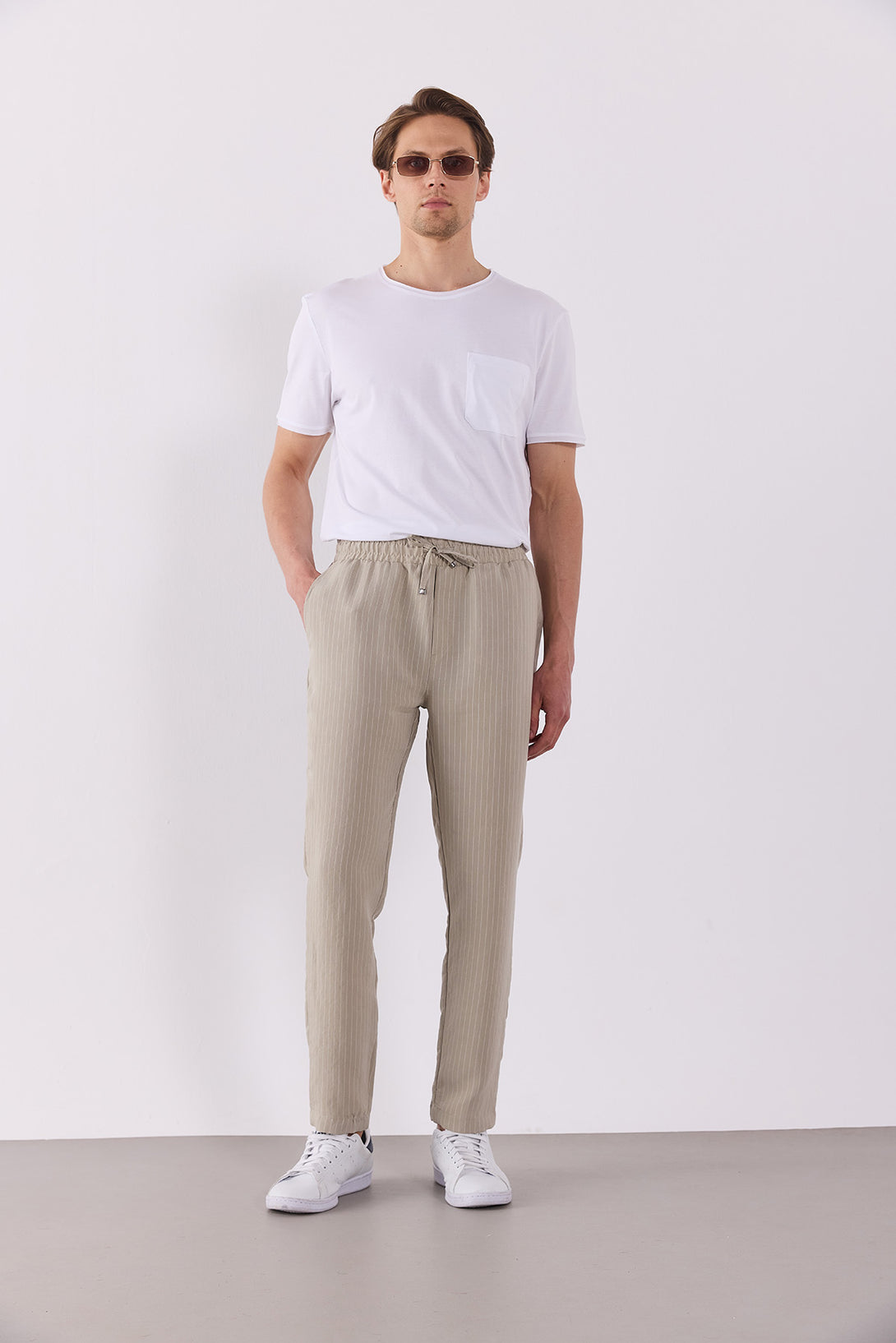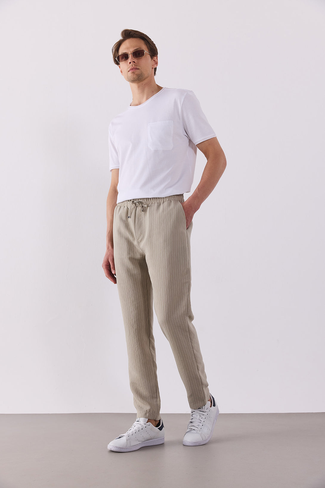 Erkek Beli Lastikli Çizgili Pantolon - Bej Çizgili
