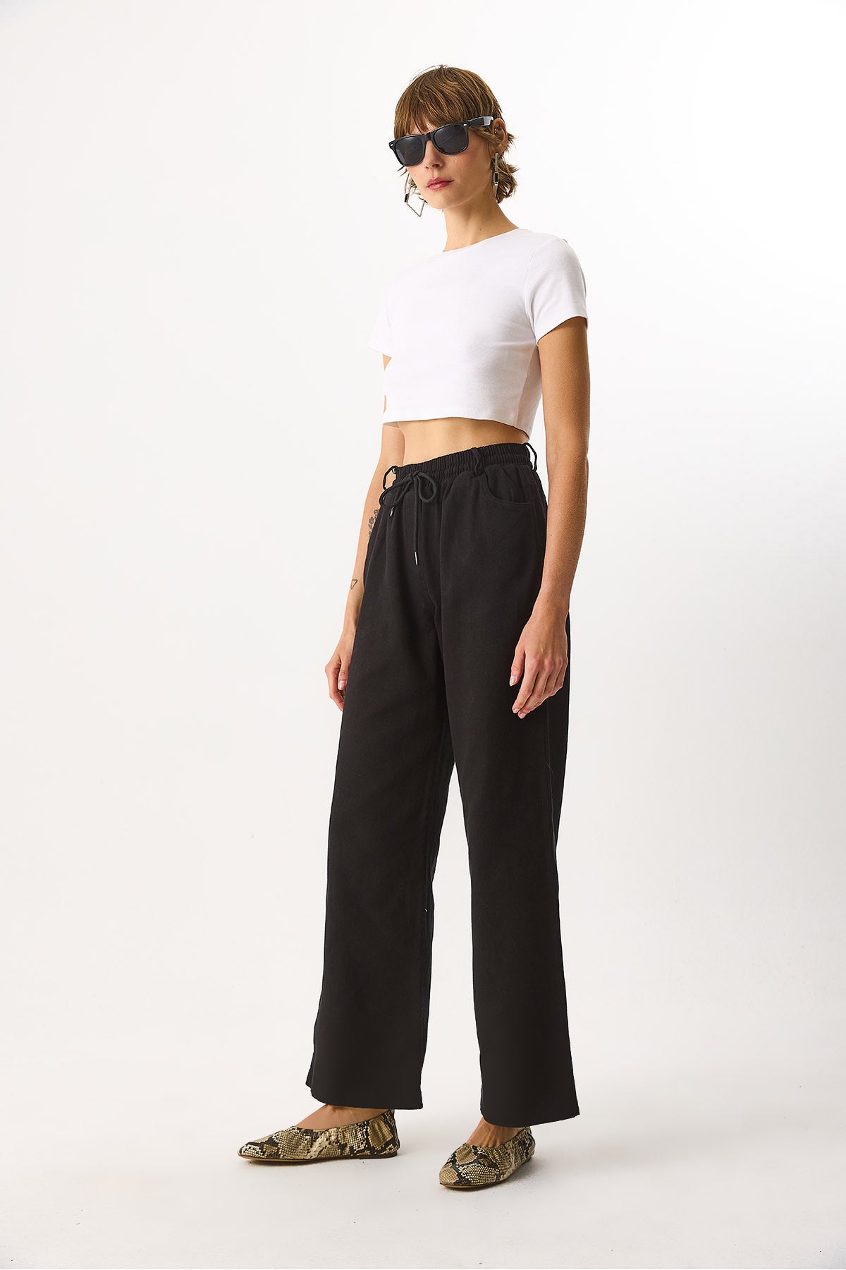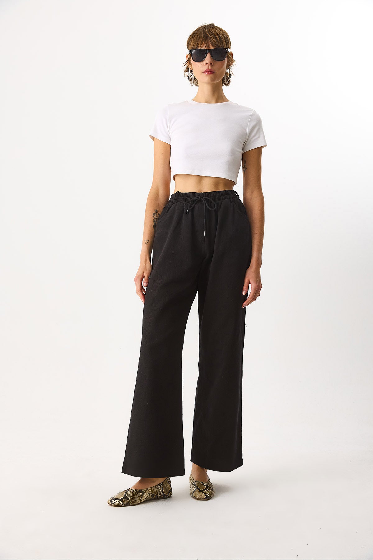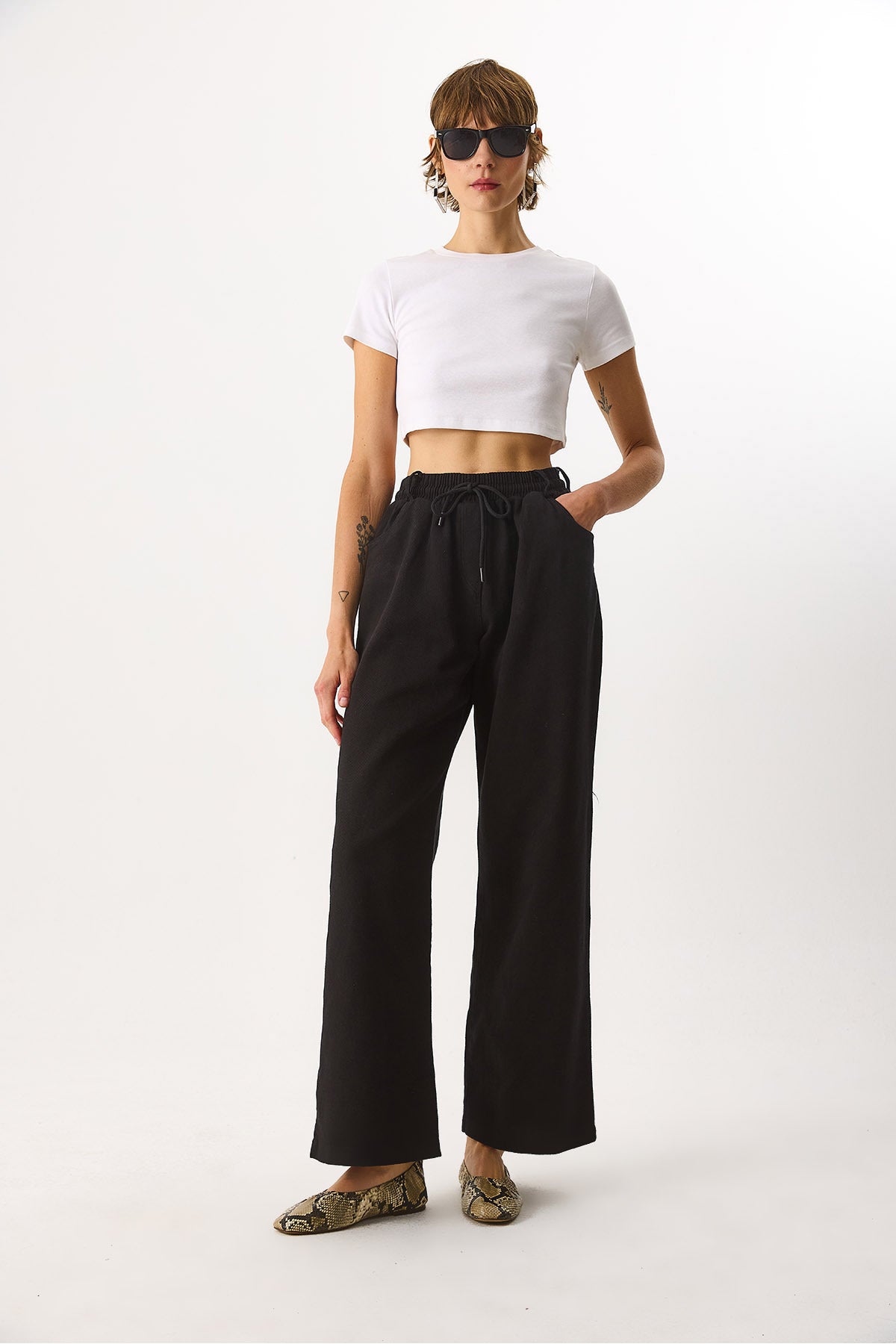 Kadın Beli Lastikli Geniş Paça Pantolon %100 Pamuk - Siyah