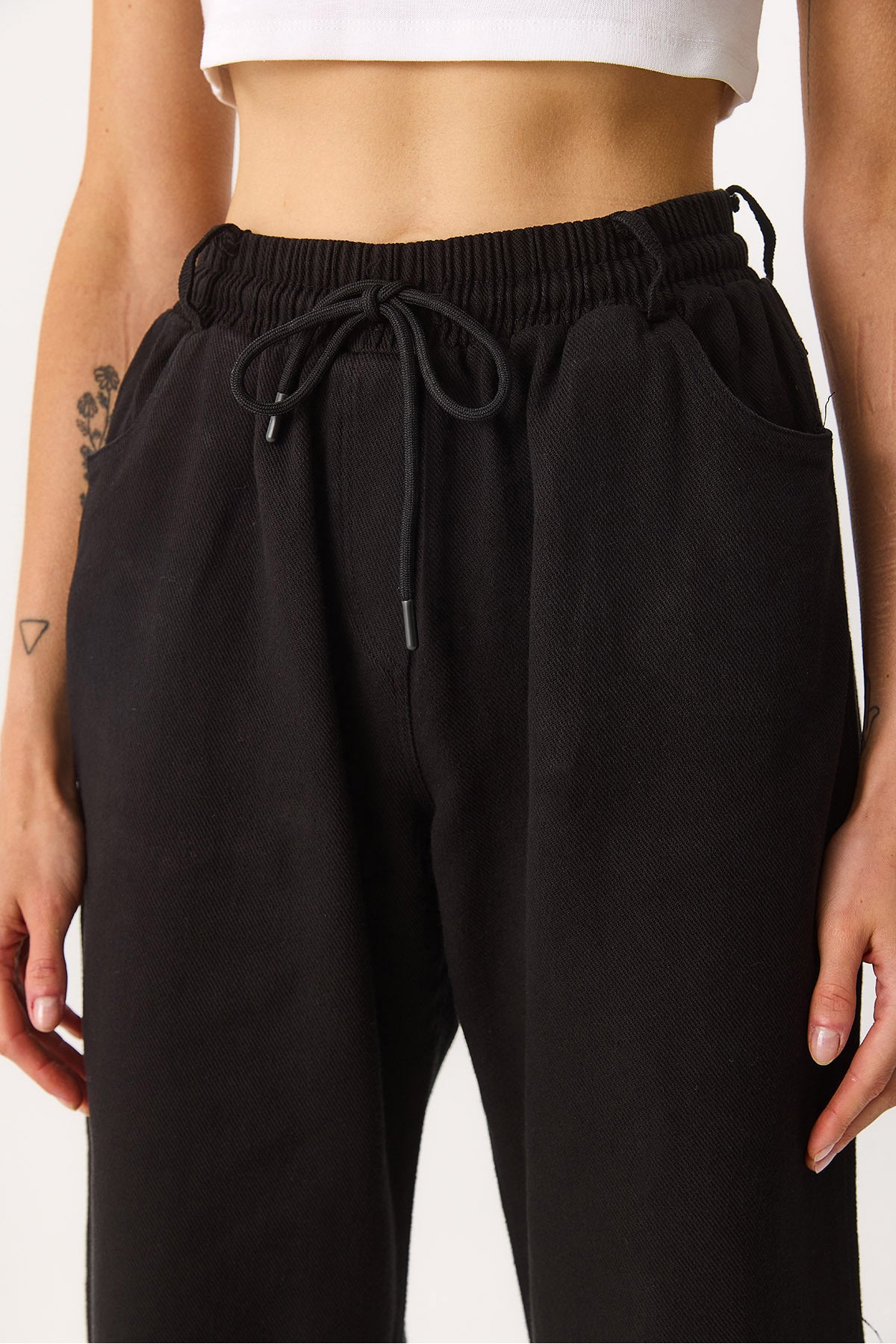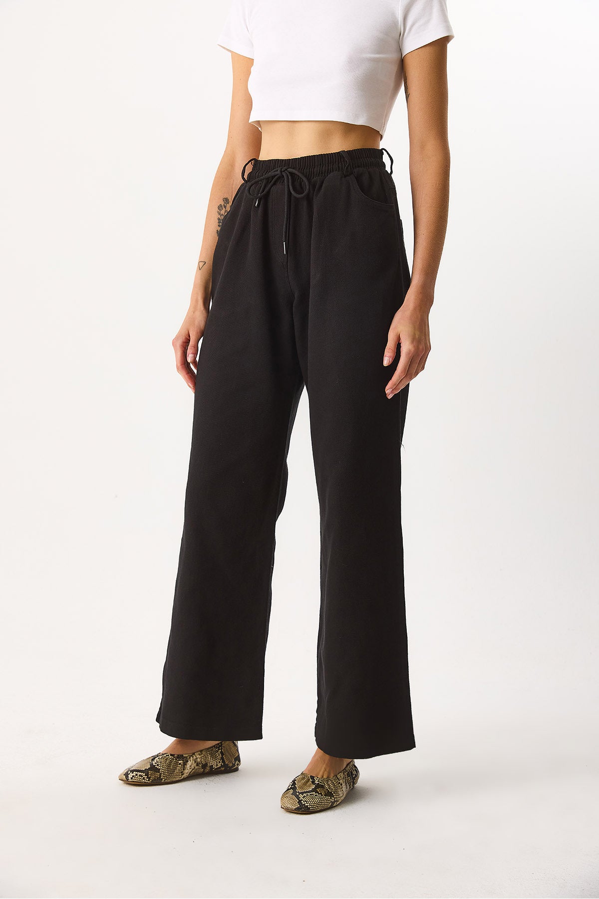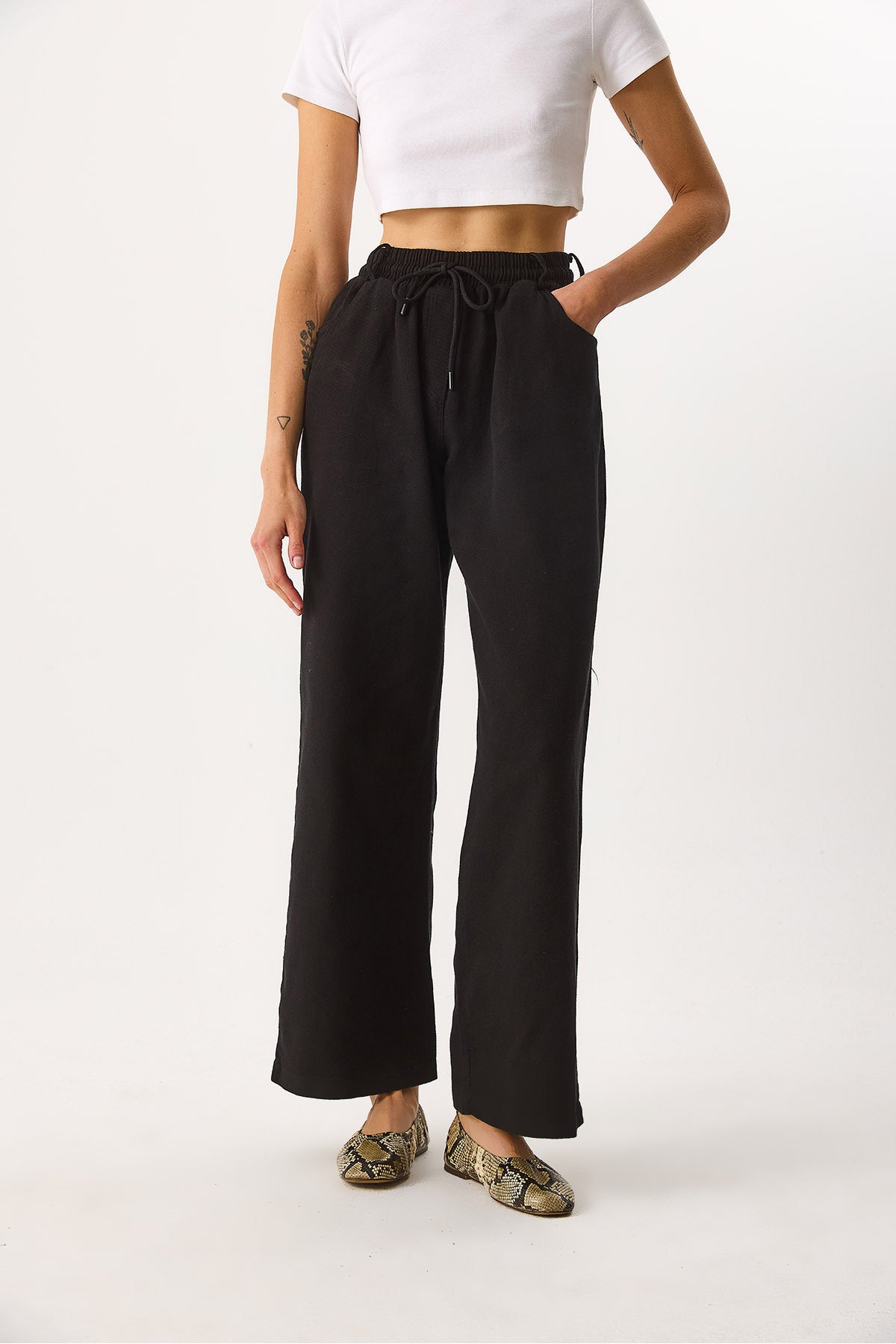 Kadın Beli Lastikli Geniş Paça Pantolon %100 Pamuk - Siyah