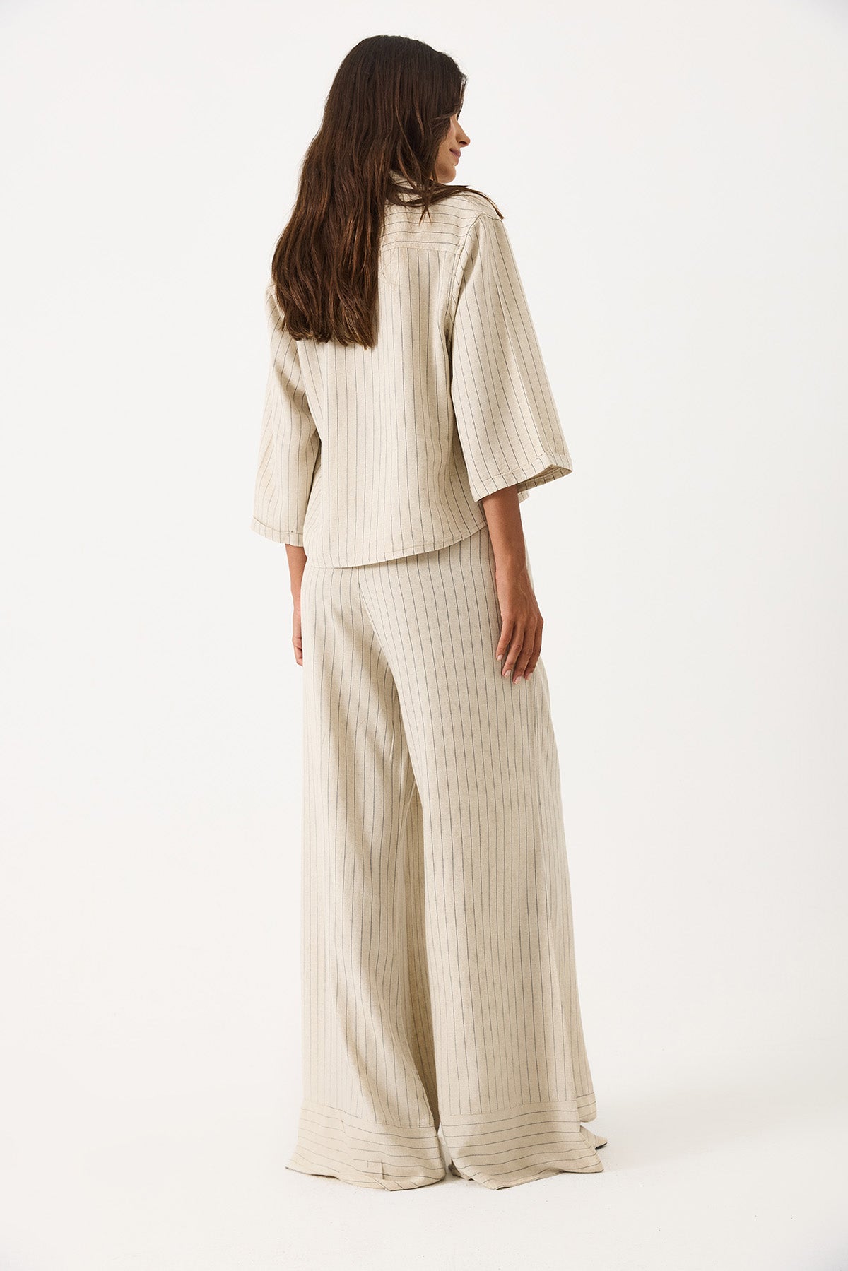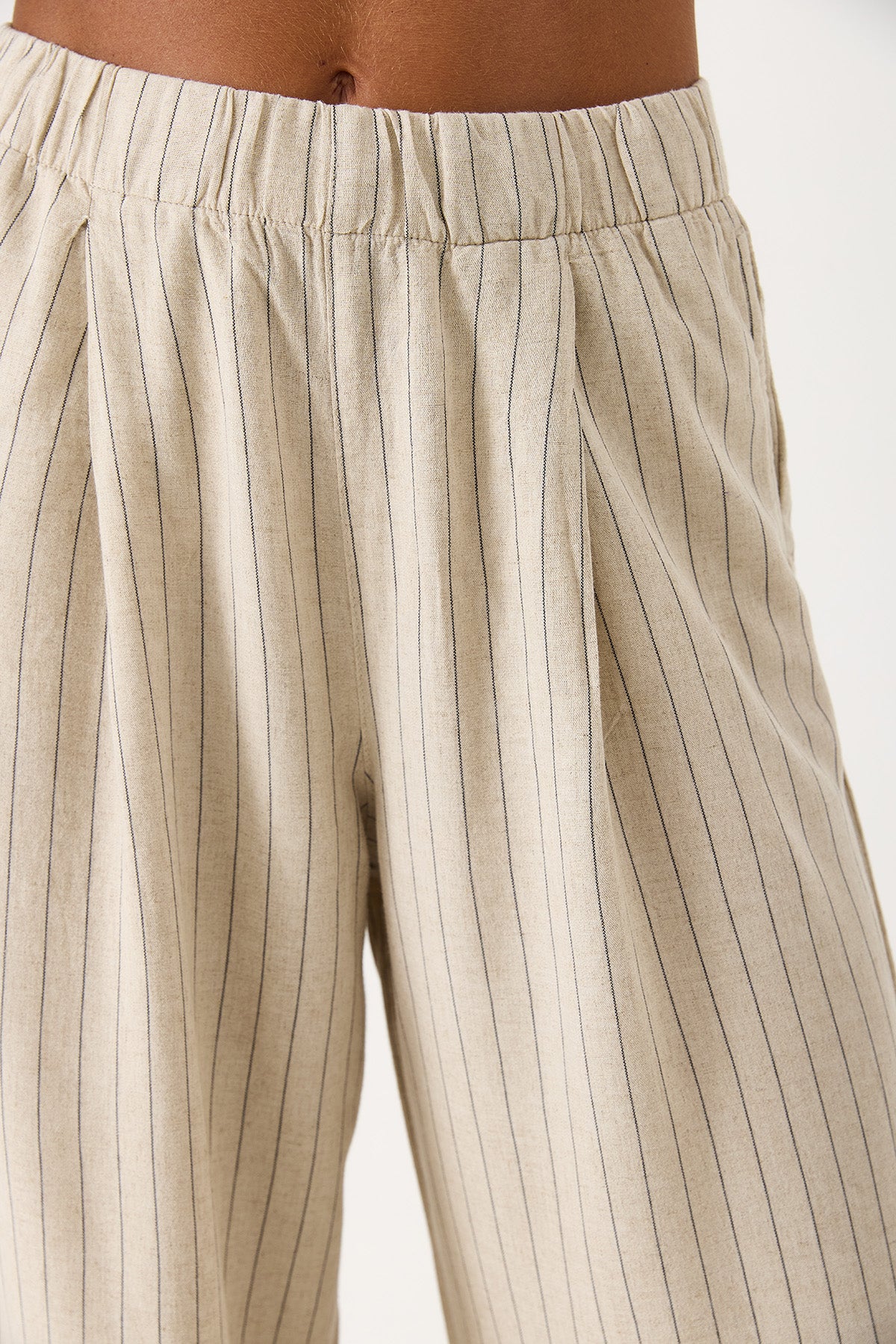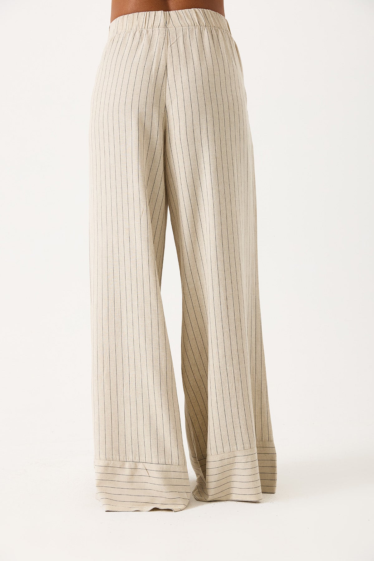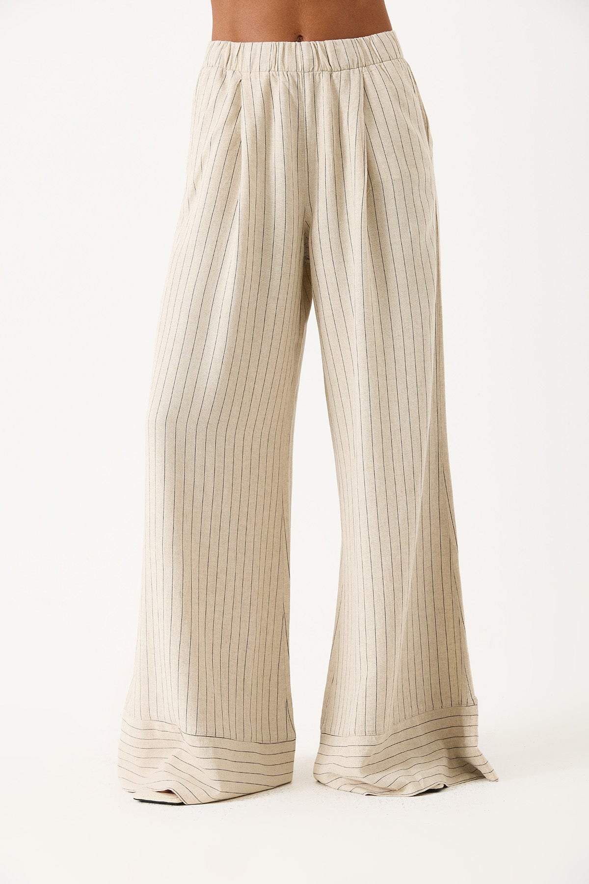 Kadın Beli Lastikli Geniş Paça Çizgili Keten Pantolon - Bej Çizgili