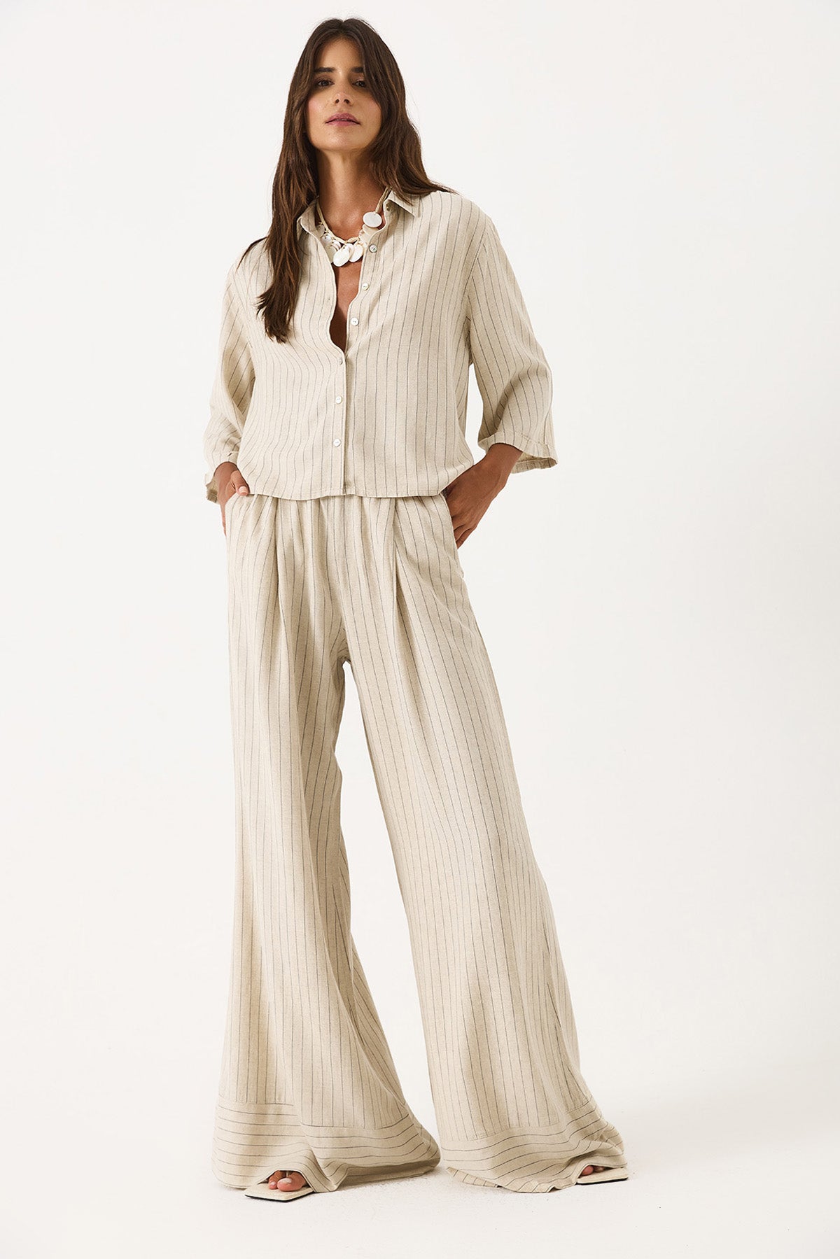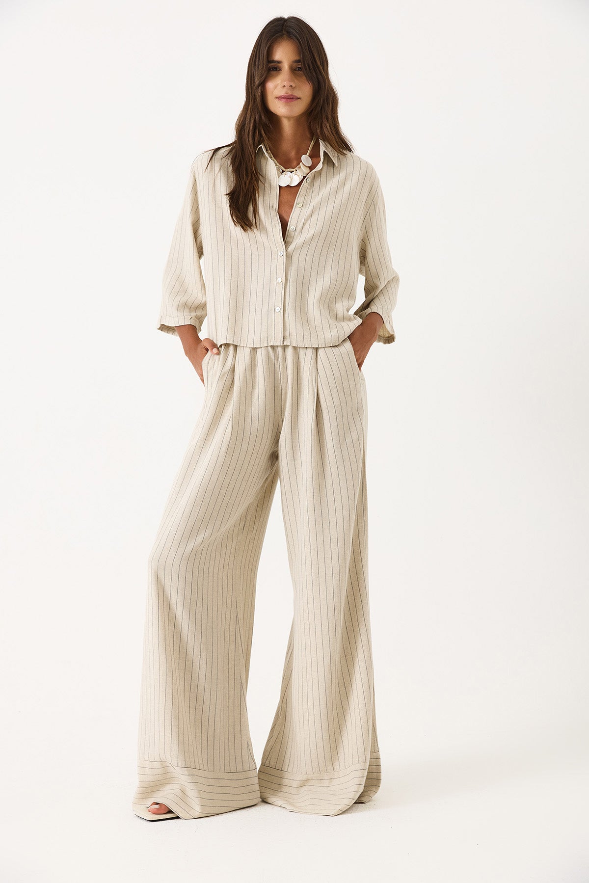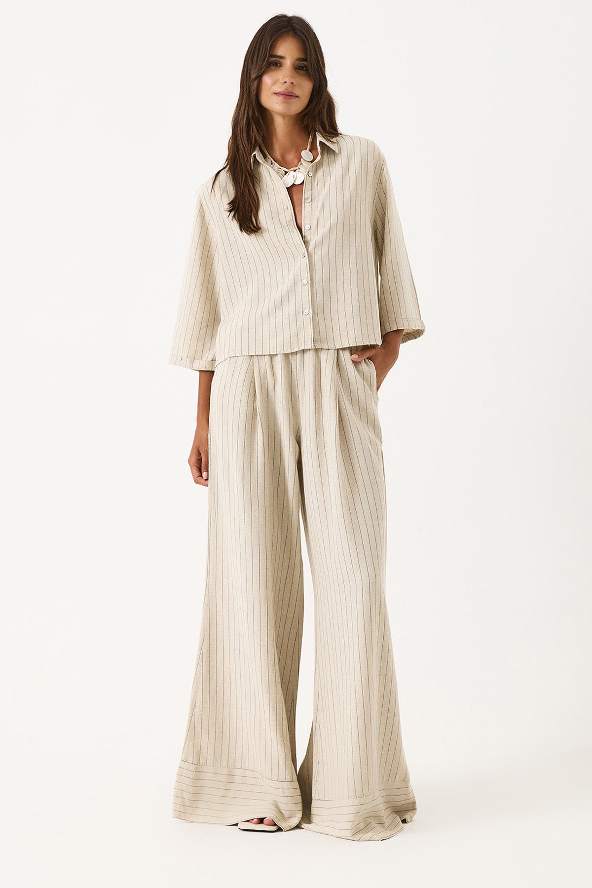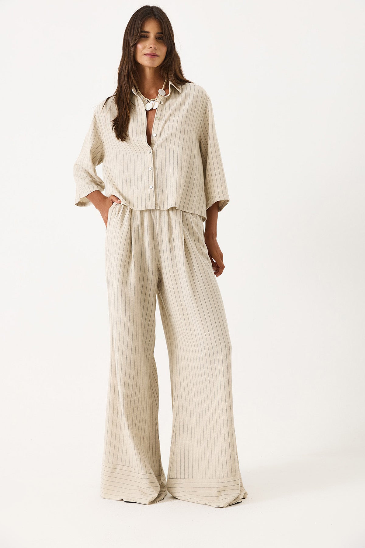 Kadın Beli Lastikli Geniş Paça Çizgili Keten Pantolon - Bej Çizgili