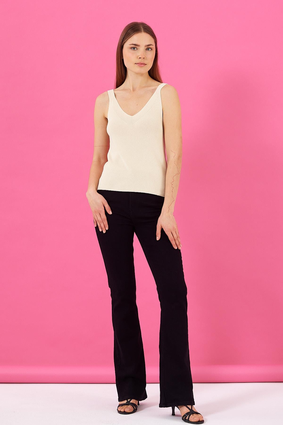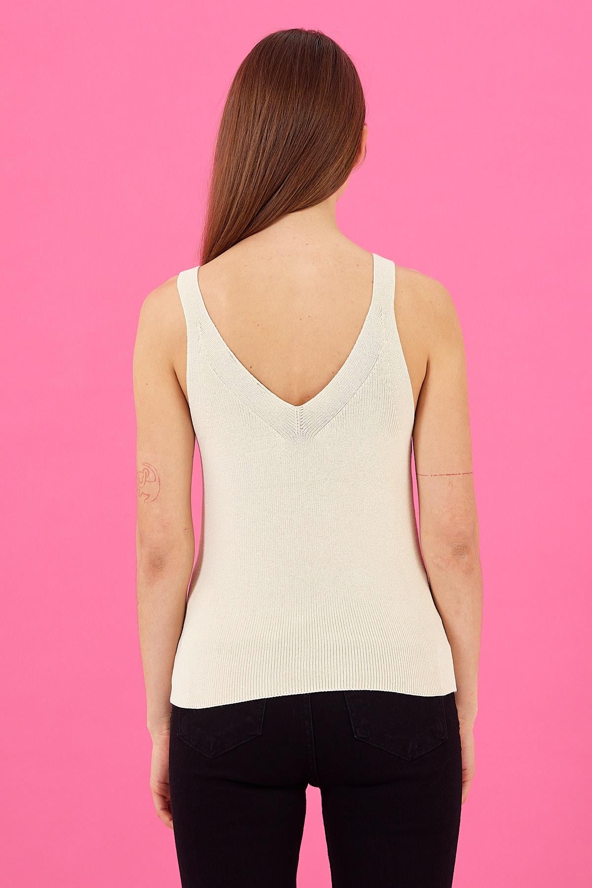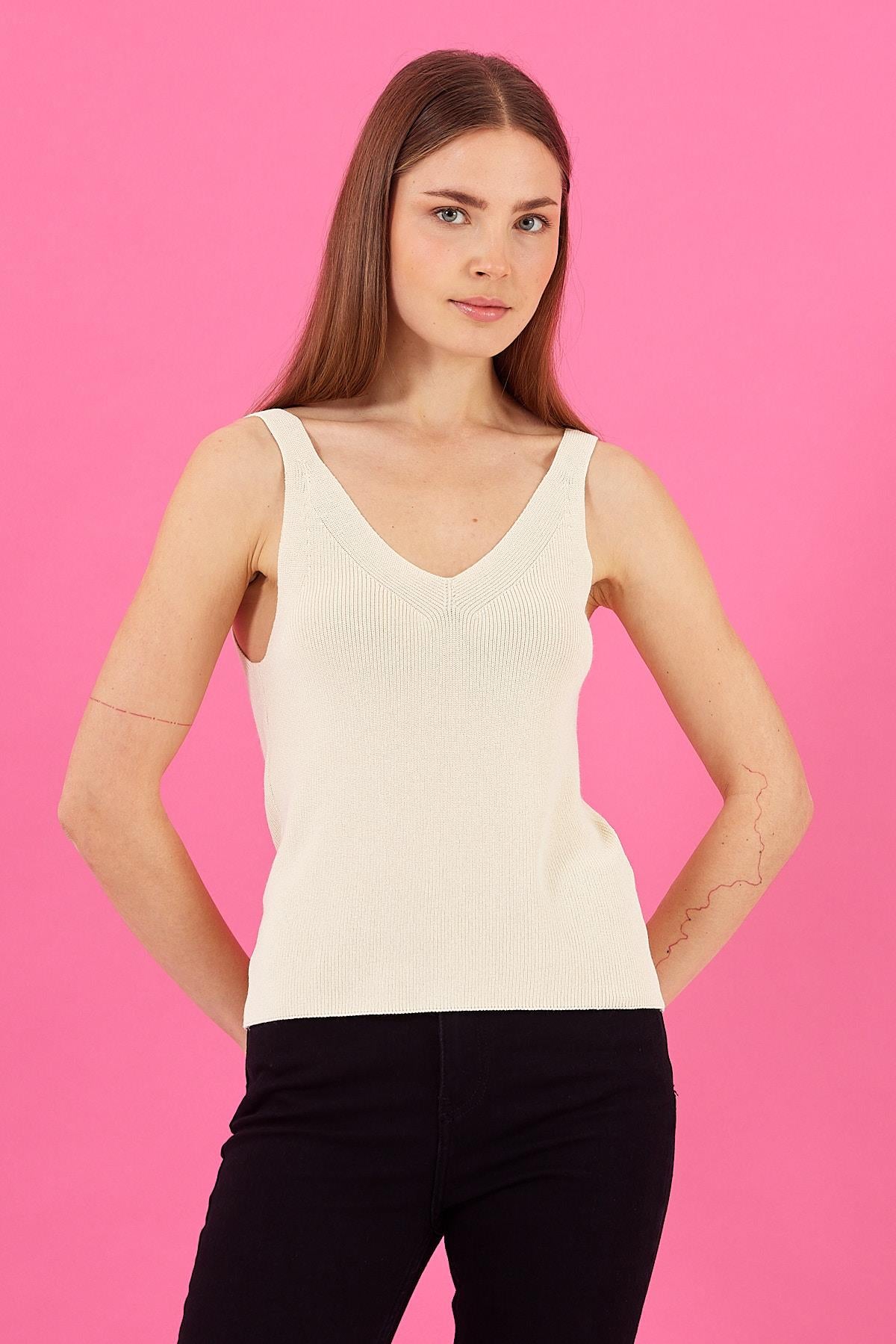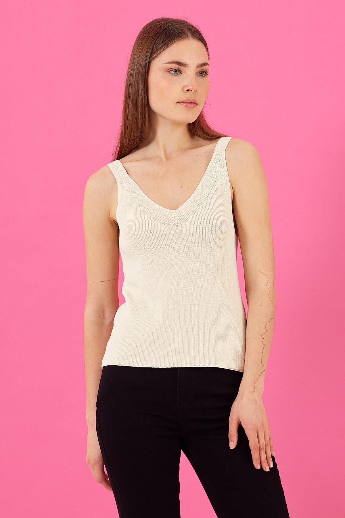 Kadın Bella Kalın Askılı V Yaka Triko Top - Kemik