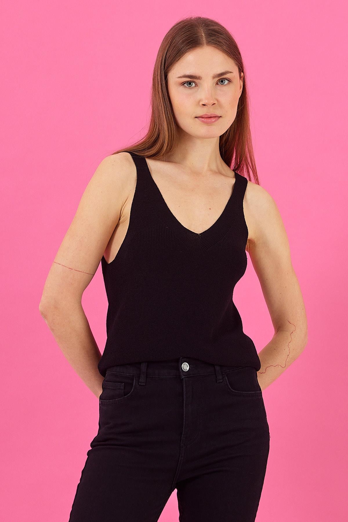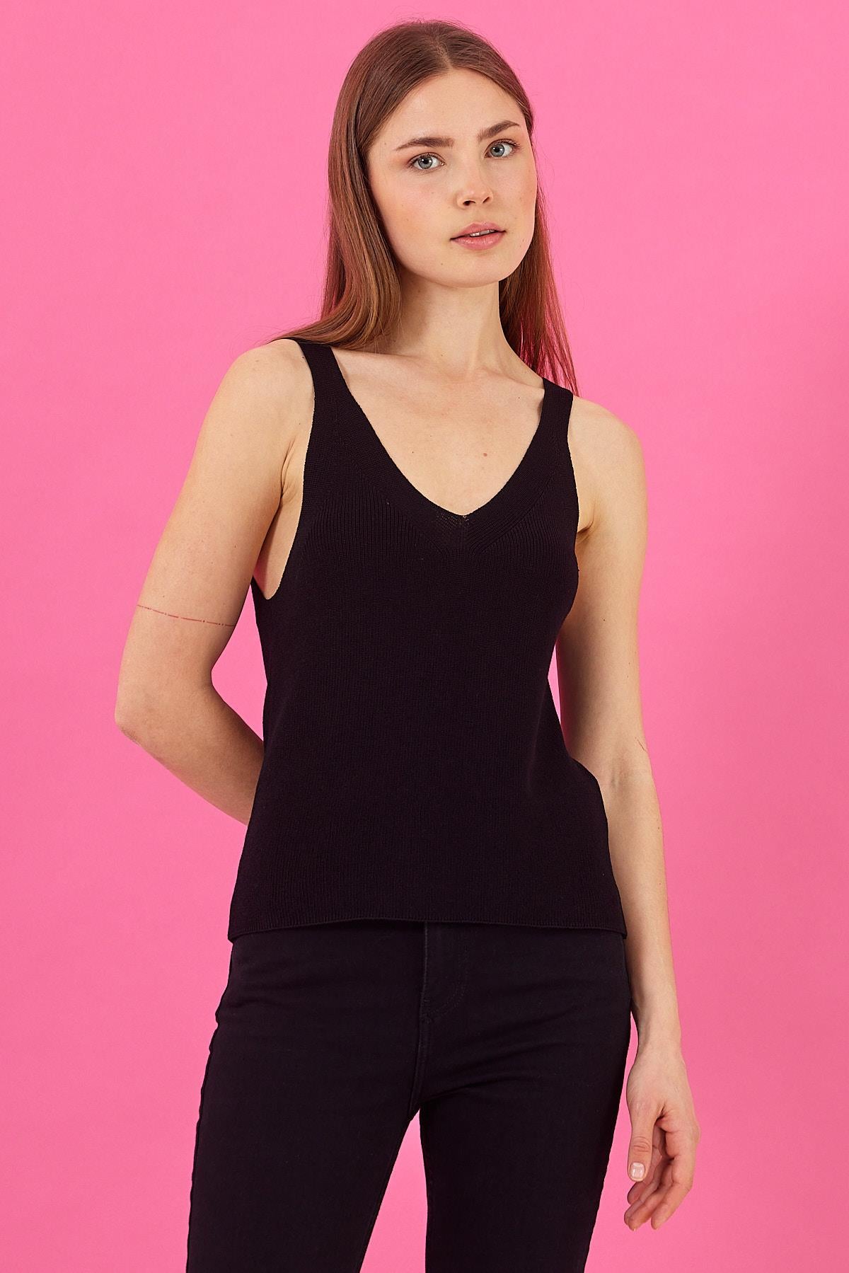 Kadın Bella Kalın Askılı V Yaka Triko Top - Siyah
