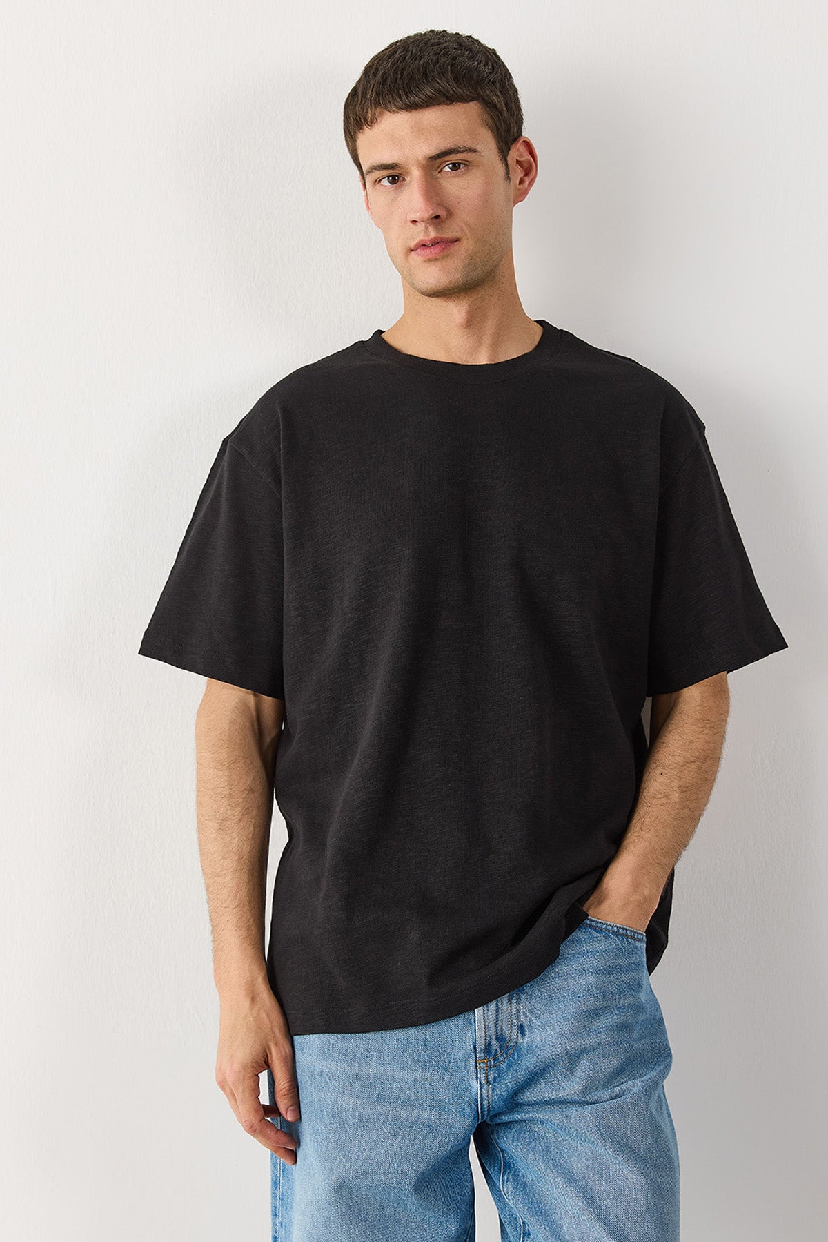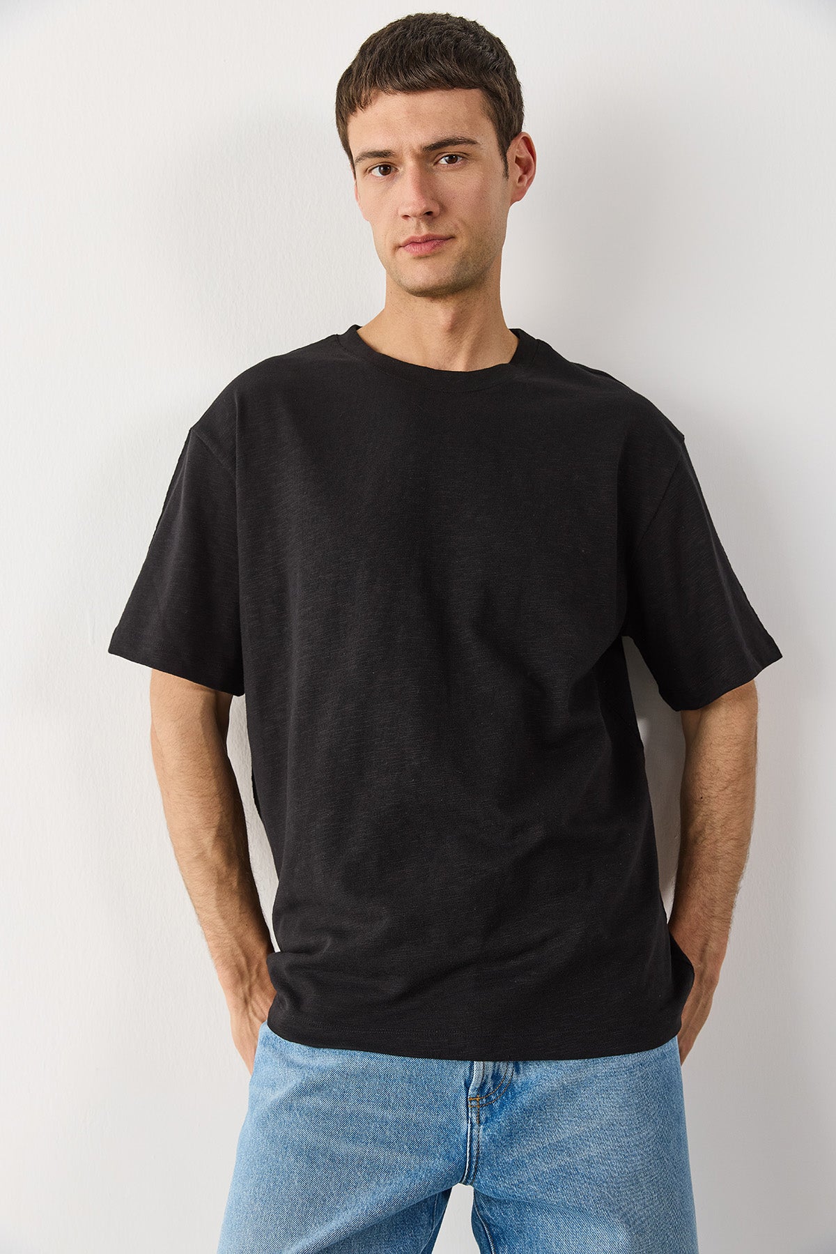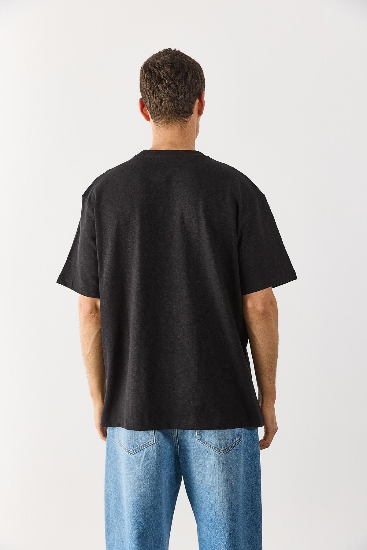 Erkek Bisiklet Yaka Flamlı Oversize Tişört %100 Pamuk - Siyah