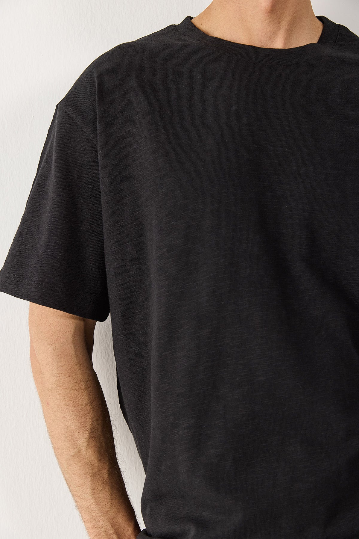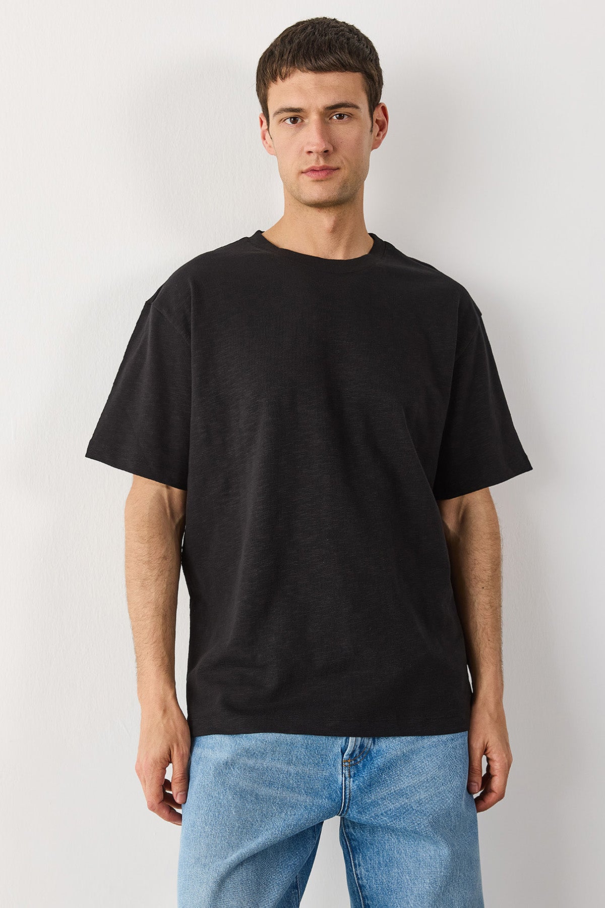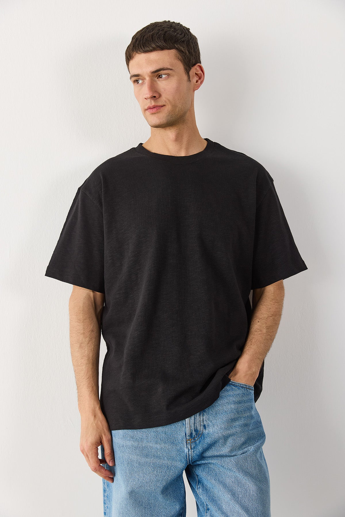 Erkek Bisiklet Yaka Flamlı Oversize Tişört %100 Pamuk - Siyah