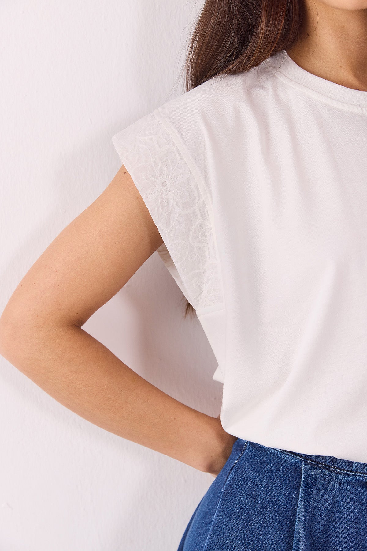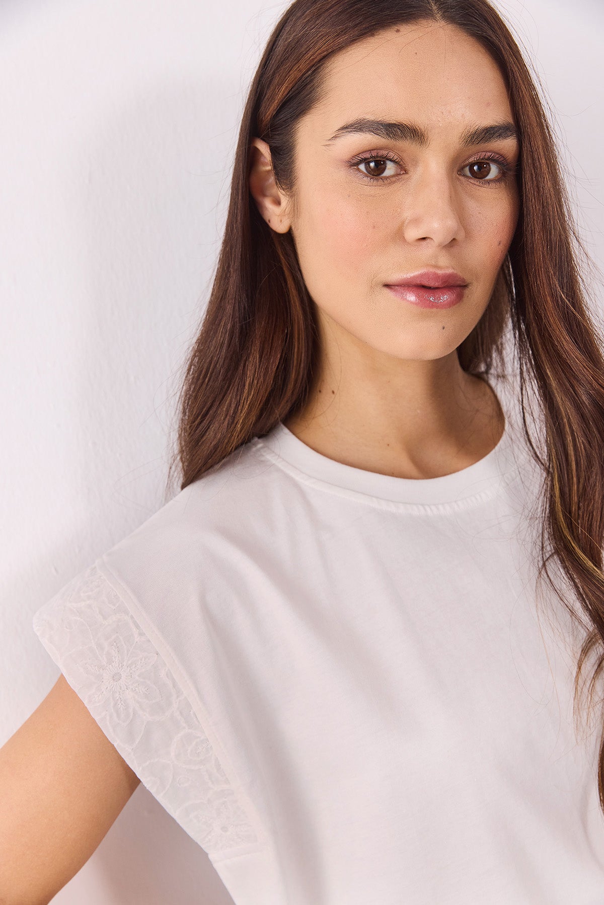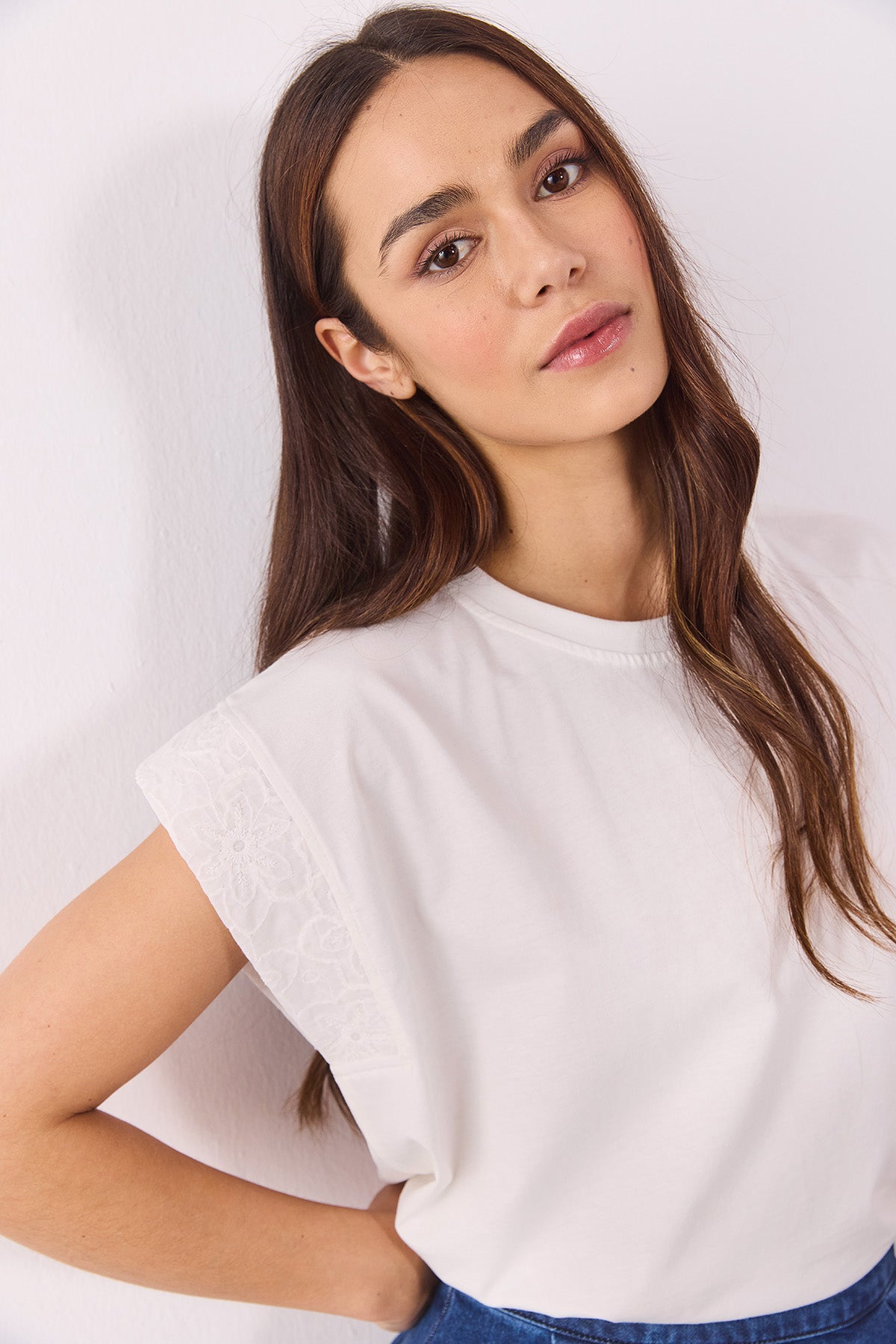 Kadın Bisiklet Yaka Kolları Brode Nakışlı Tişört %100 Pamuk - Fildişi
