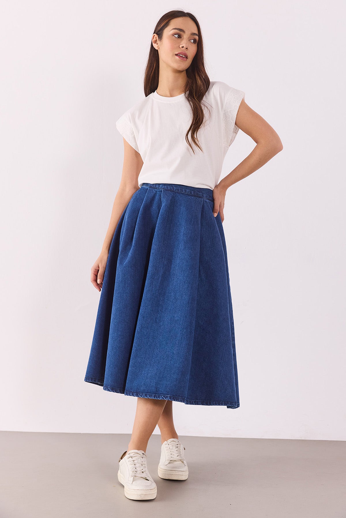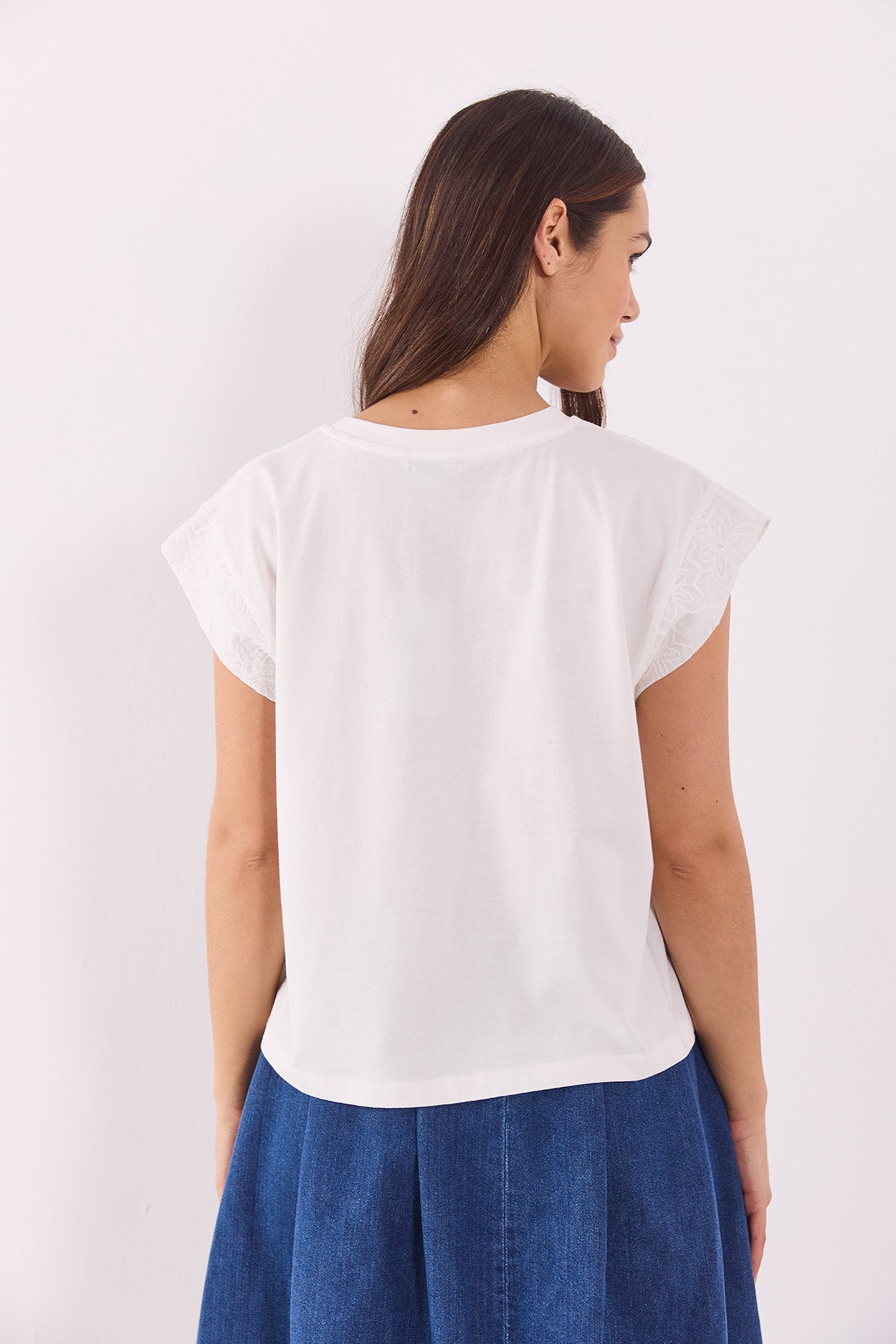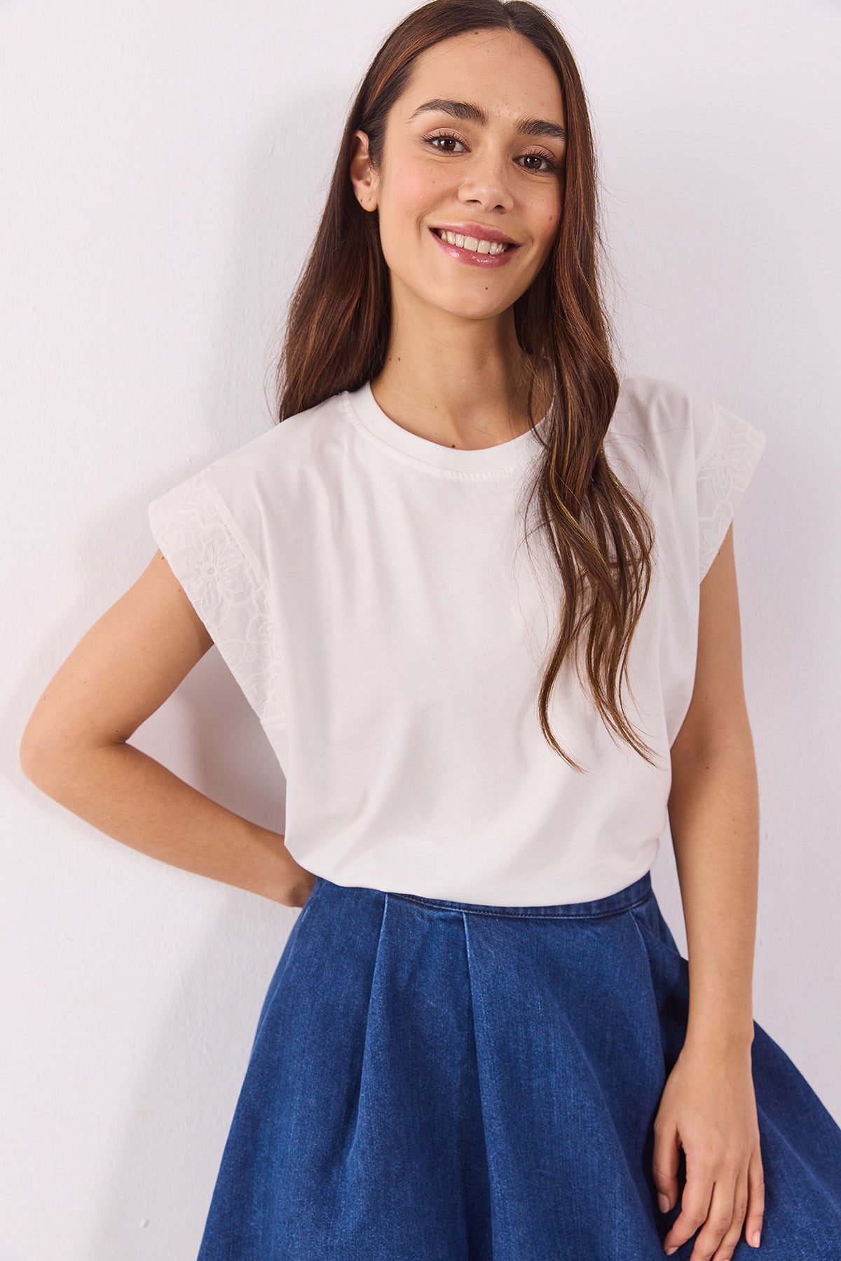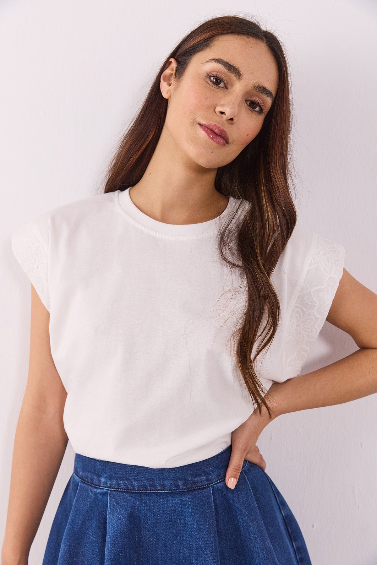 Kadın Bisiklet Yaka Kolları Brode Nakışlı Tişört %100 Pamuk - Fildişi