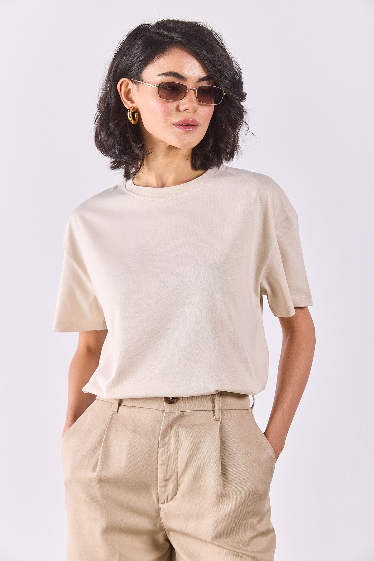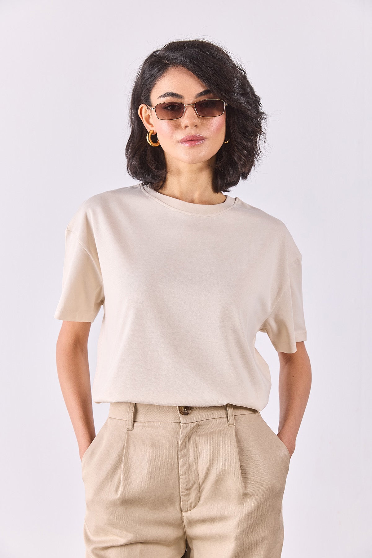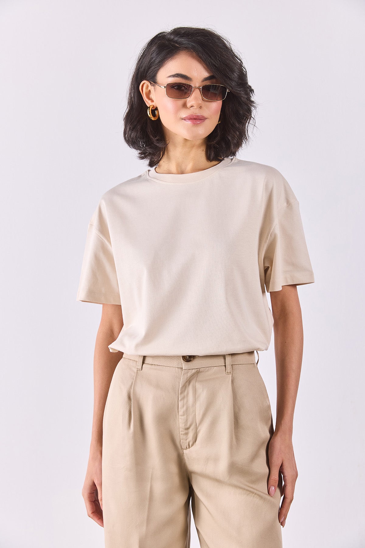 Kadın Bisiklet Yaka Oversize Rahat Kalıp Basic Tişört %100 Pamuk - Naturel