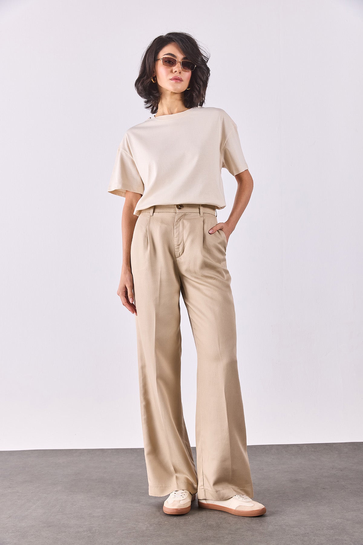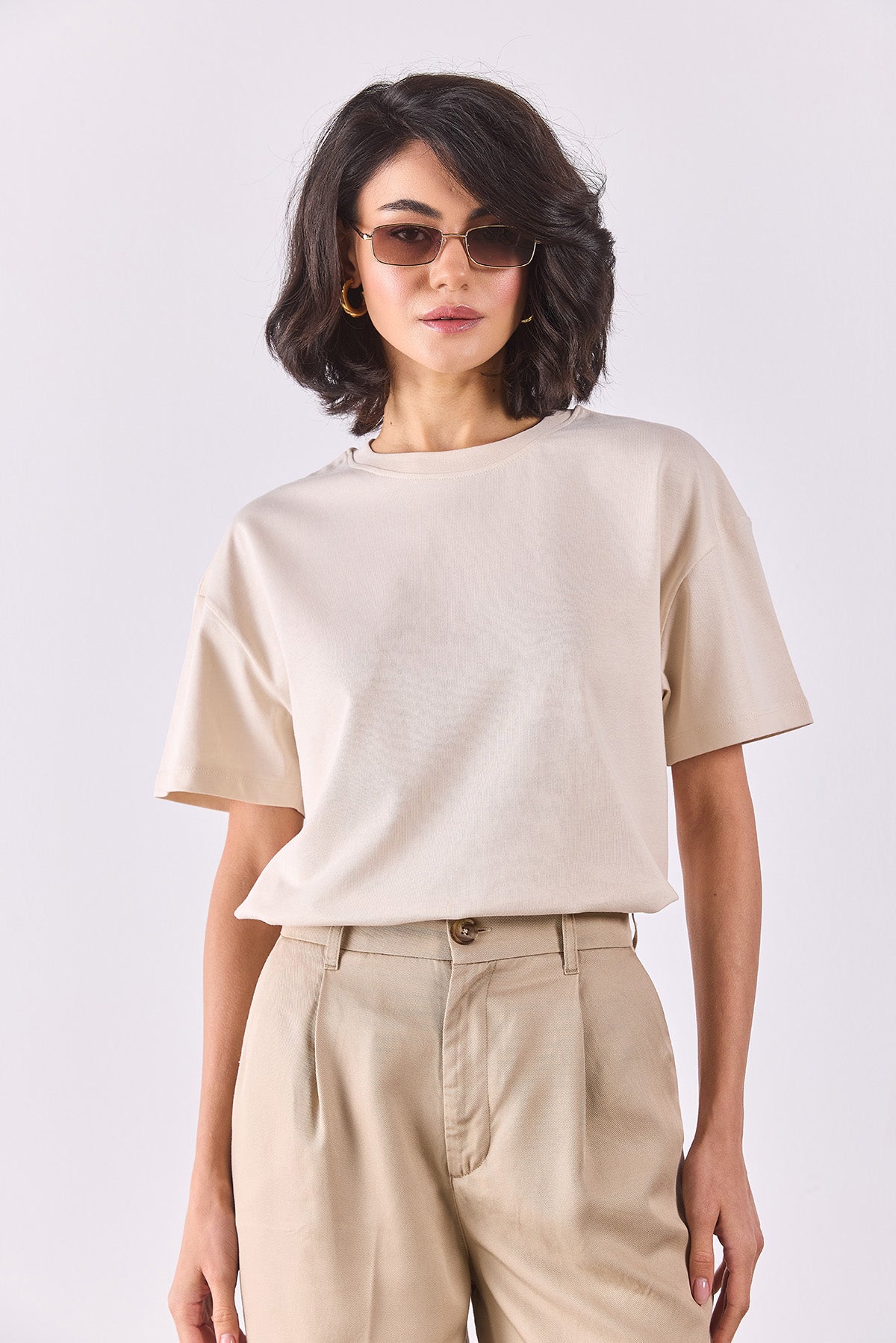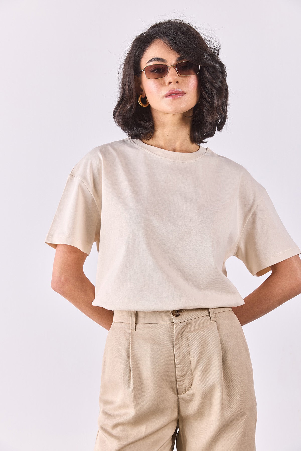 Kadın Bisiklet Yaka Oversize Rahat Kalıp Basic Tişört %100 Pamuk - Naturel