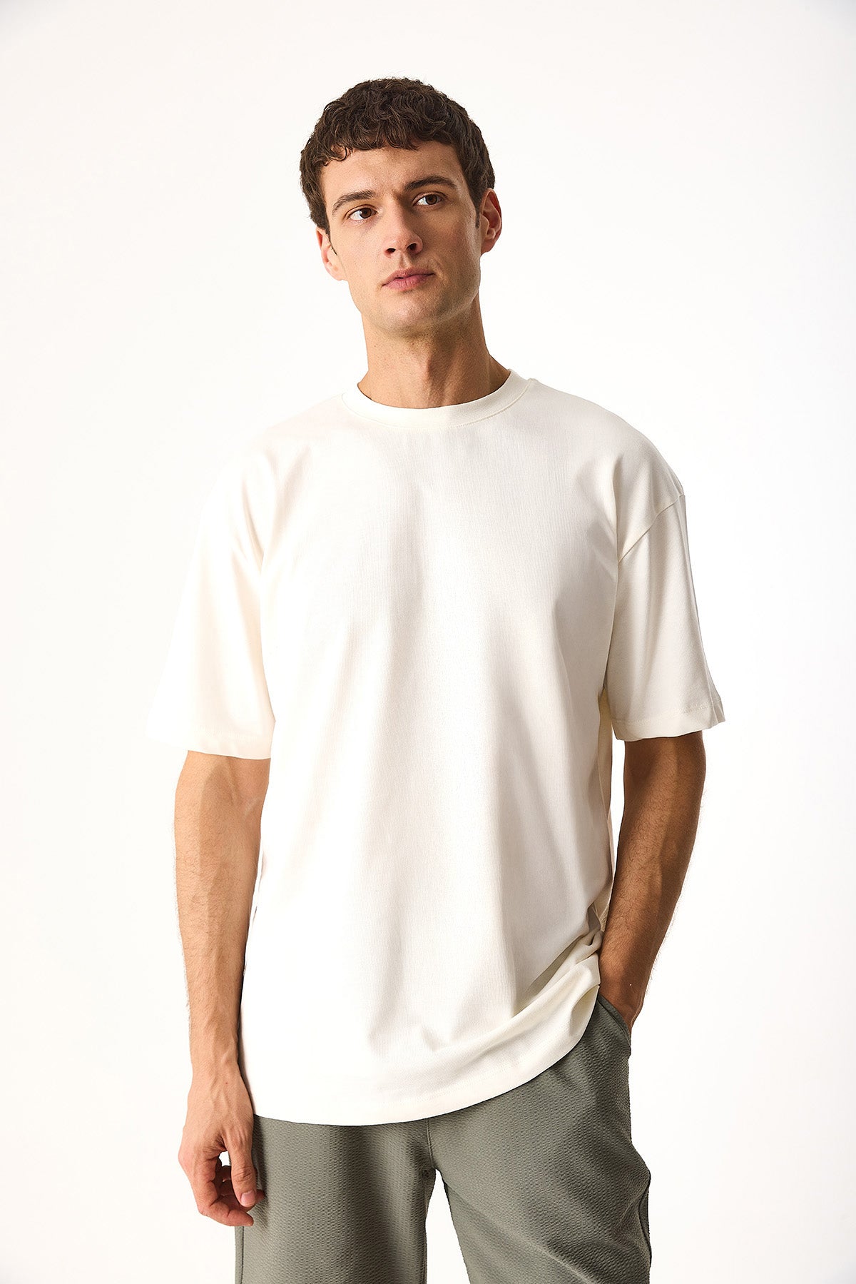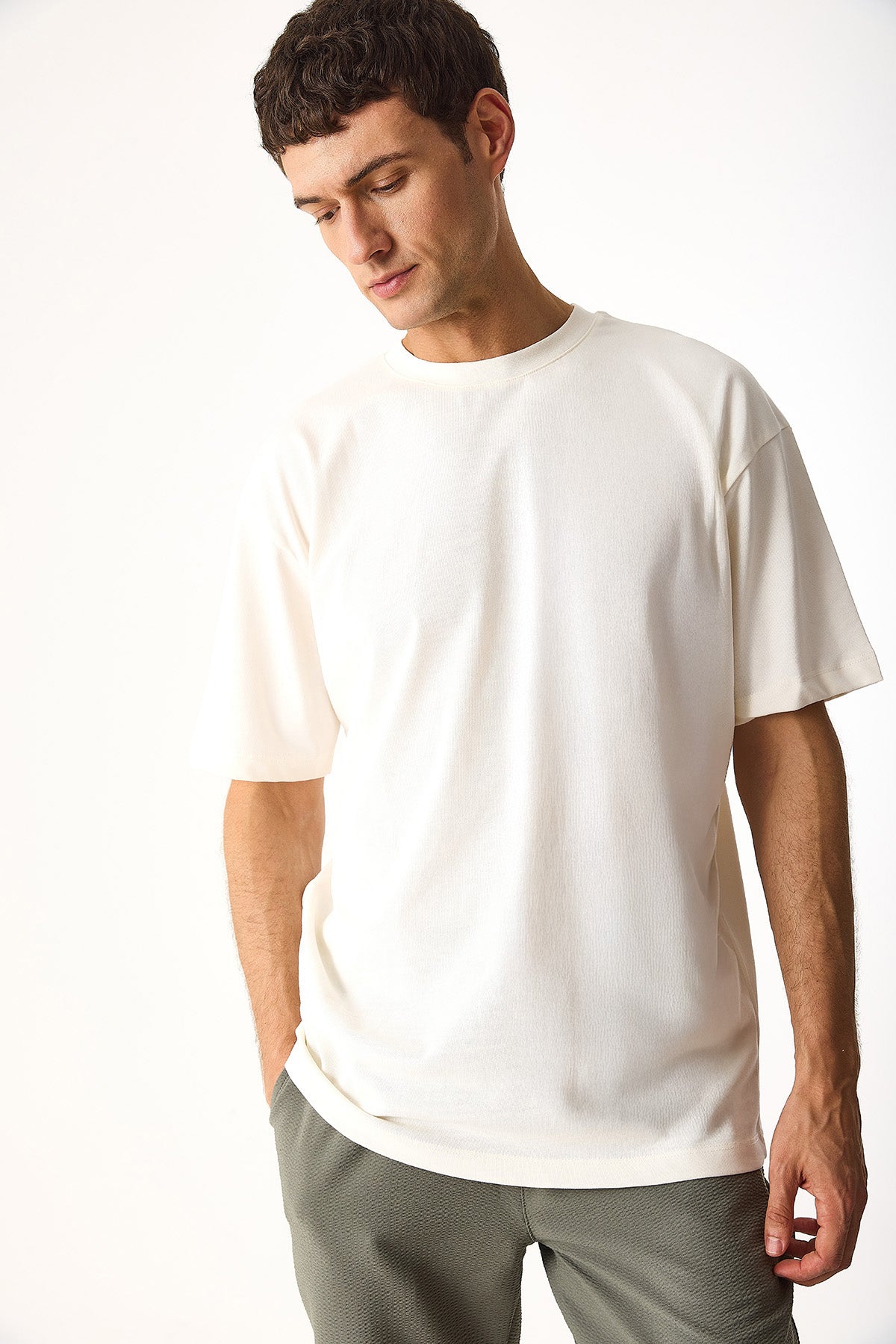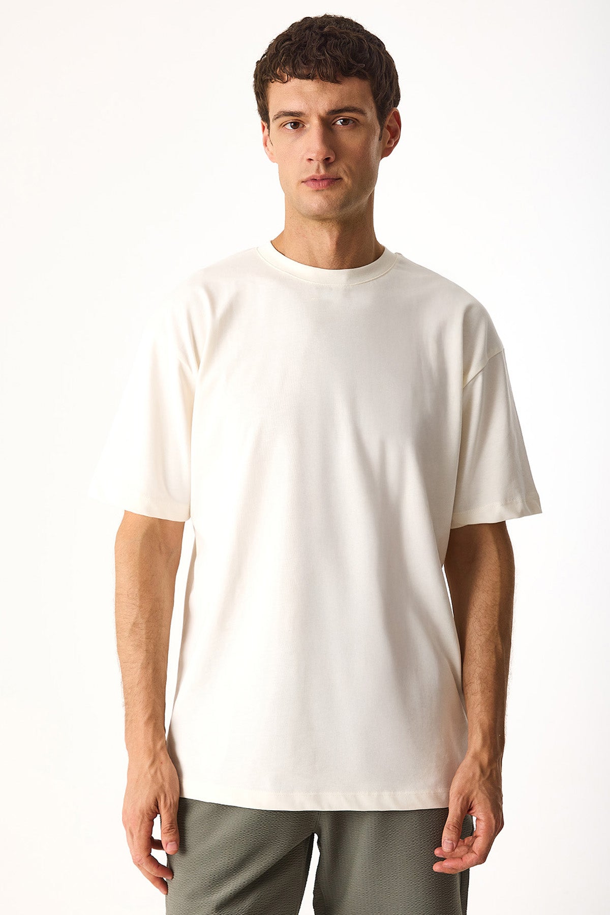 Erkek Bisiklet Yaka Oversize Yumuşak Dokulu Tişört %100 Pamuk - Ekru