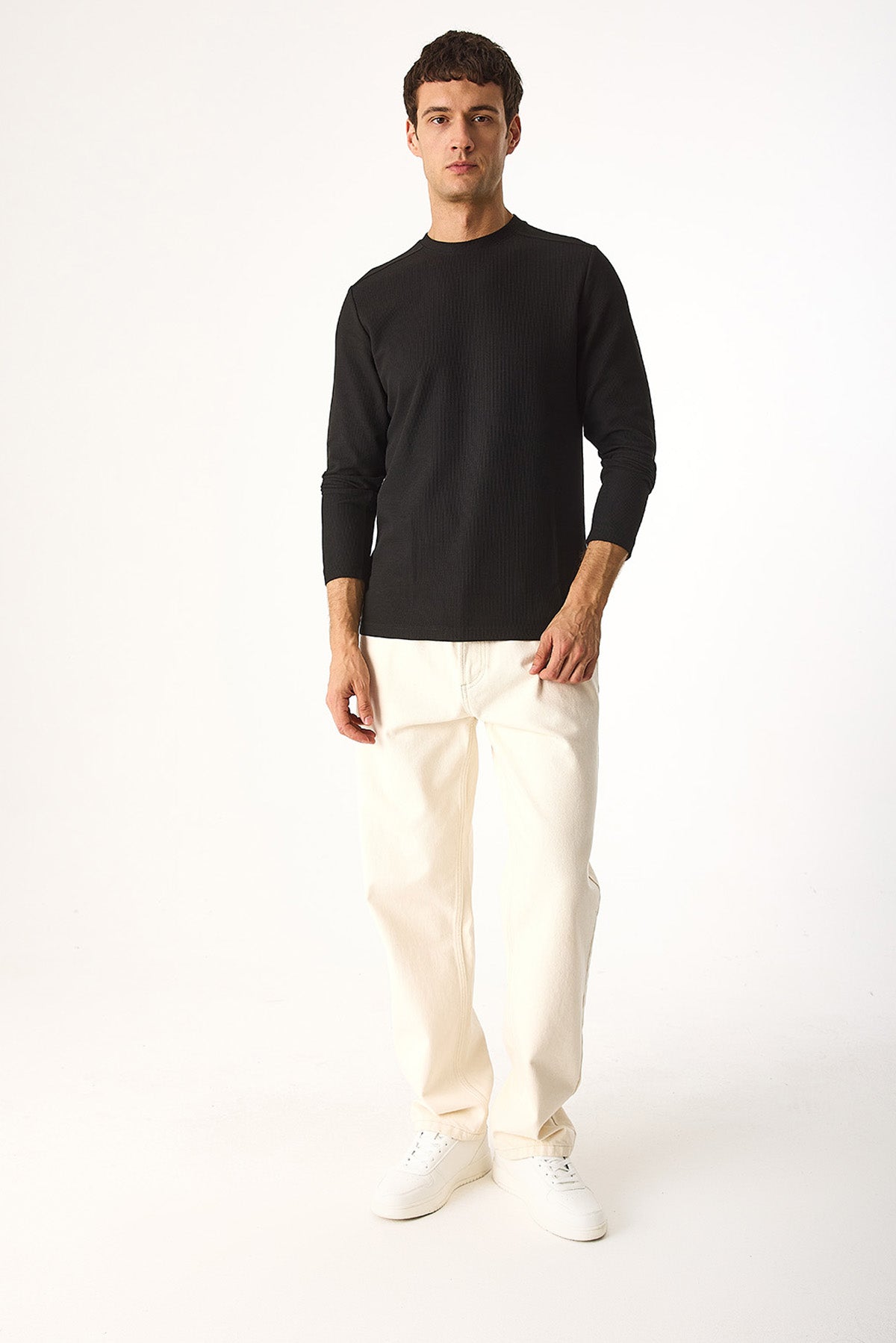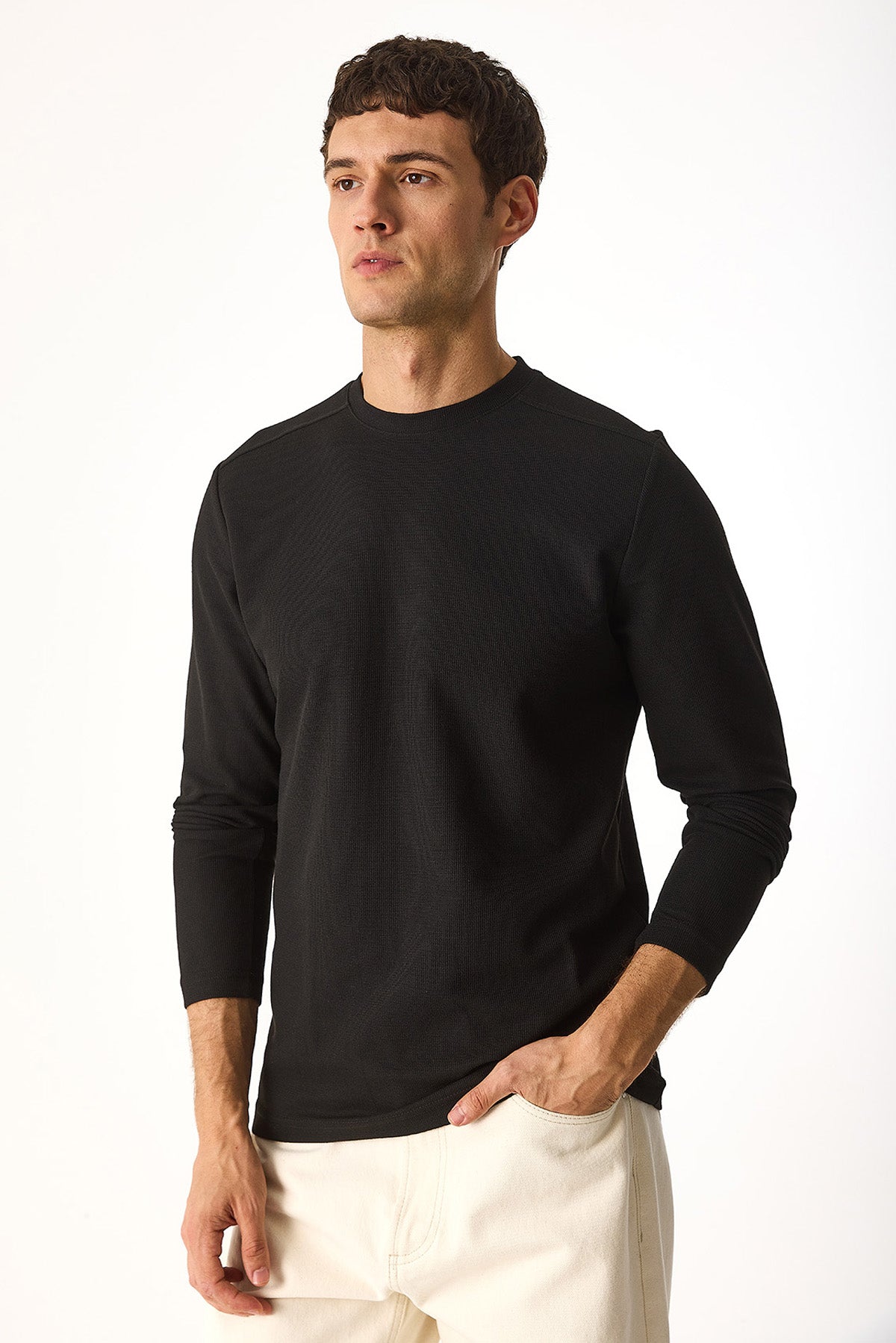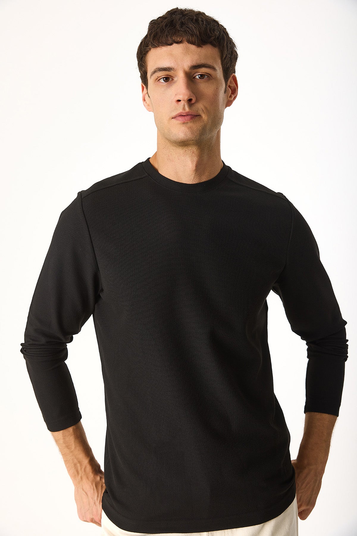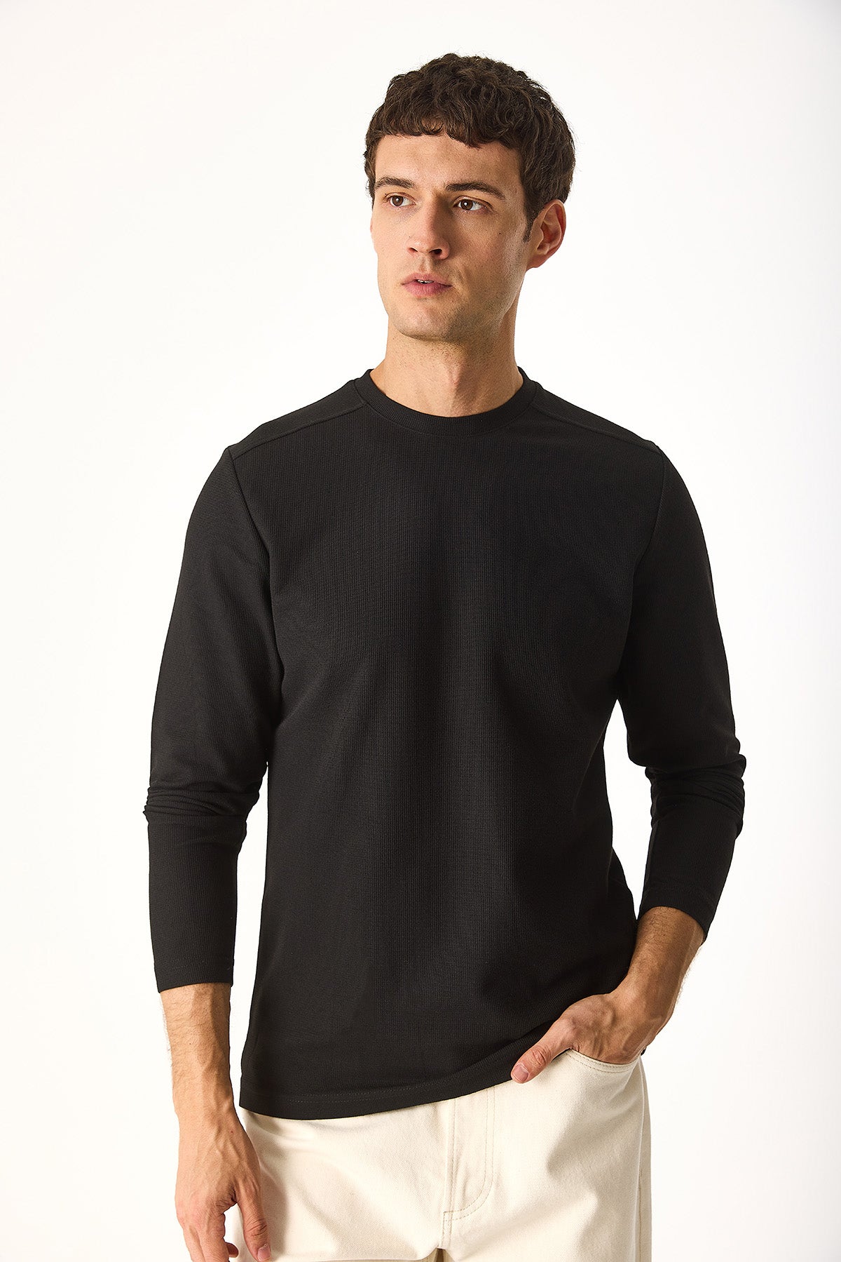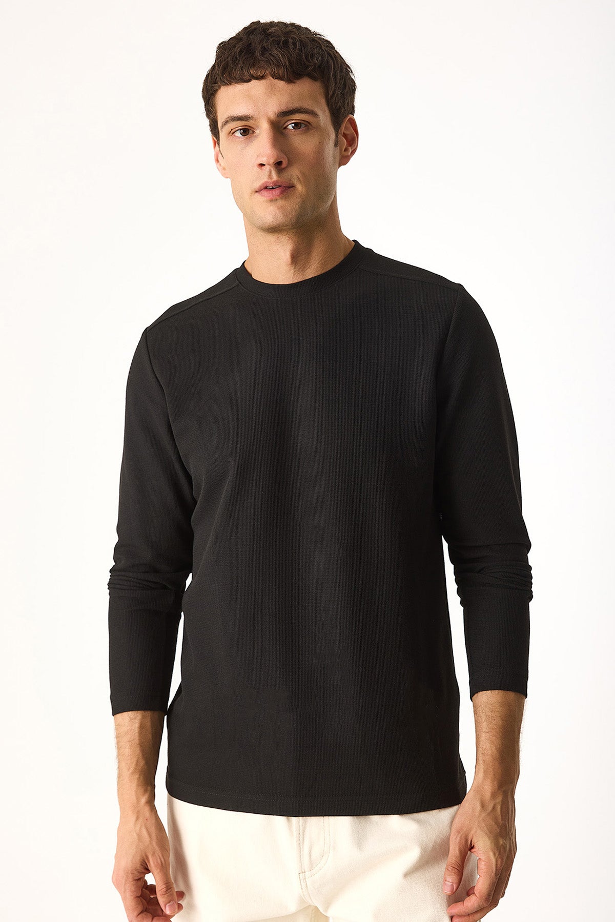 Erkek Bisiklet Yaka Regular Fit Dokulu Sweatshirt - Siyah