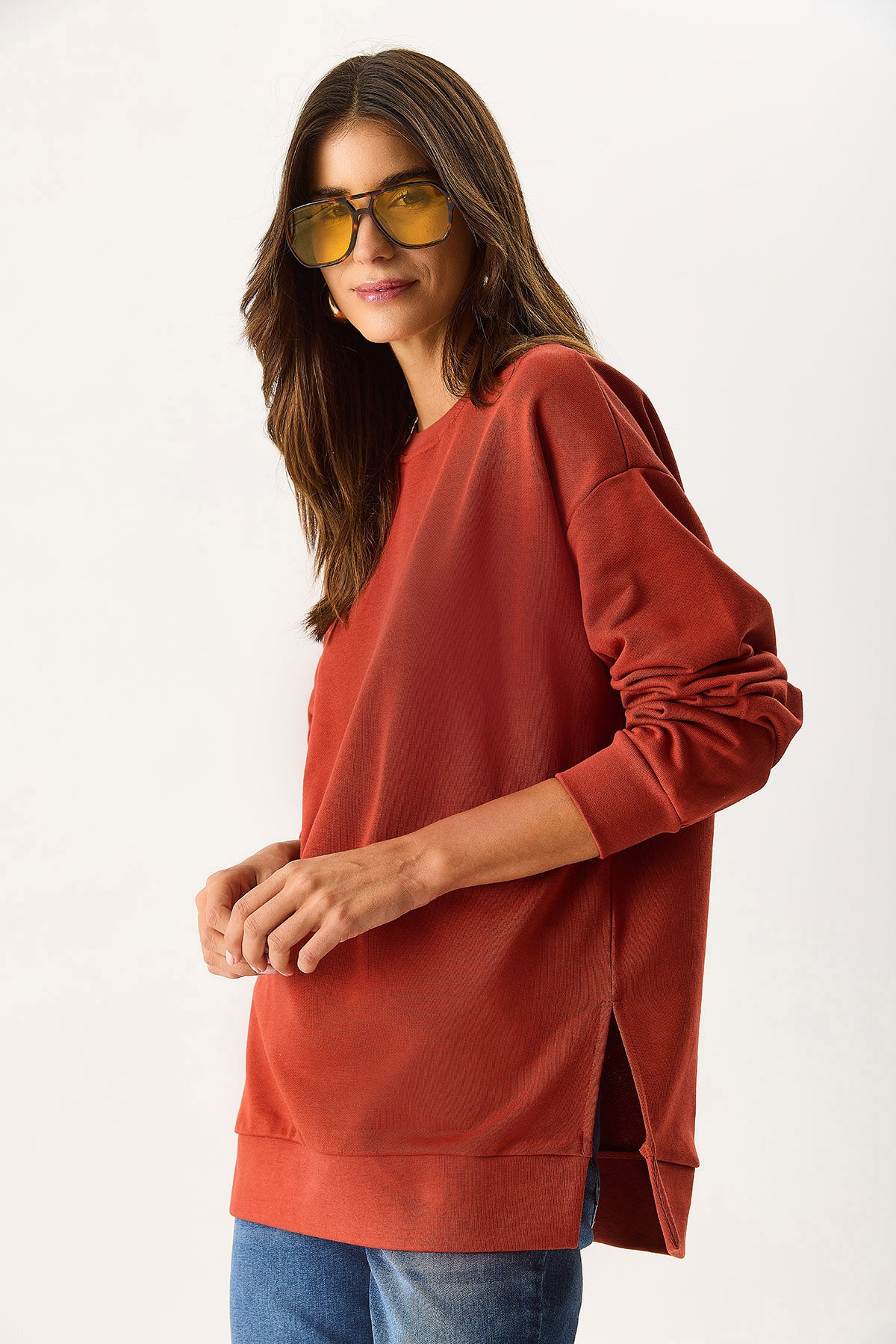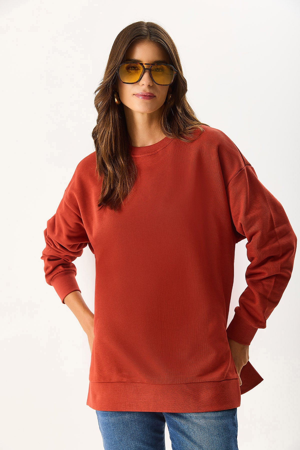 Kadın Bisiklet Yaka Yanı Yırtmaçlı Regular Fit 3 İplik Sweatshirt %100 Pamuk - Kiremit