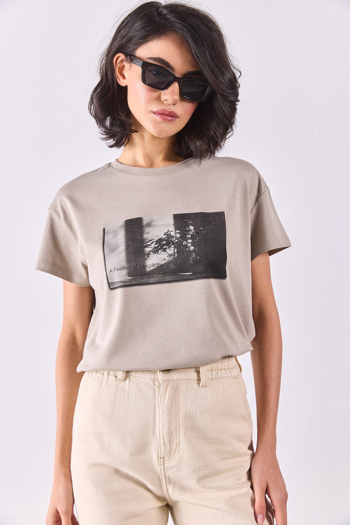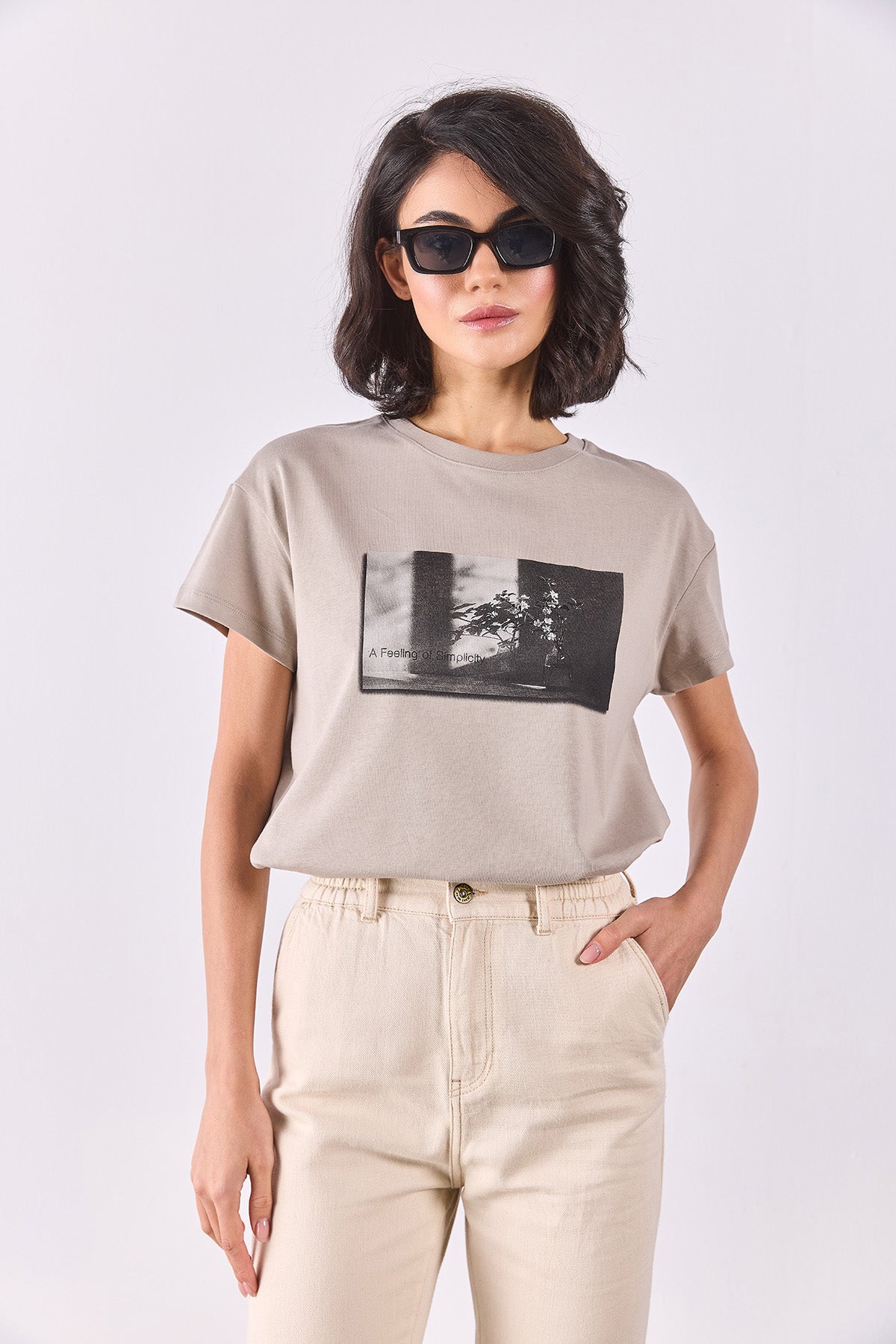 Kadın Bohemian Baskılı Tişört %100 Pamuk - Gri