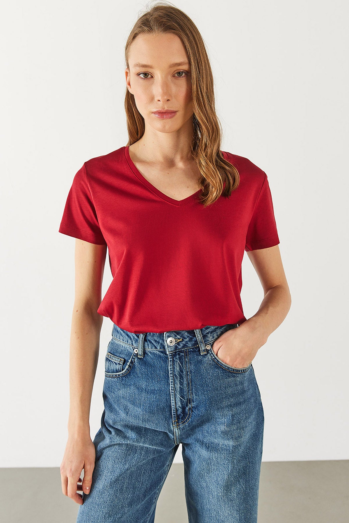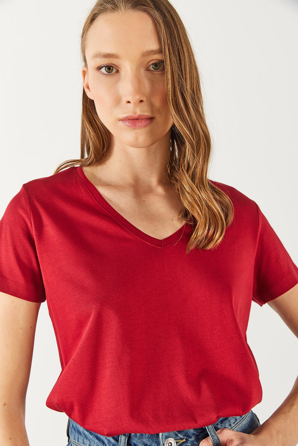 Kadın Boyfriend V Yaka Regular Fit Modal Tişört (TENCEL)™ - Bordo