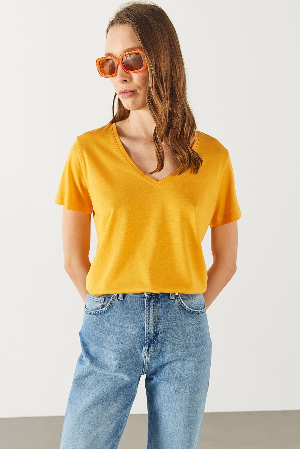 Kadın Boyfriend V Yaka Regular Fit Modal Tişört (TENCEL)™ - Kayısı