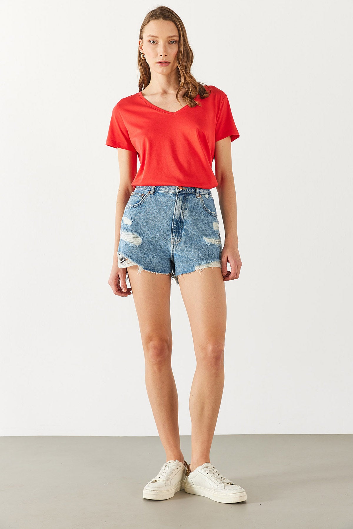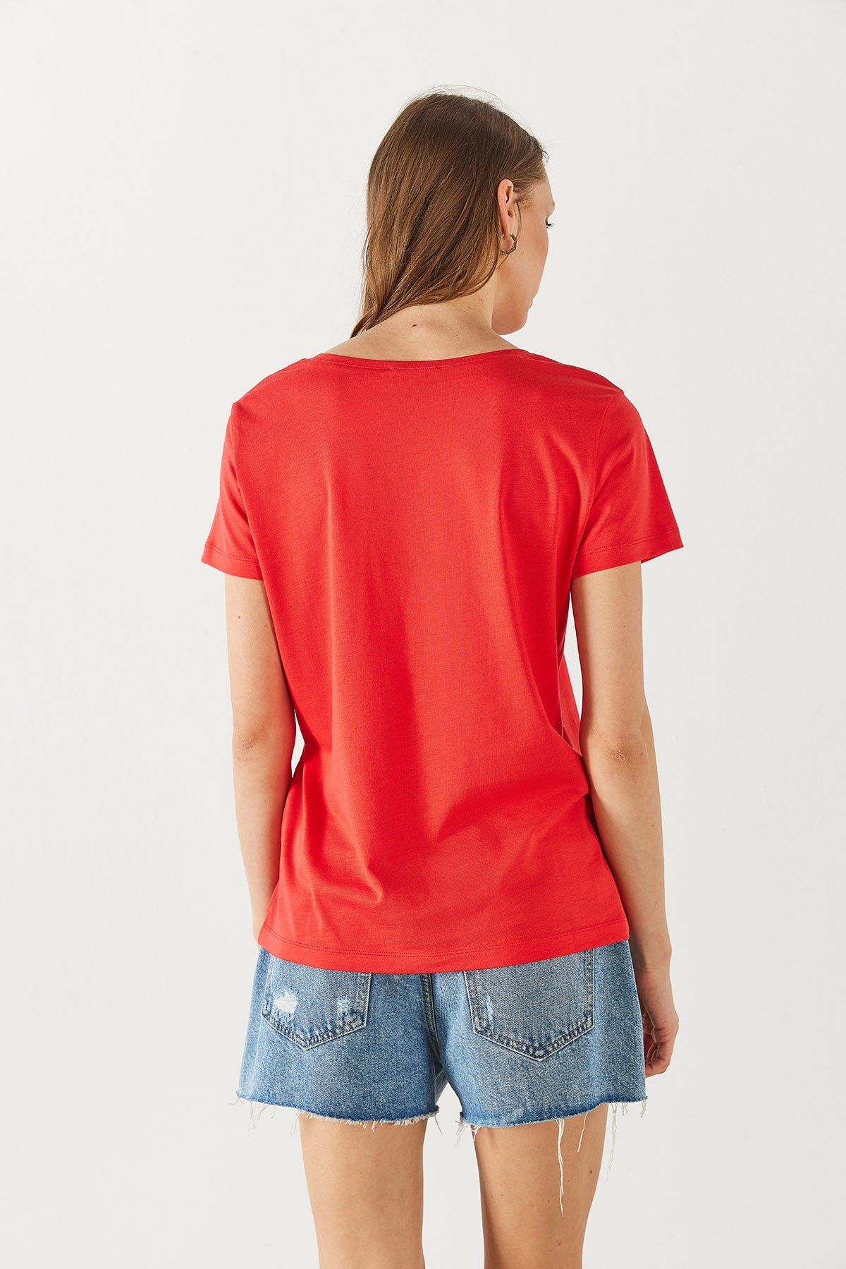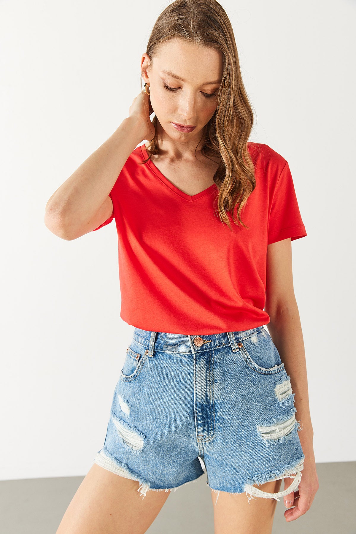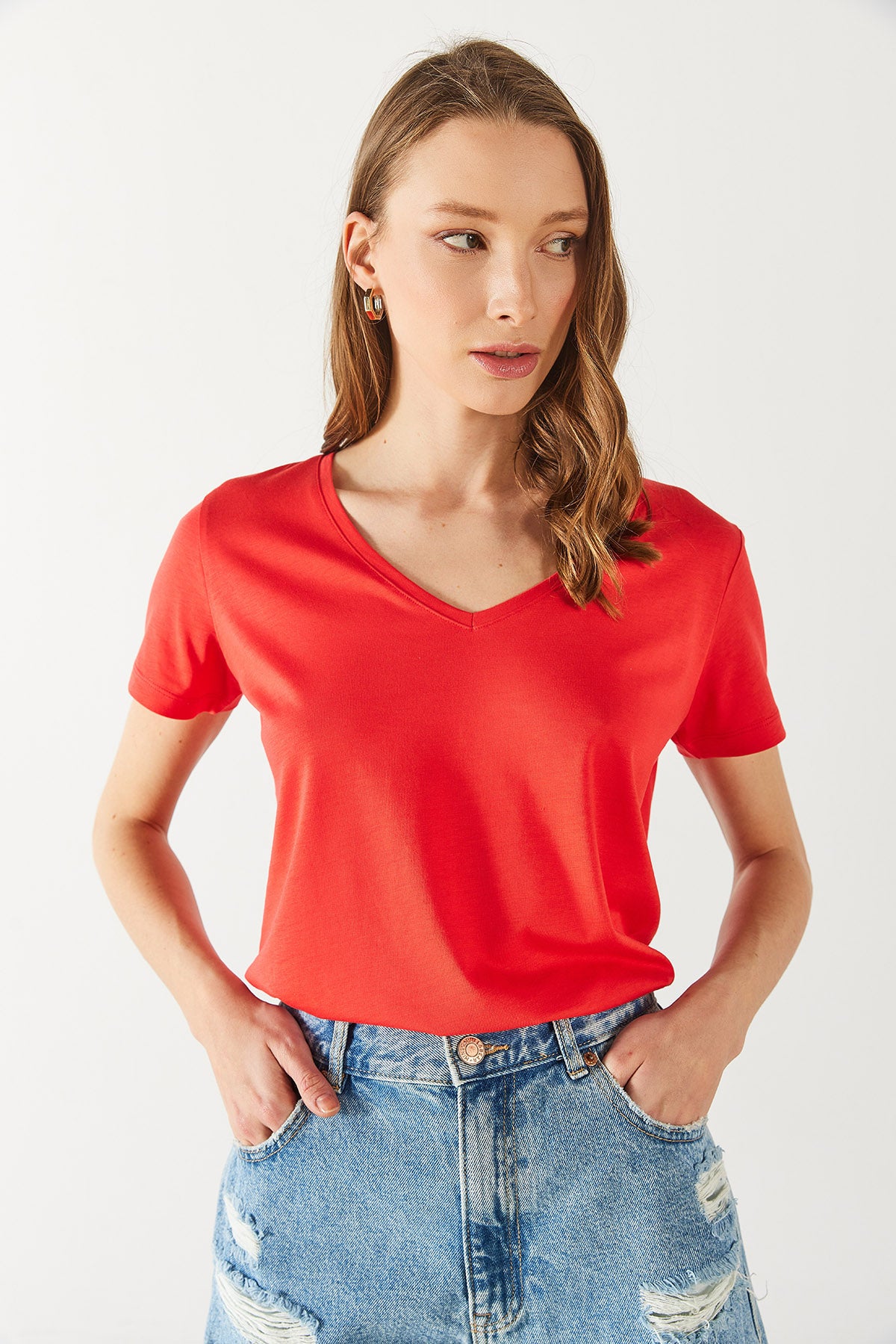 Kadın Boyfriend V Yaka Regular Fit Modal Tişört (TENCEL)™ - Mercan