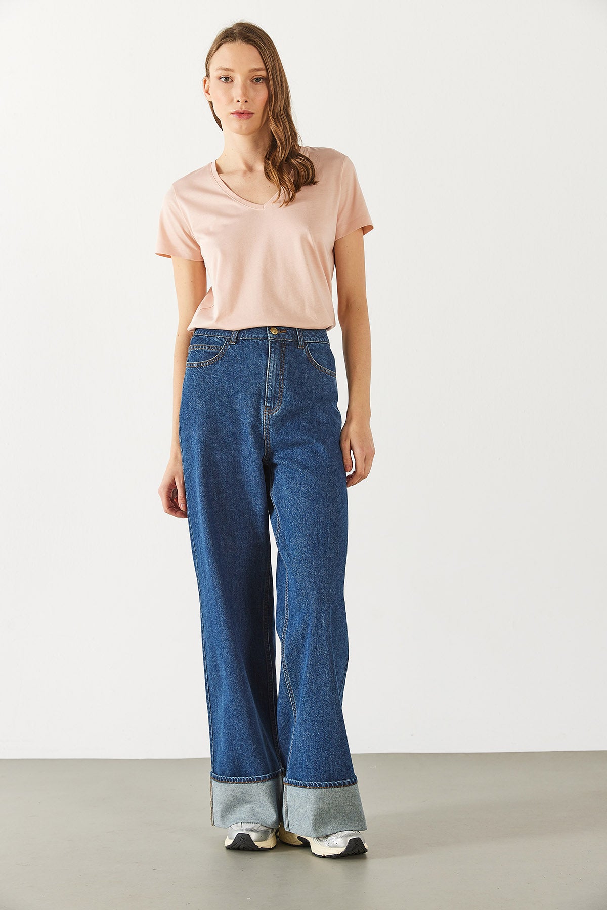 Kadın Boyfriend V Yaka Regular Fit Modal Tişört (TENCEL)™ - Pudra