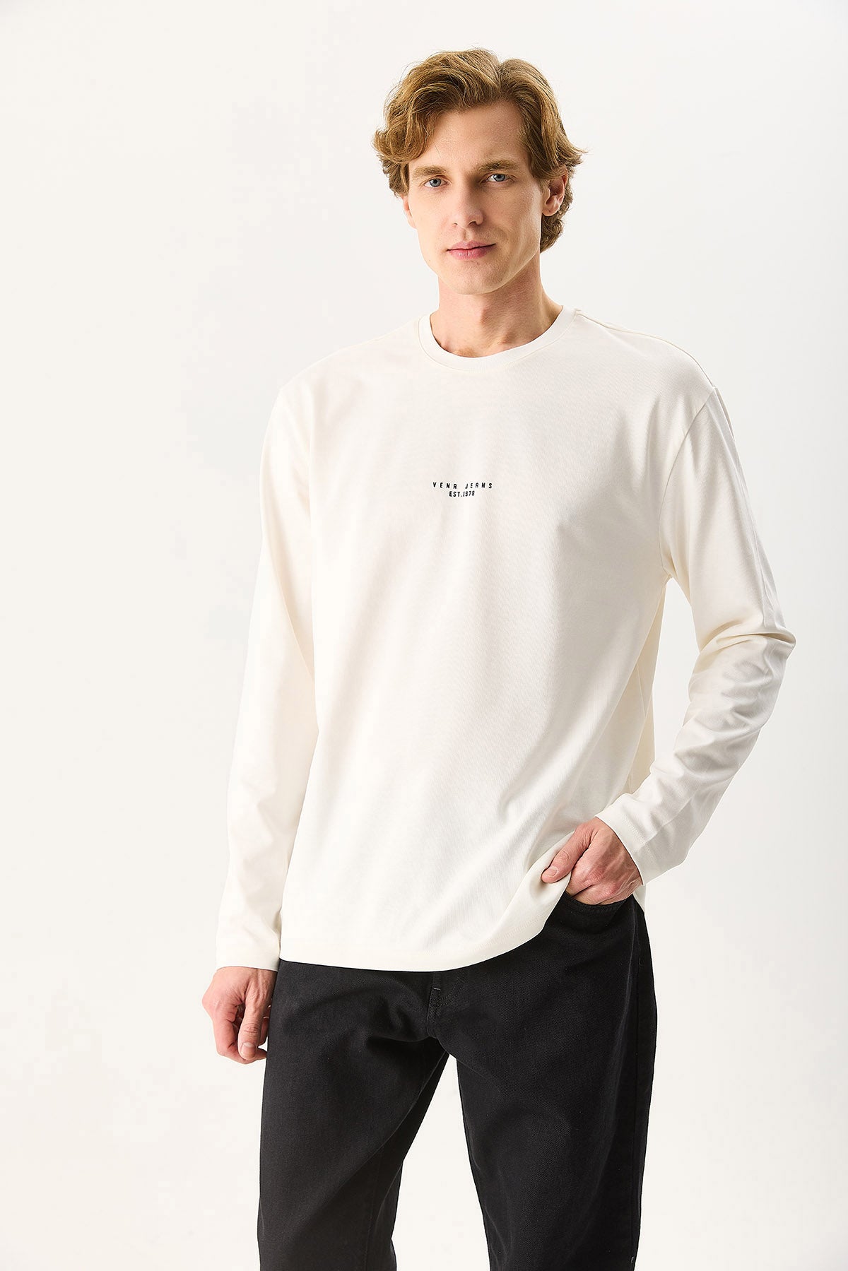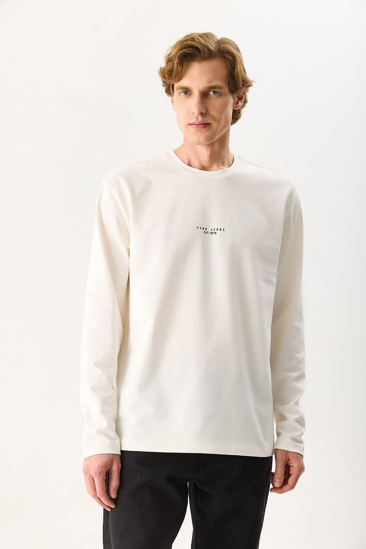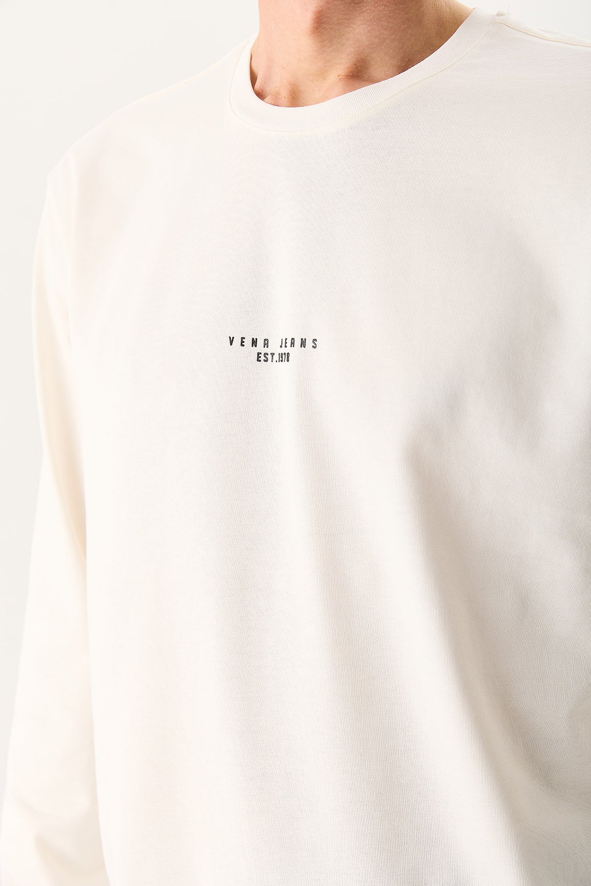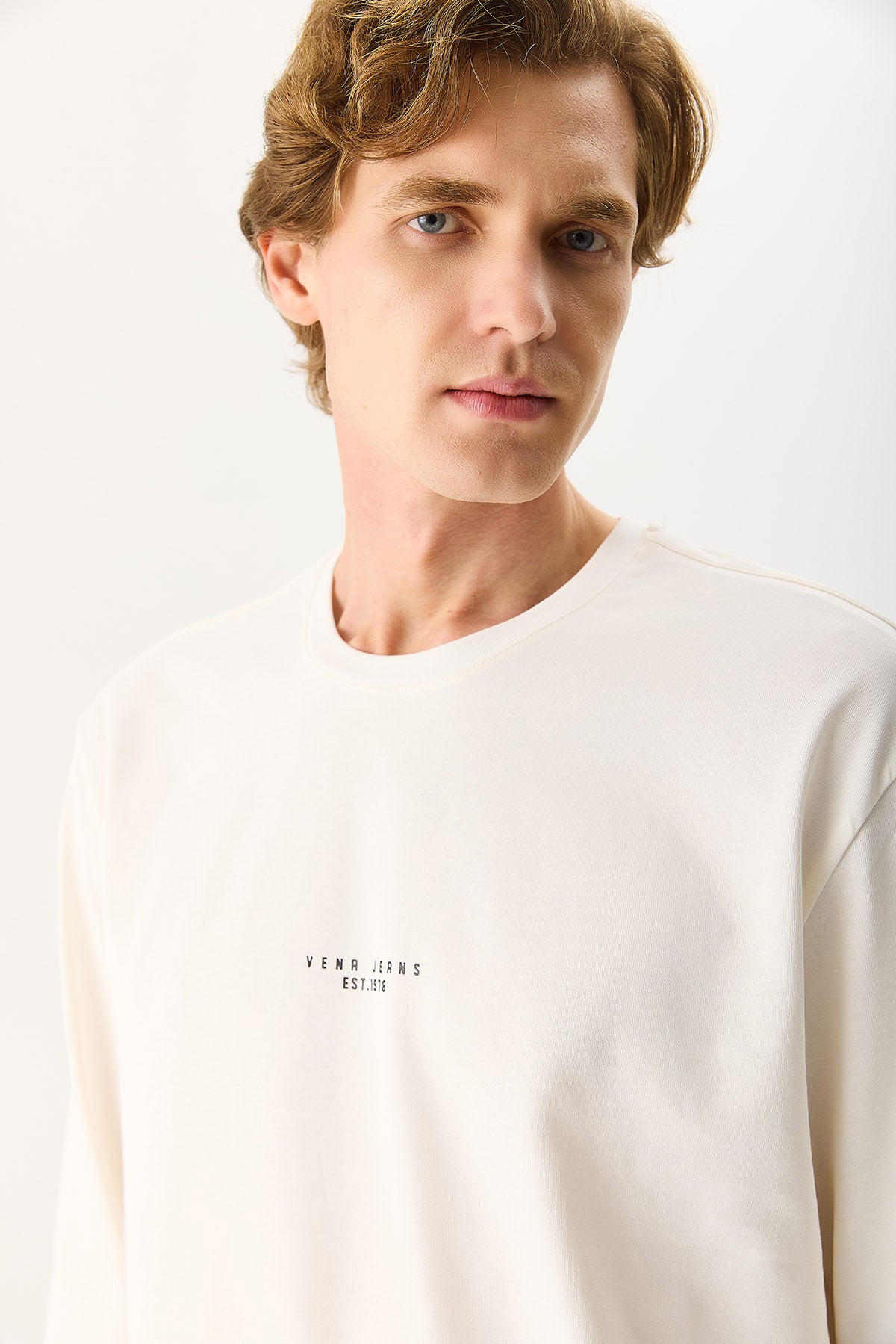 Erkek Brand Baskılı Bisiklet Yaka Regular Fit Tişört %100 Pamuk - Fildişi