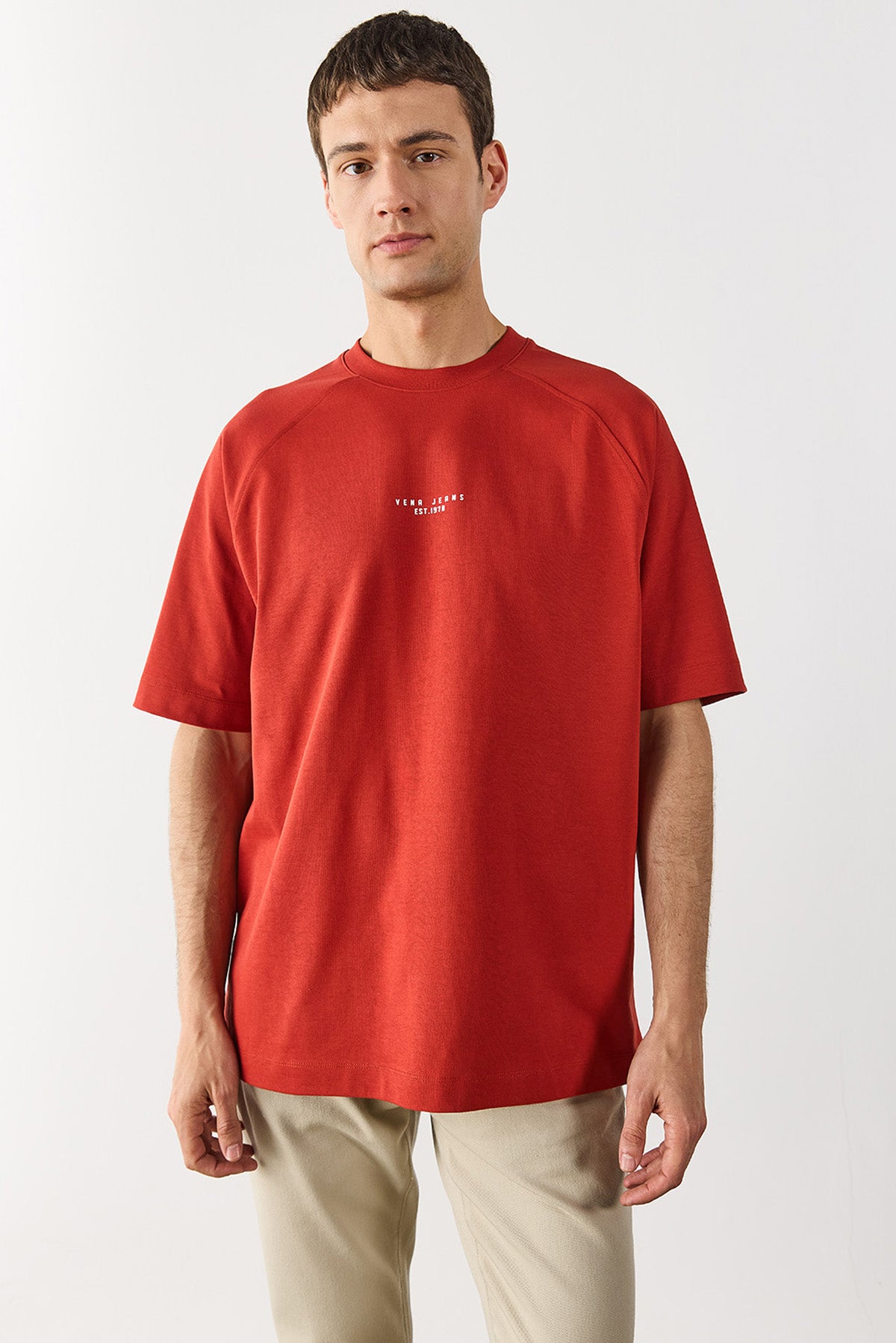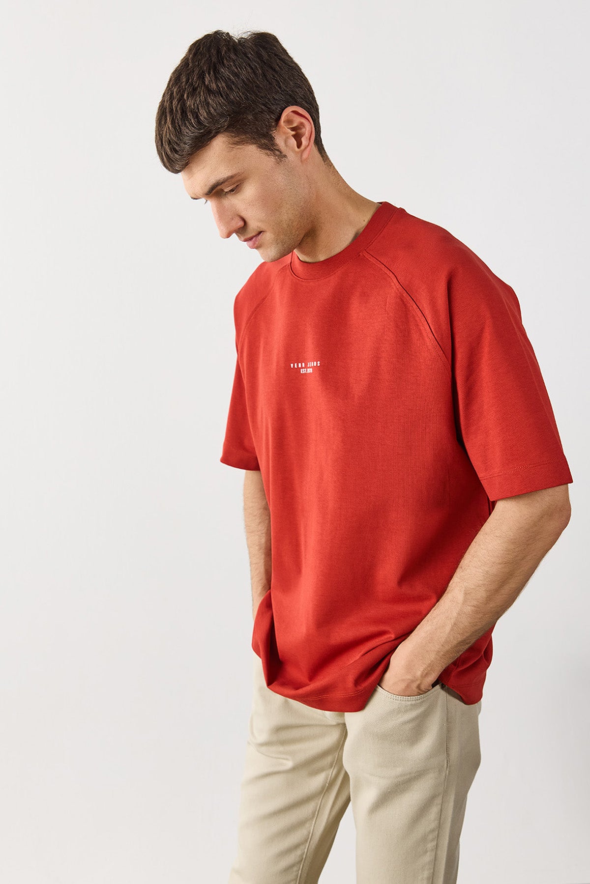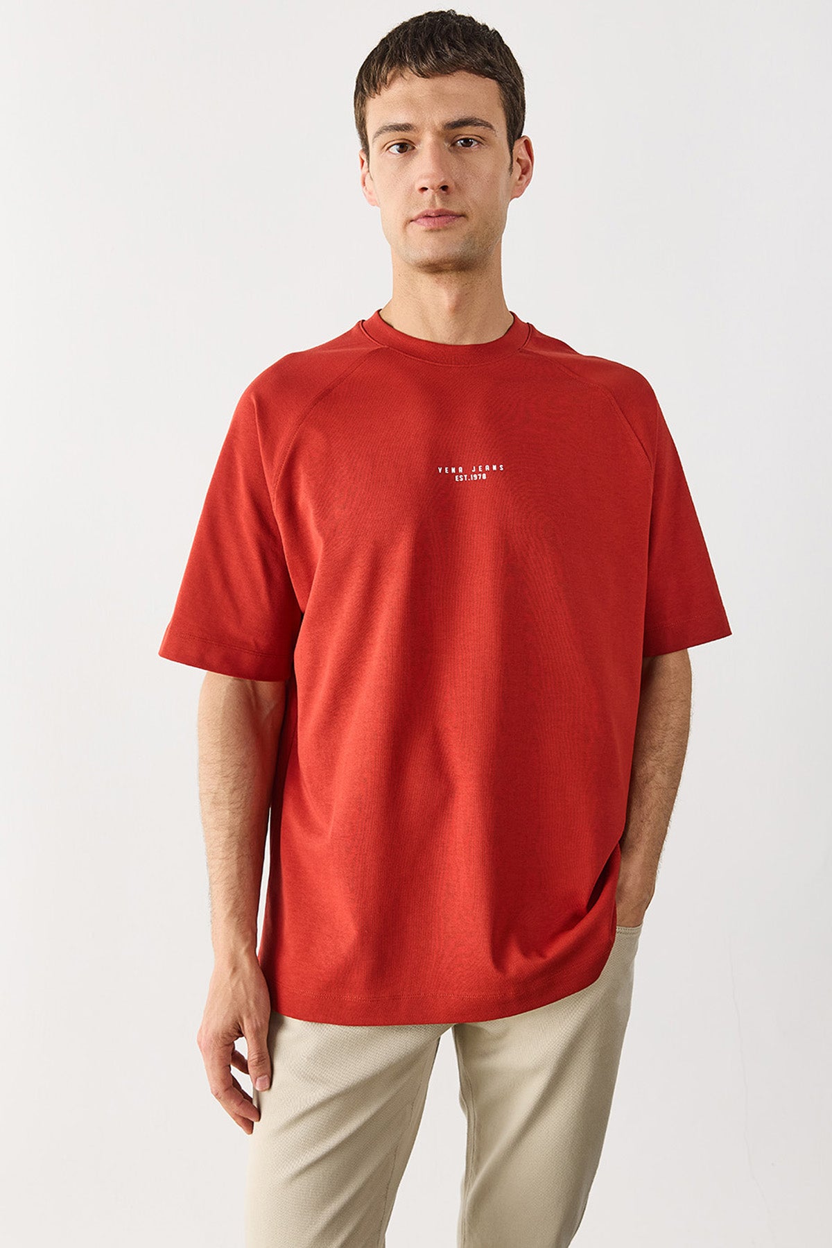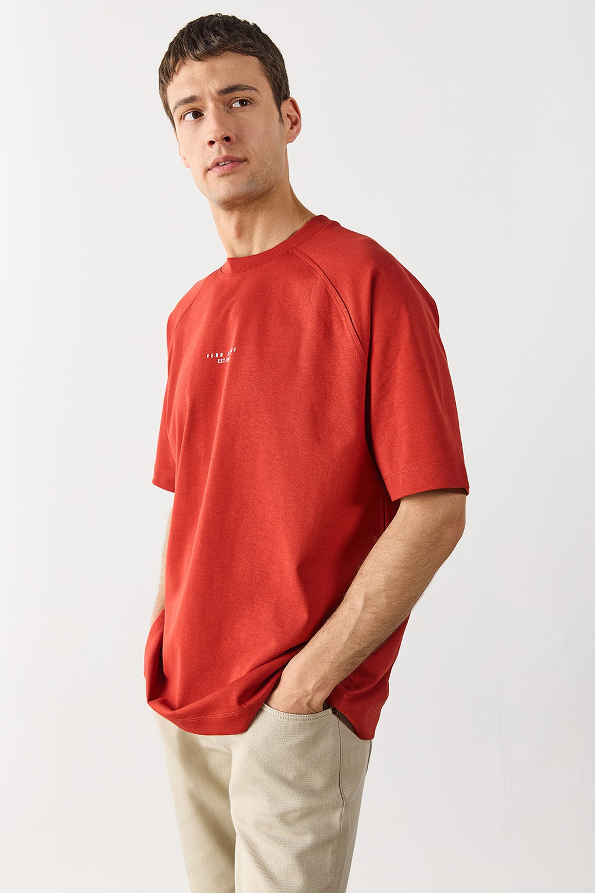 Erkek Brand Baskılı Bisiklet Yaka Regular Fit Tişört %100 Pamuk - Kiremit