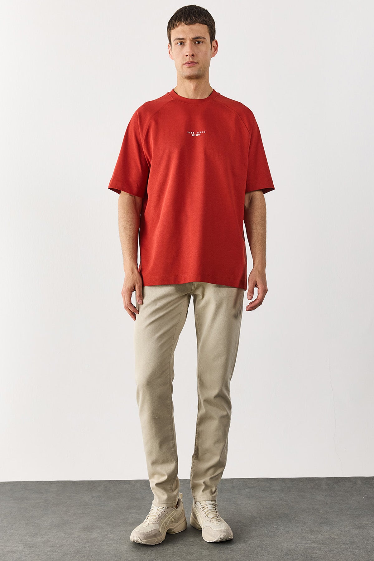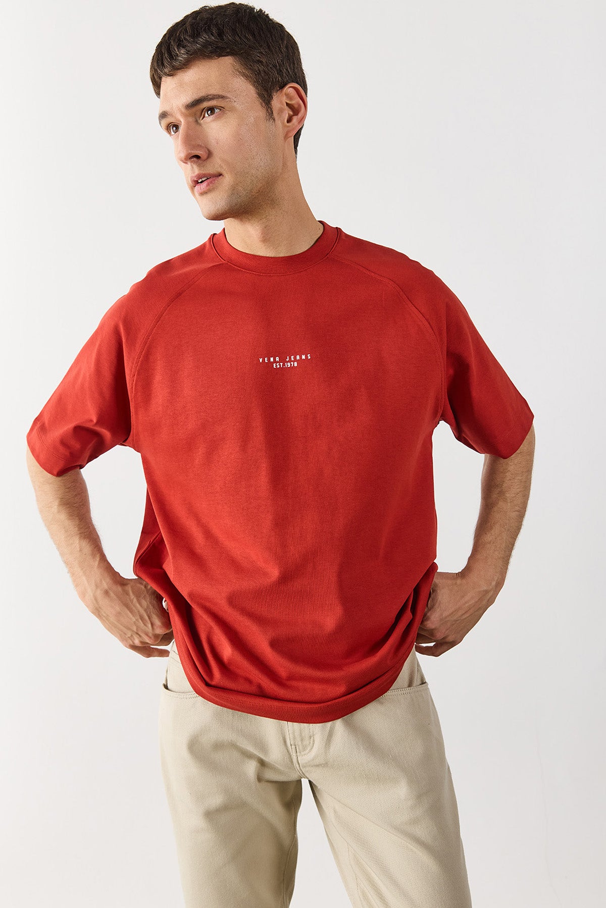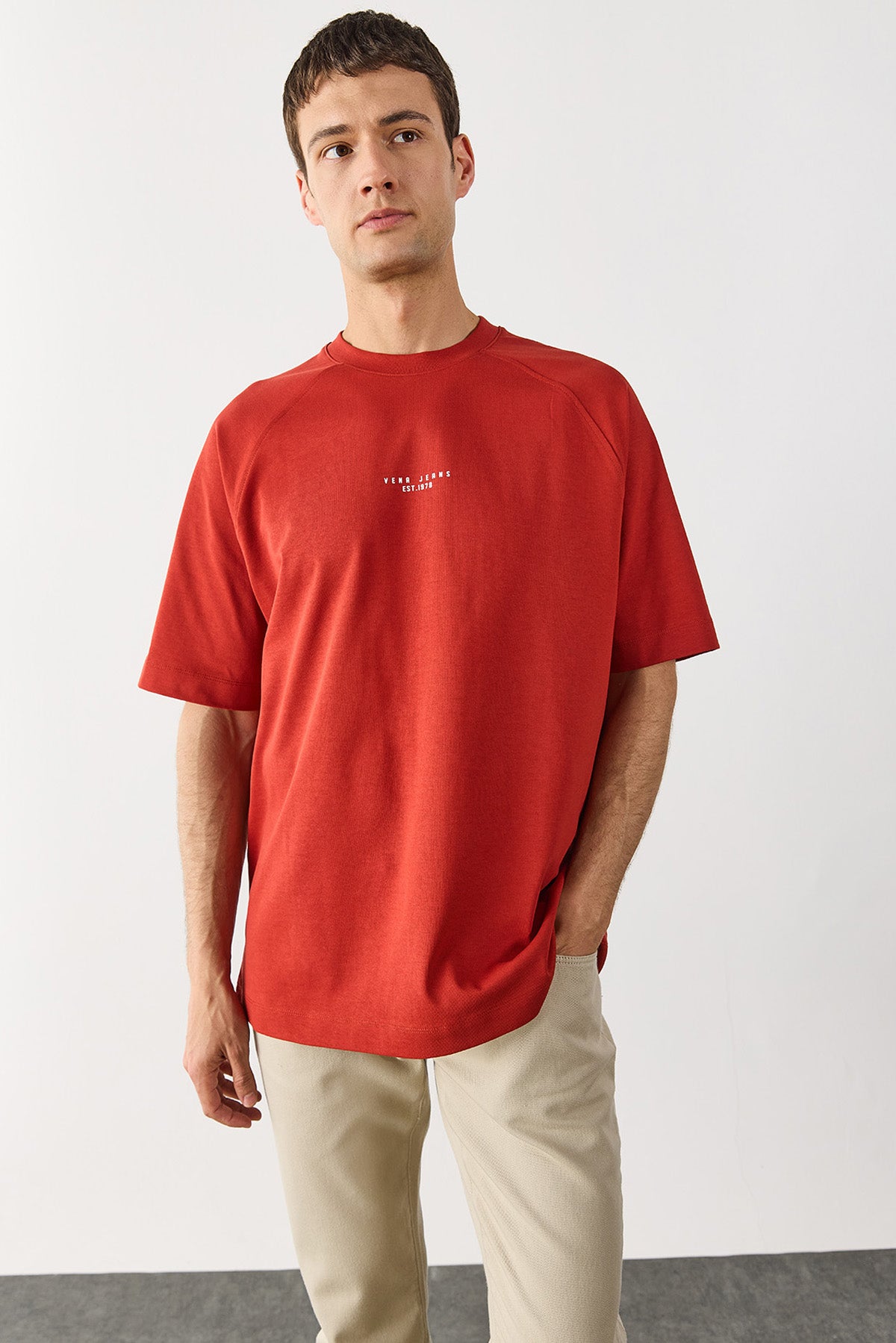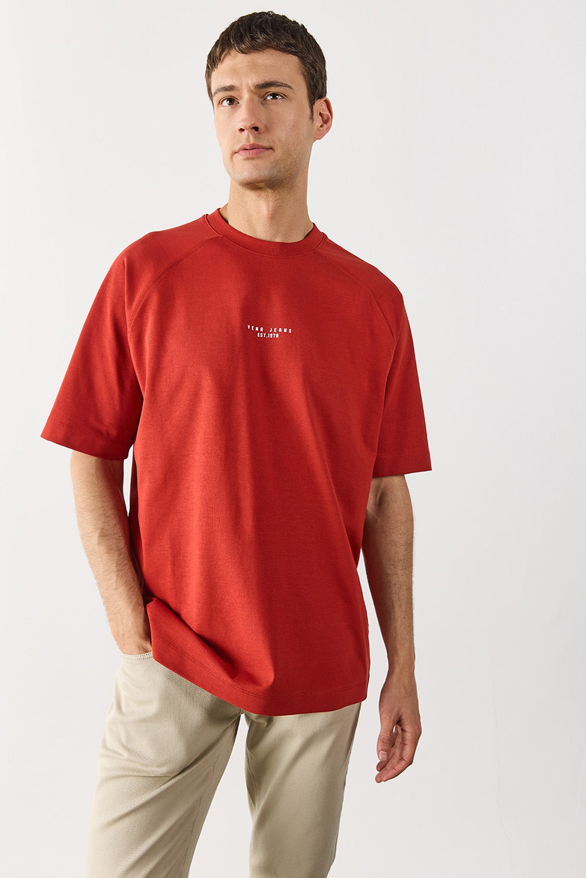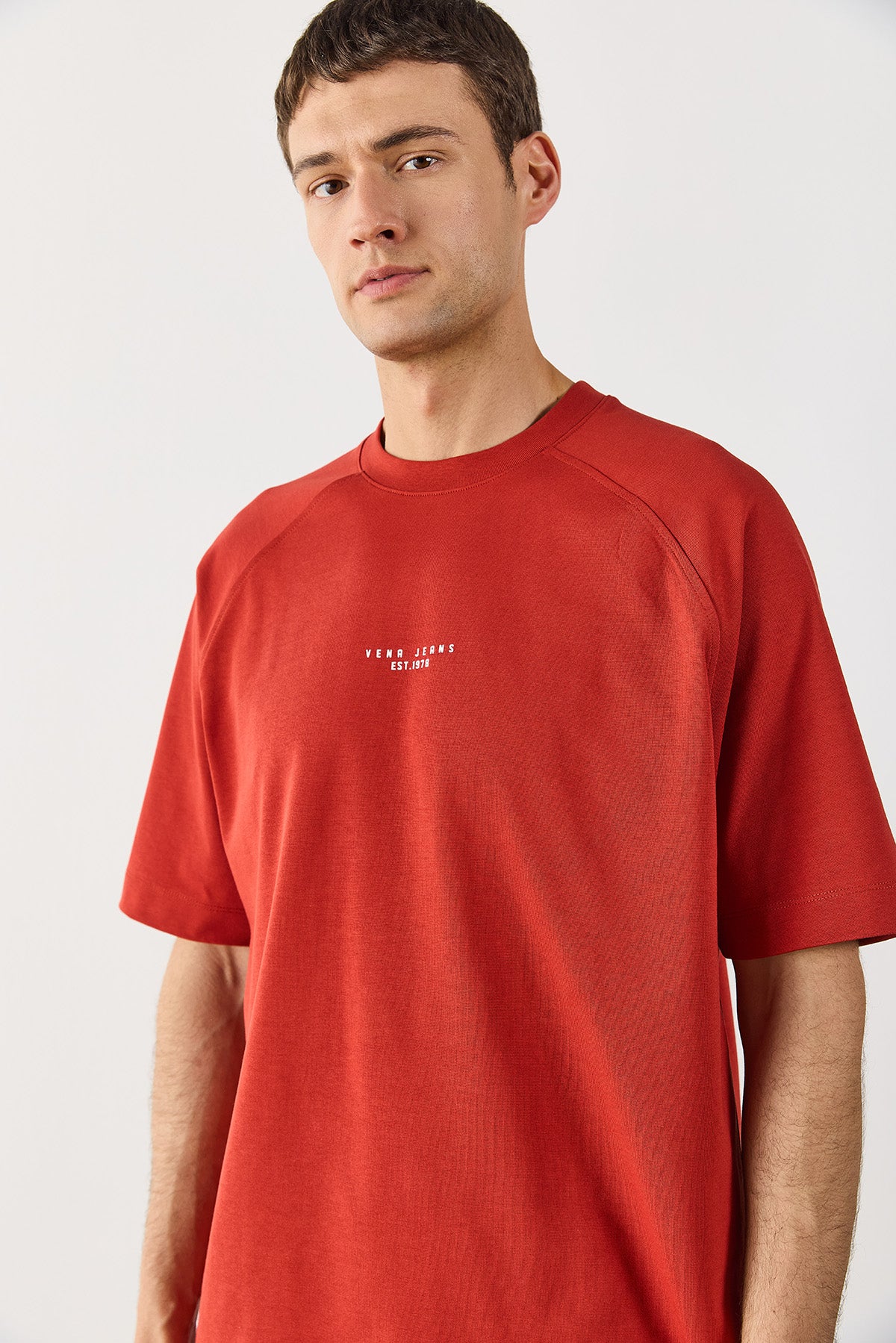 Erkek Brand Baskılı Bisiklet Yaka Regular Fit Tişört %100 Pamuk - Kiremit