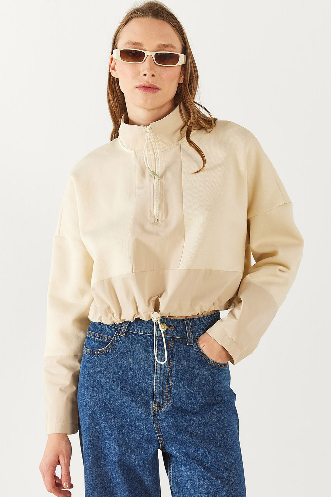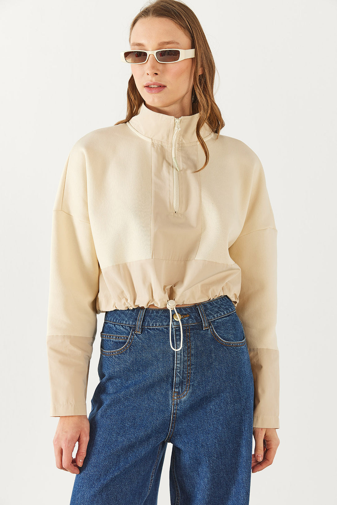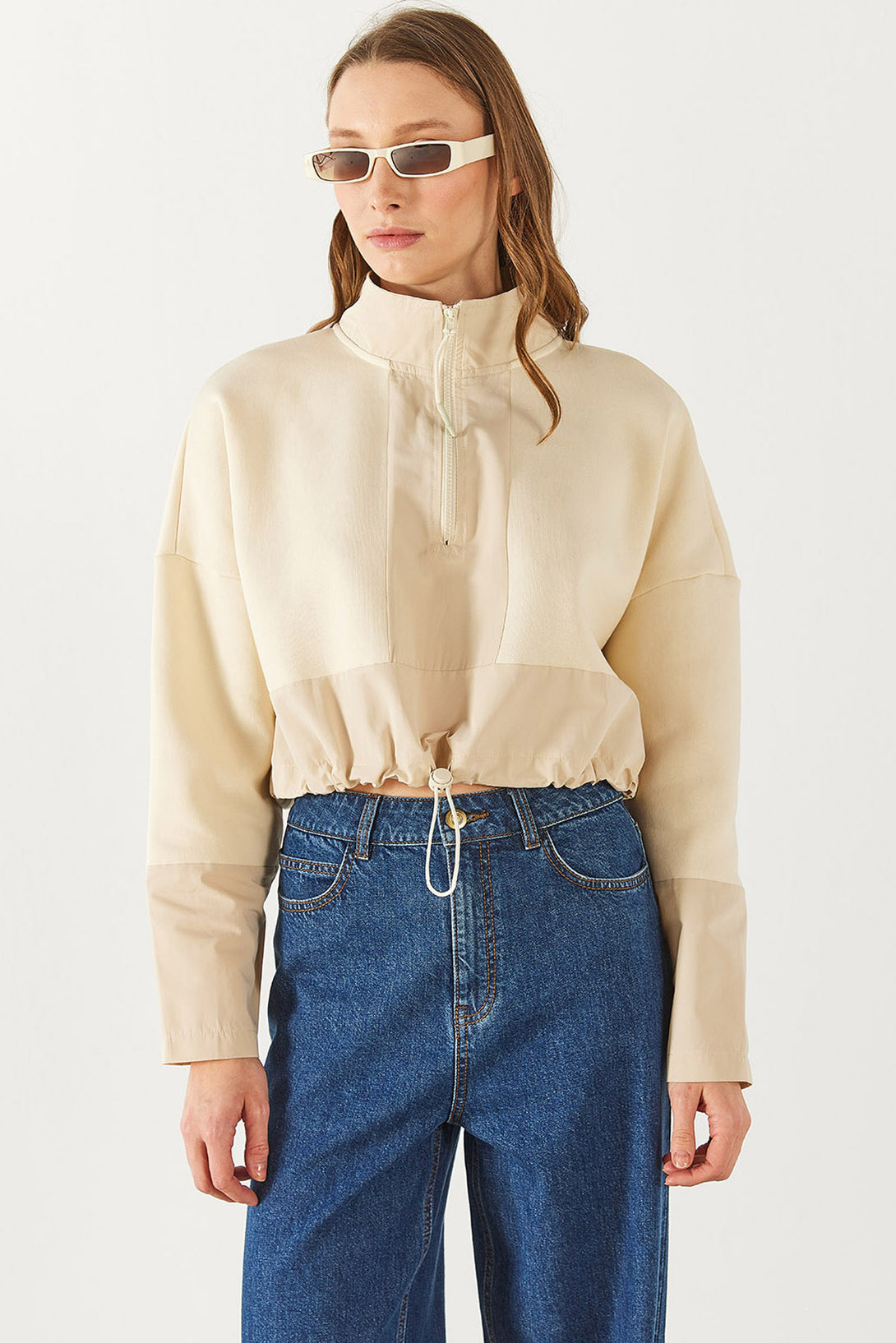 Brenna Dik Yaka Şardonlu Sweatshirt - KEMİK