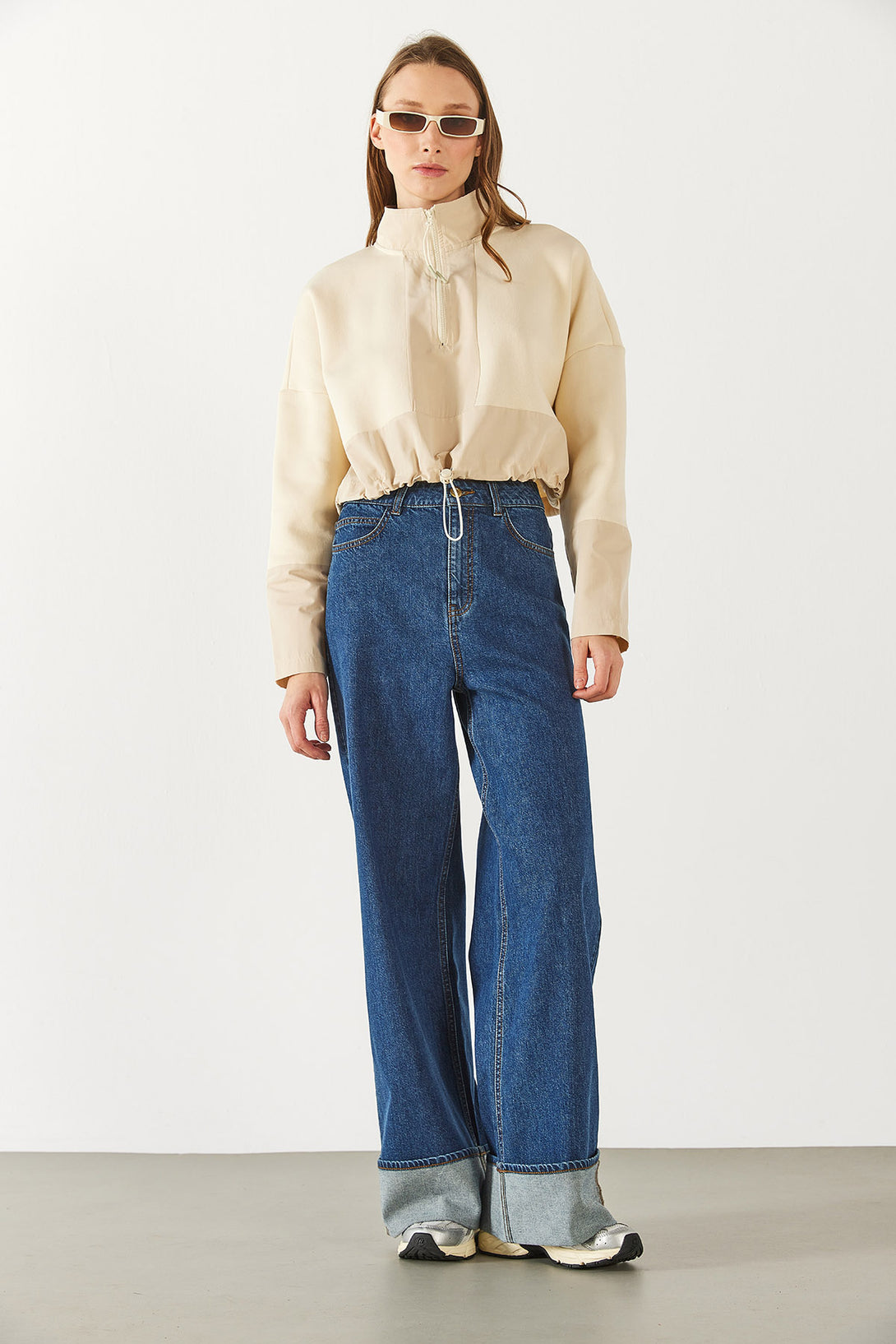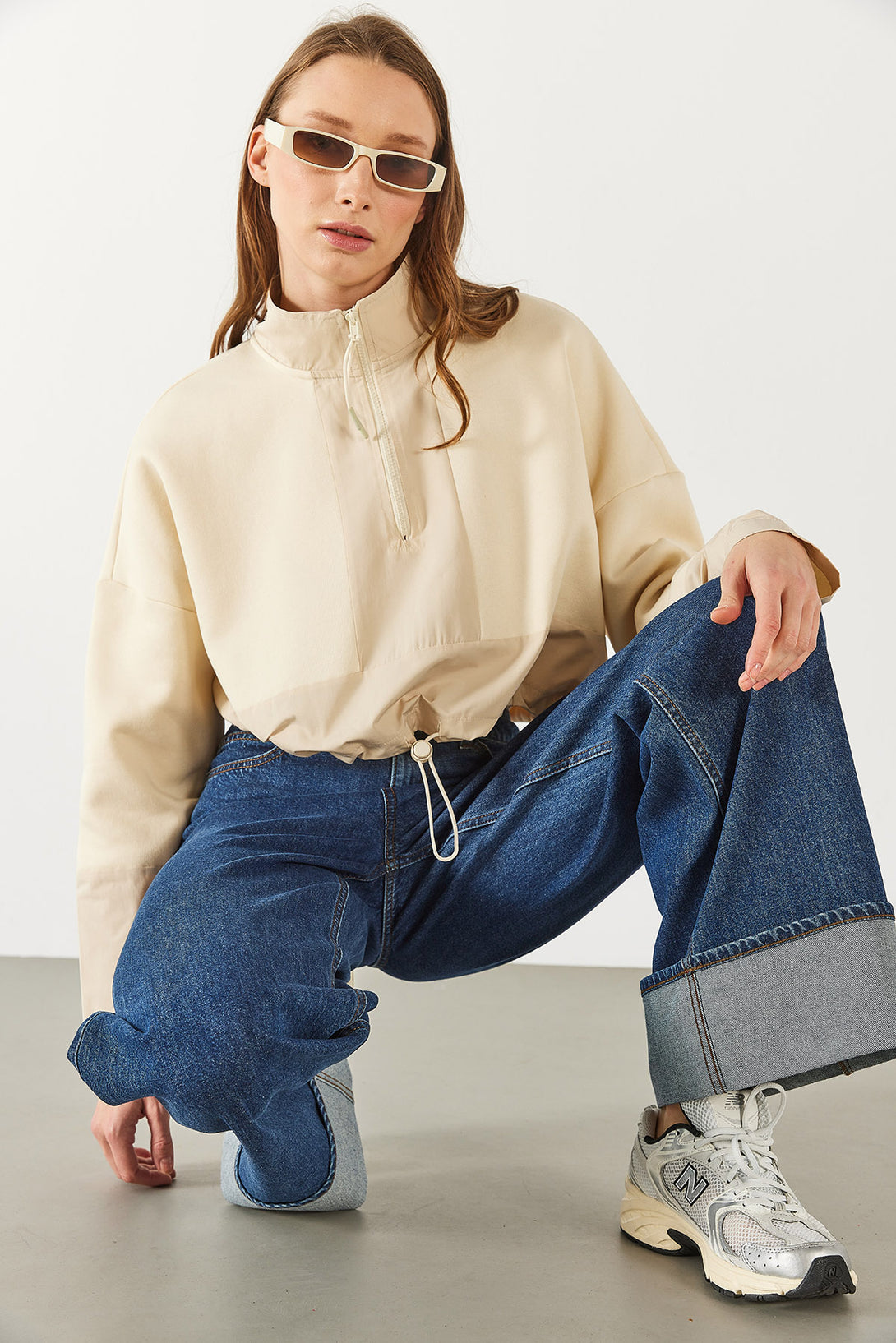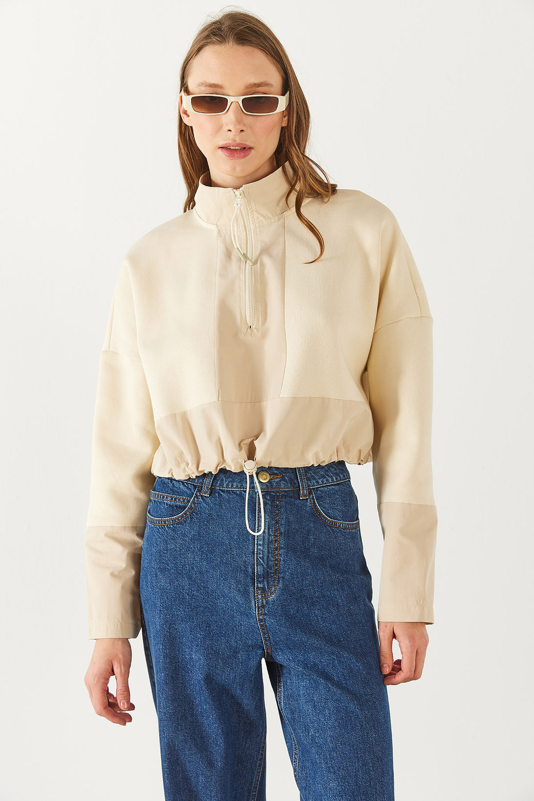 Brenna Dik Yaka Şardonlu Sweatshirt - KEMİK
