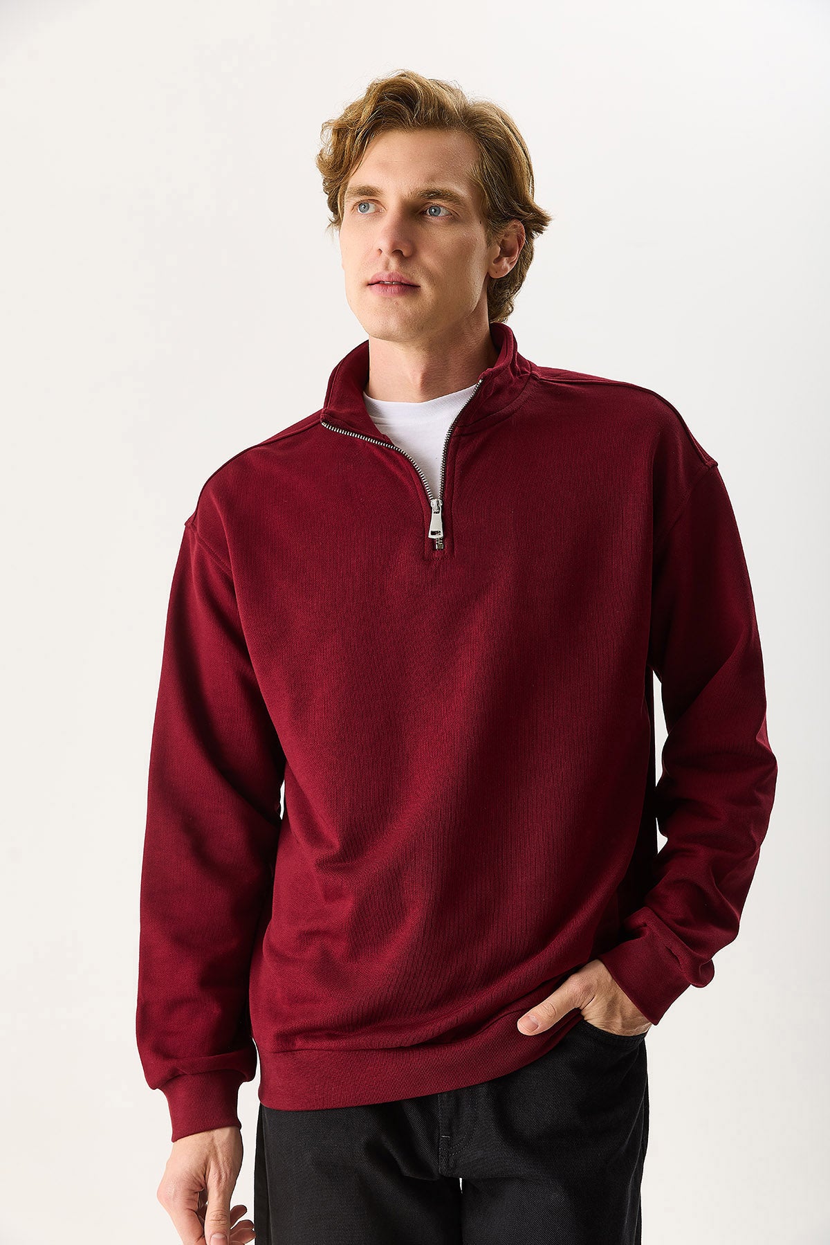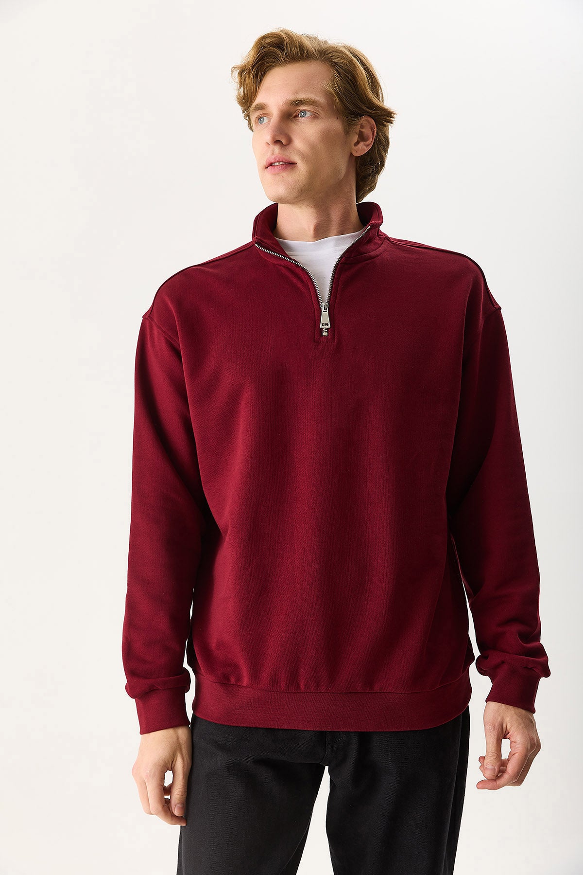 Erkek Bruce Dik Yaka Yarım Fermuarlı Sweatshirt %100 Pamuk - Bordo